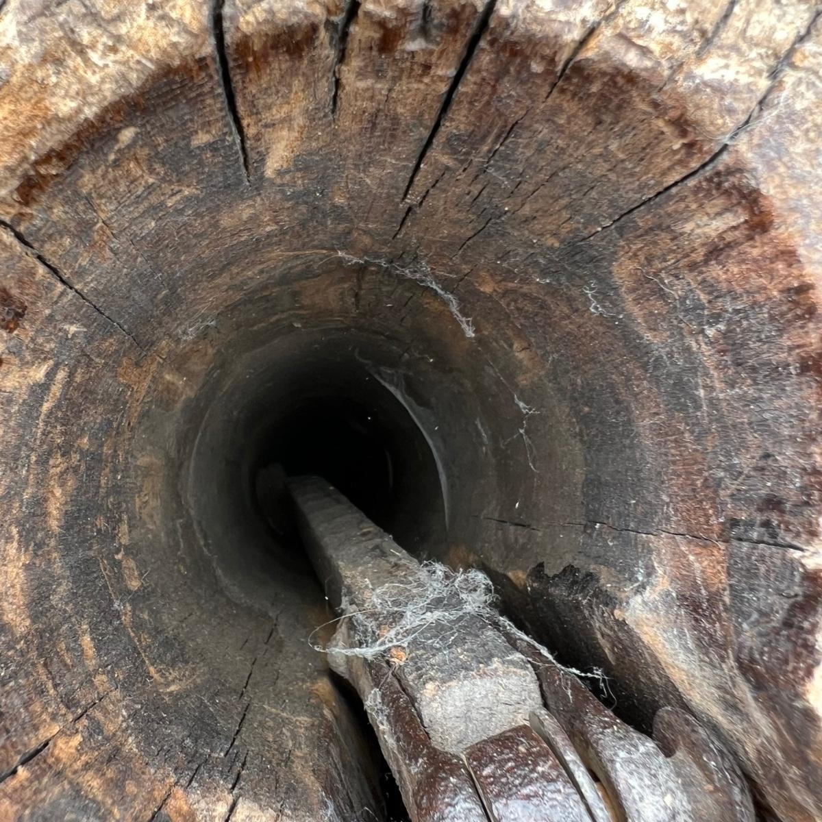 This old hand pump is a beautiful aged wood, possibly oak with a metal tap and metal mechanisms inside. It appears to be antique but we cannot verify its age.