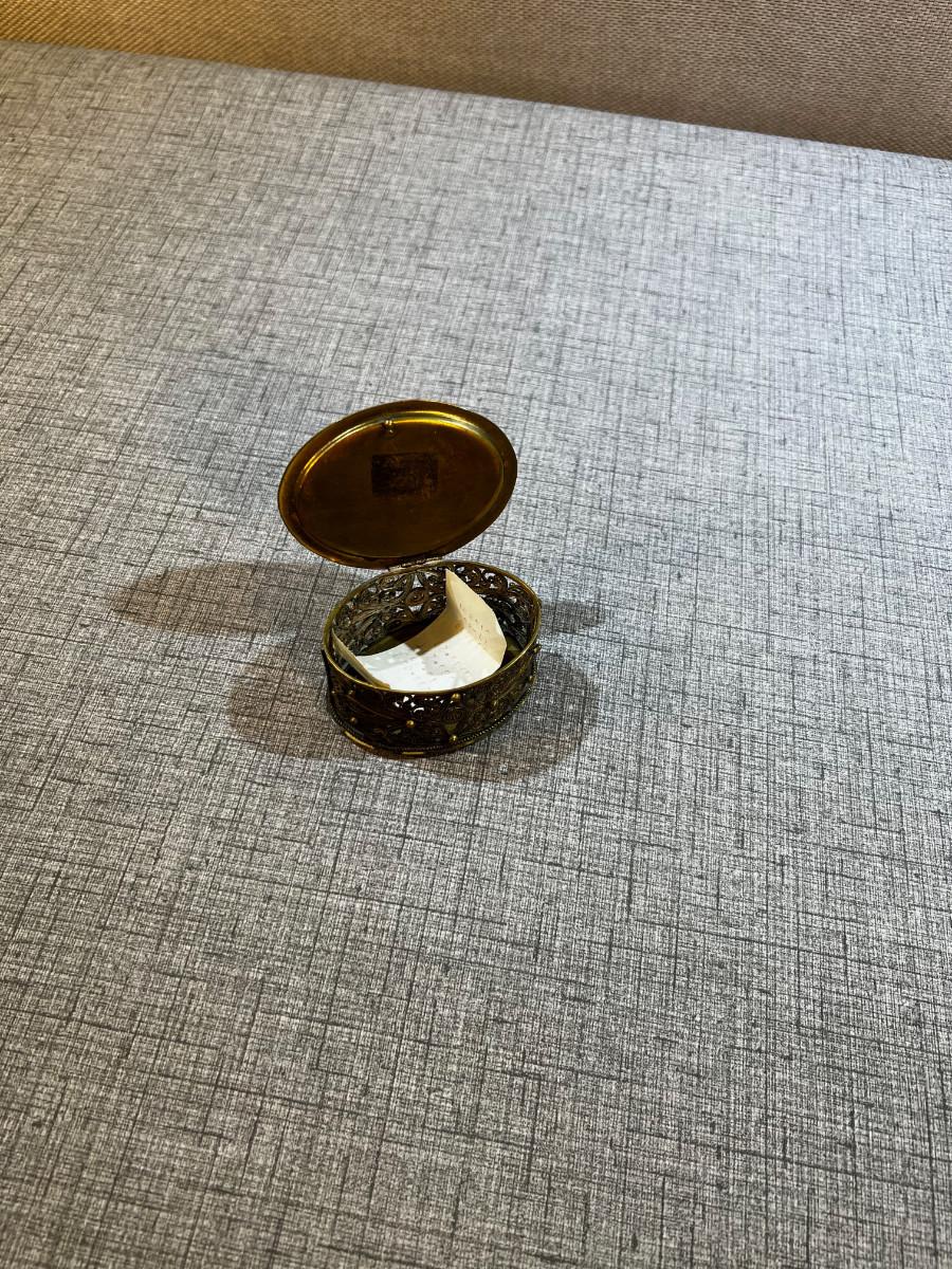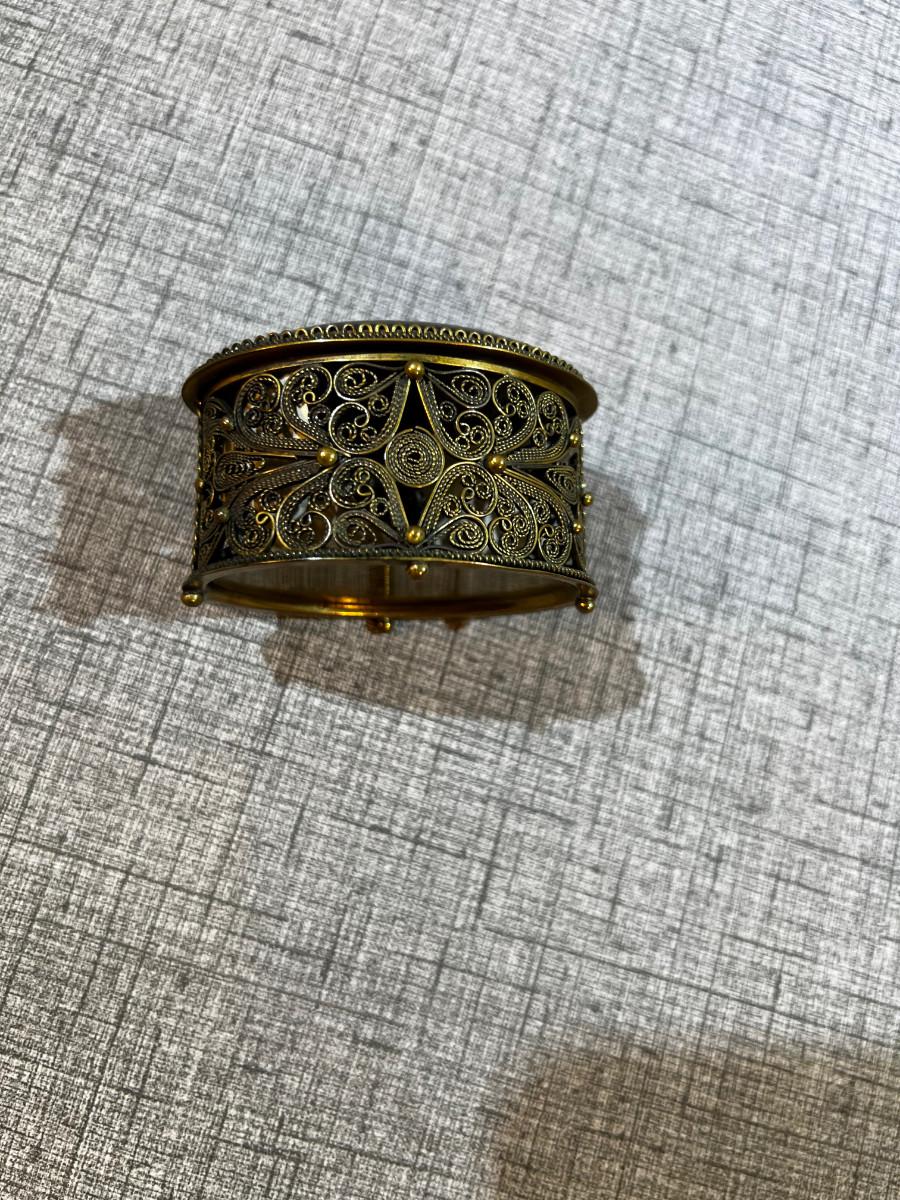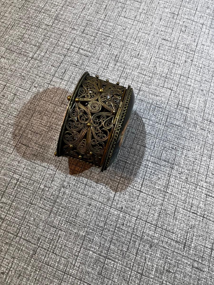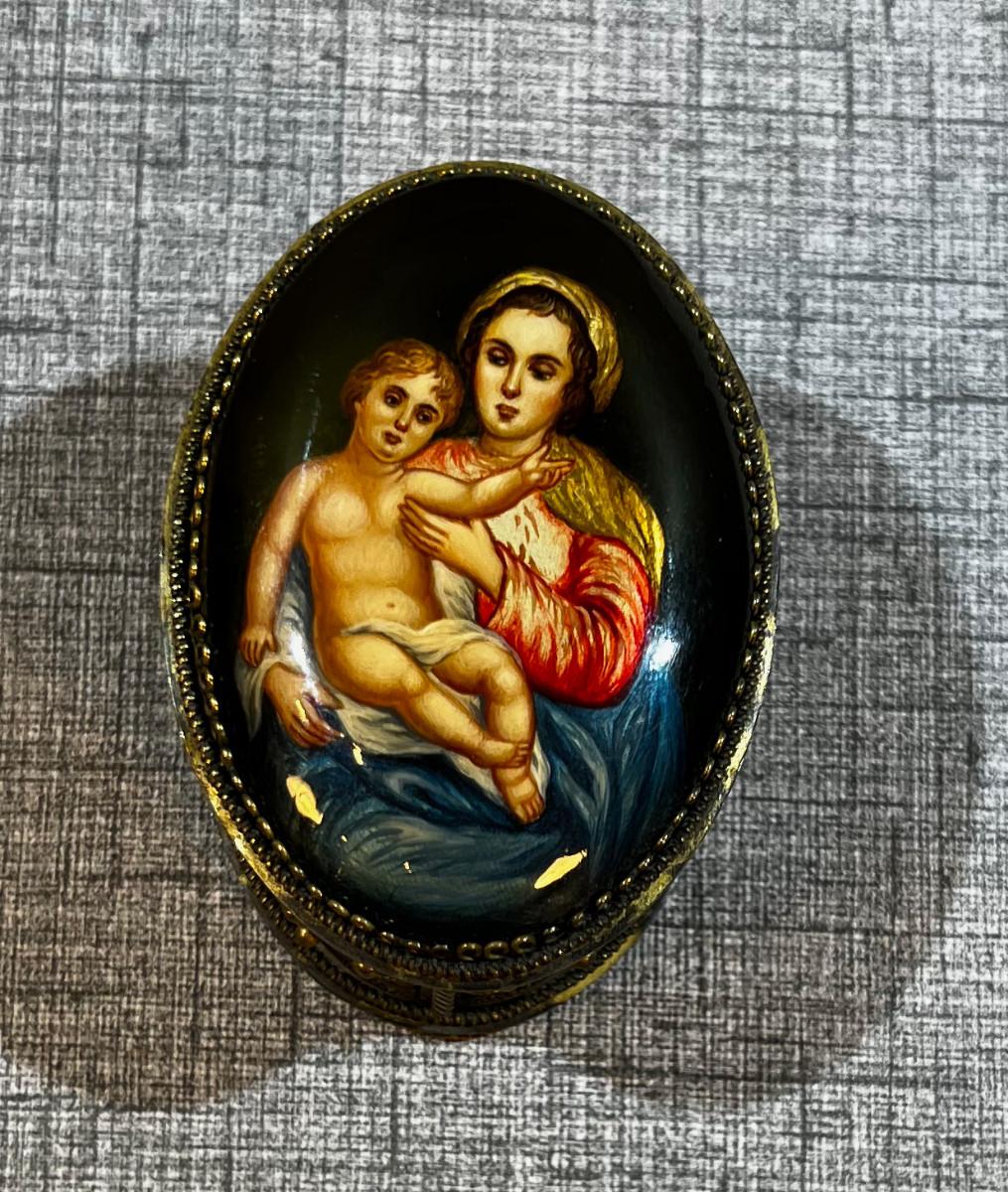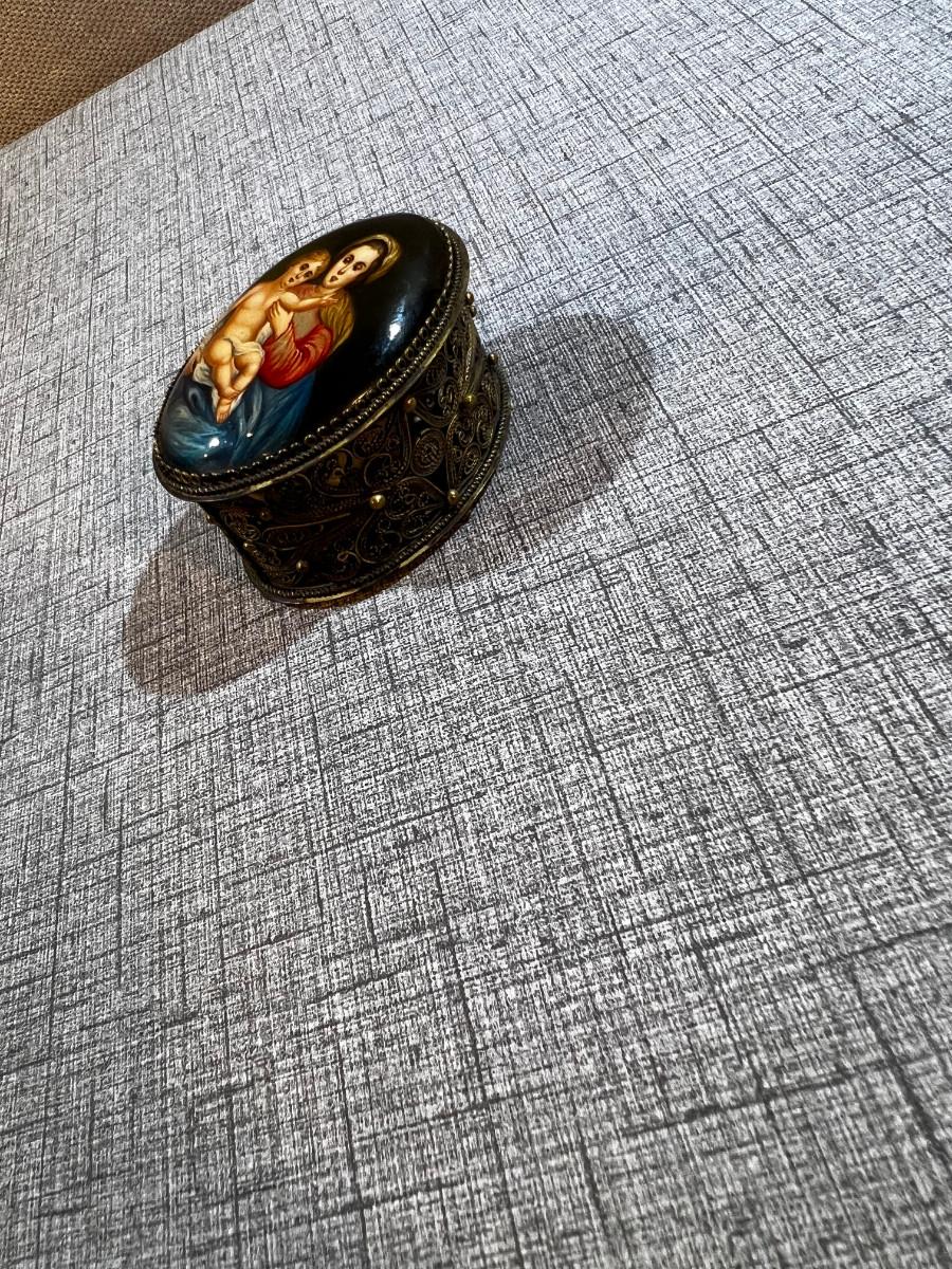Antique Filigree Hand Painted Enamel Top Box of Madonna and Child