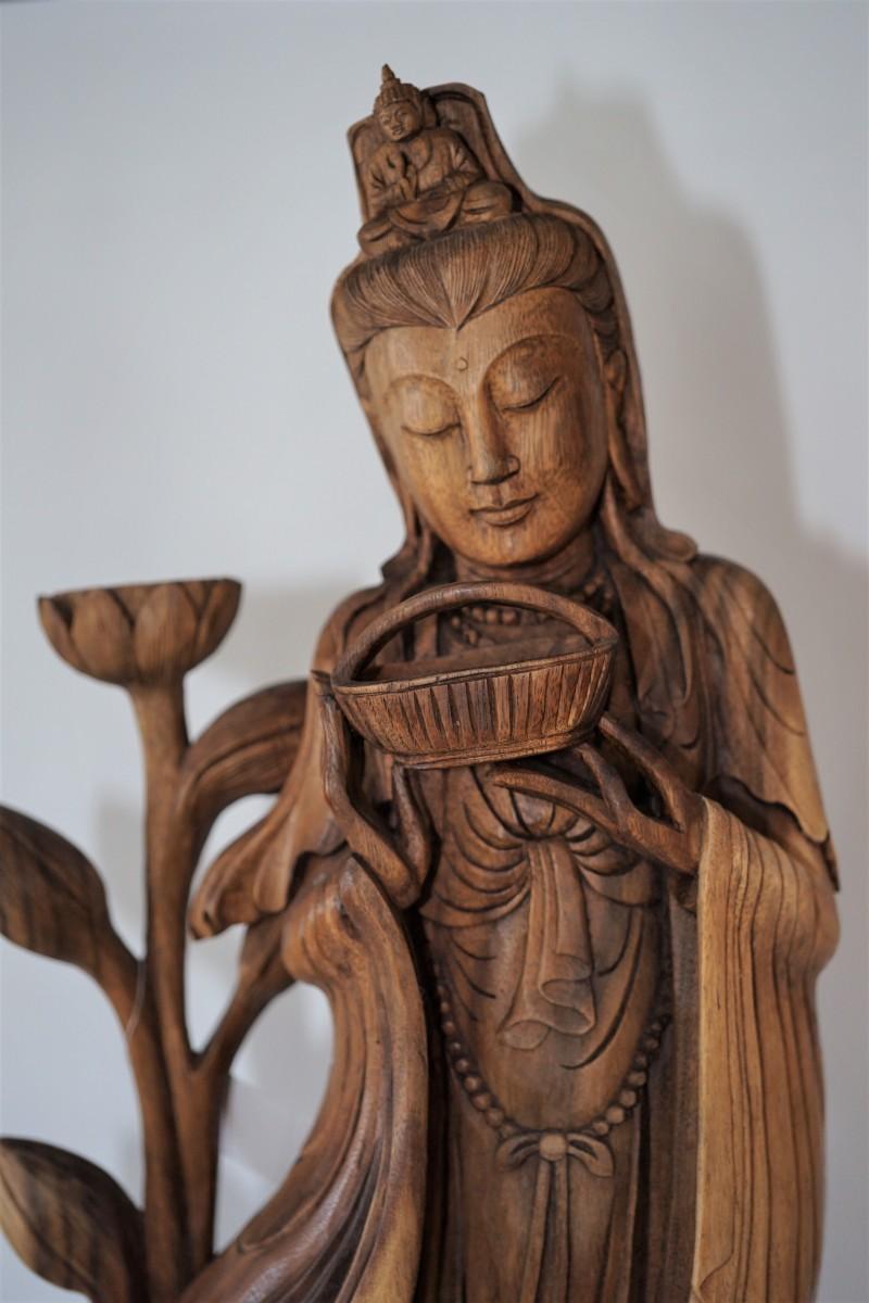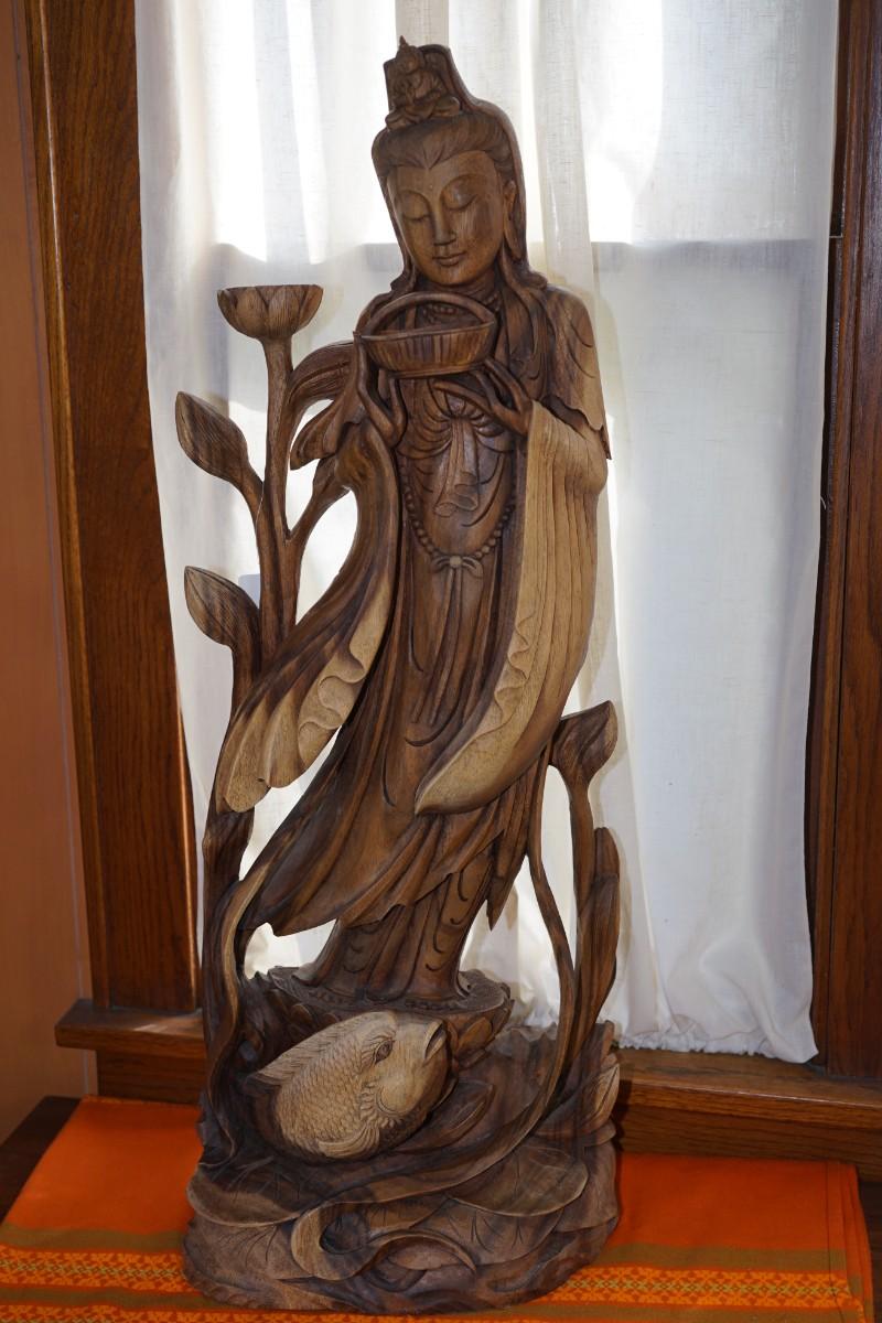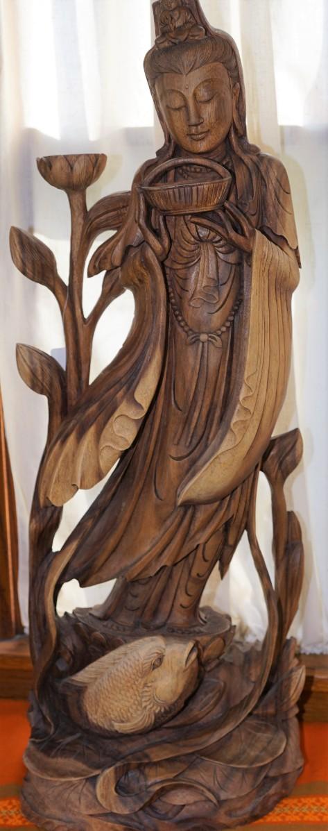 artistically carved Kannon Bodhisattva wooden statue .
