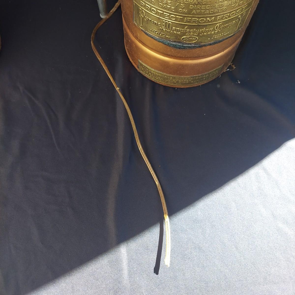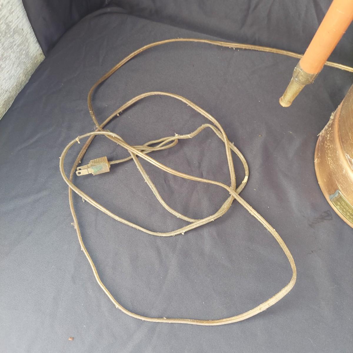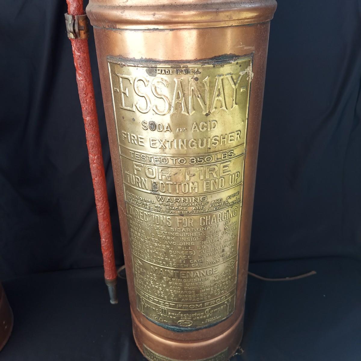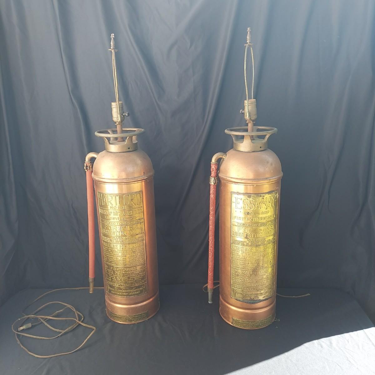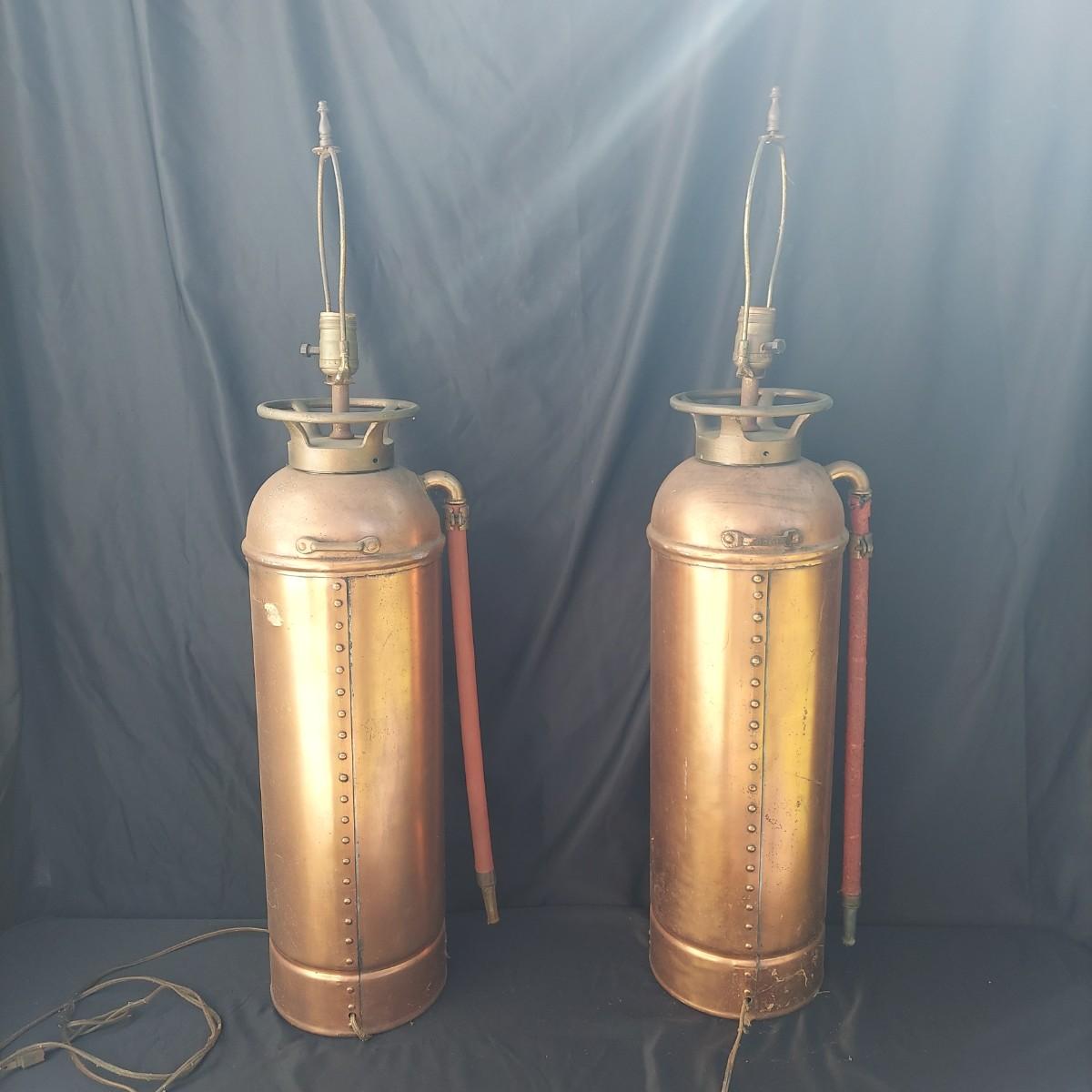 Two large lamps made from antique fire extinguishers. They appear to be copper and brass tanks. The bottom diameter is 7" with a 34" height including the finial. One cord is cut. They will likely need to be re-wired. Local Pickup Only.