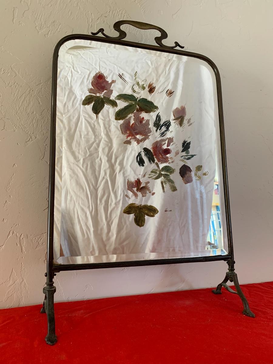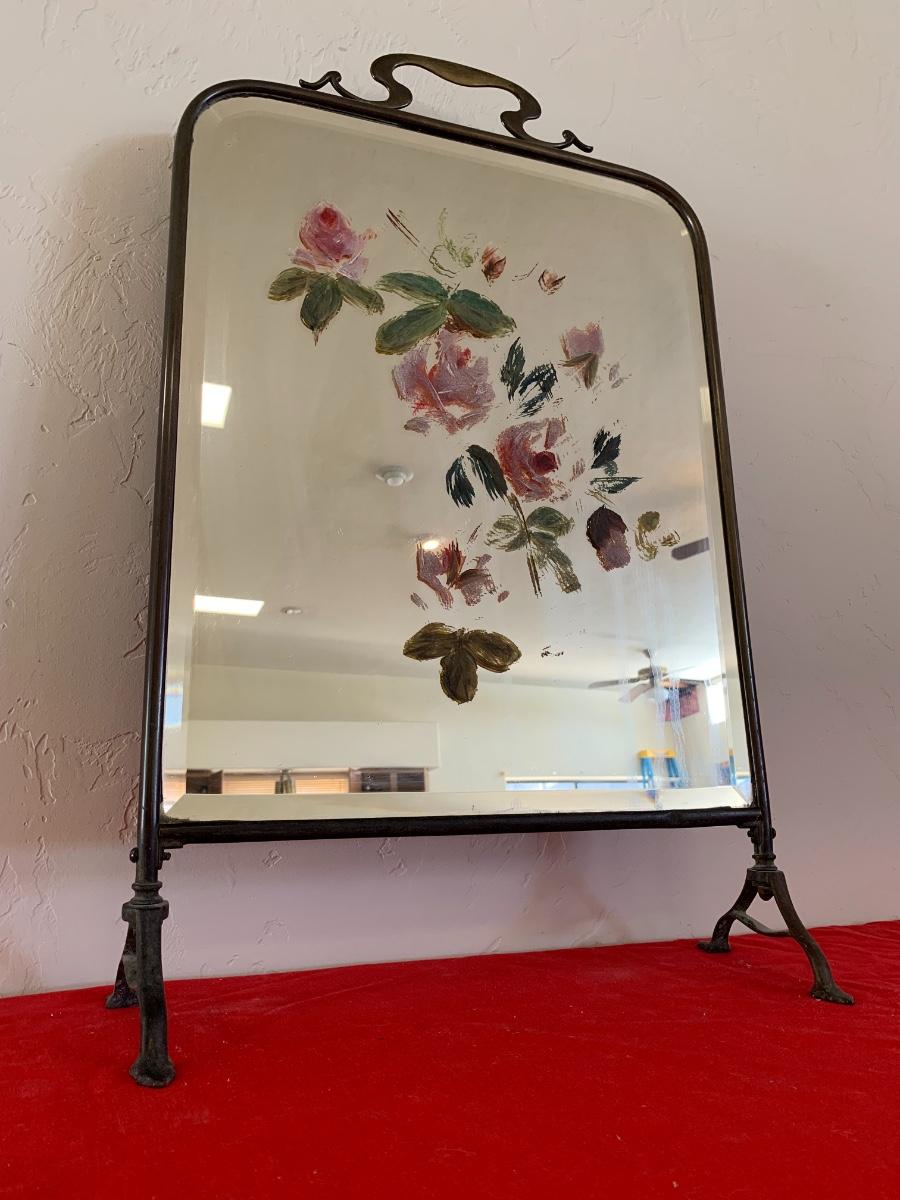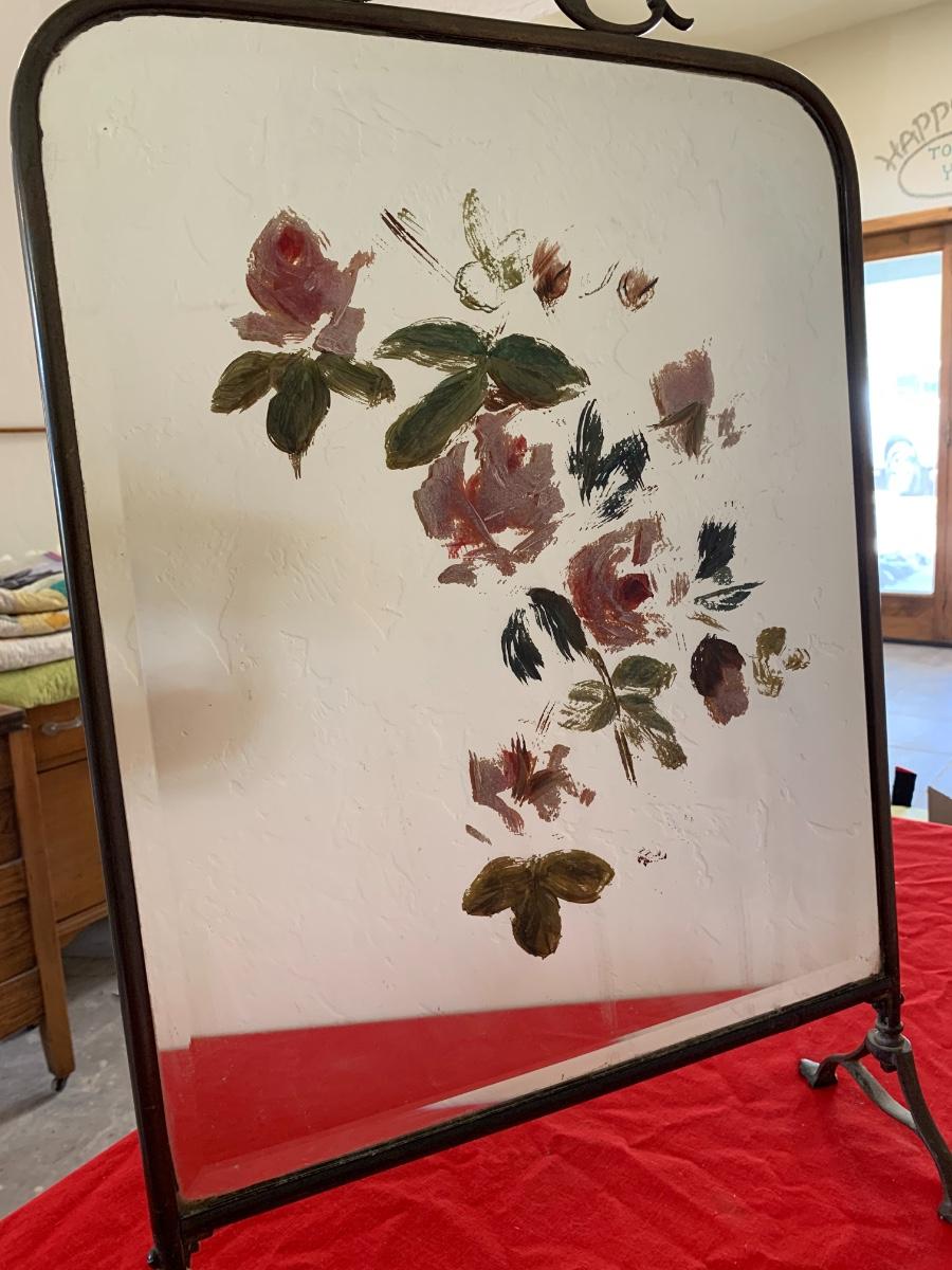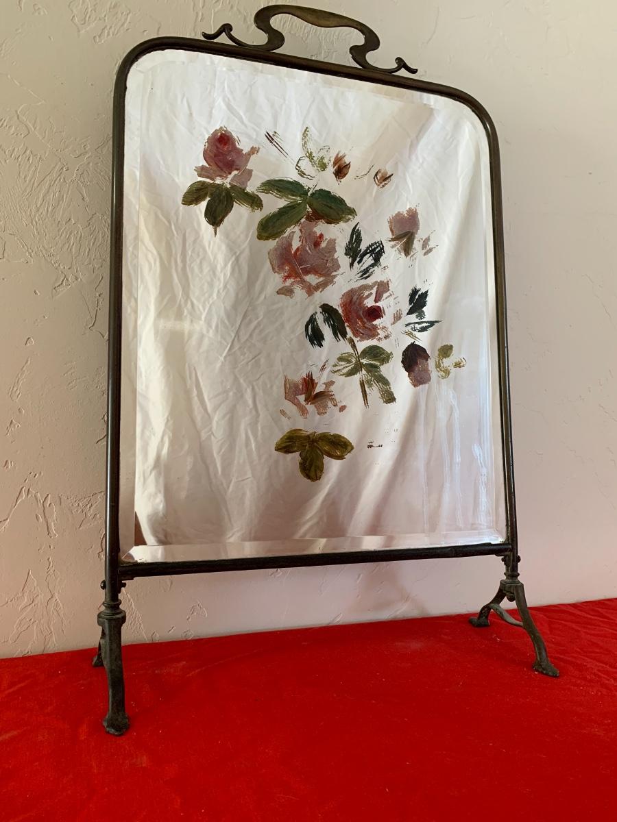 One antique mirrored iron fireplace screen with hand painted roses in good condition with one of the wells on the handle has separated and one of the screws on the base needs to be tightened. A gorgeous ornate piece! (17 1/2 inches X 28 inches)