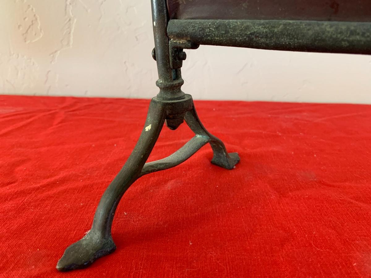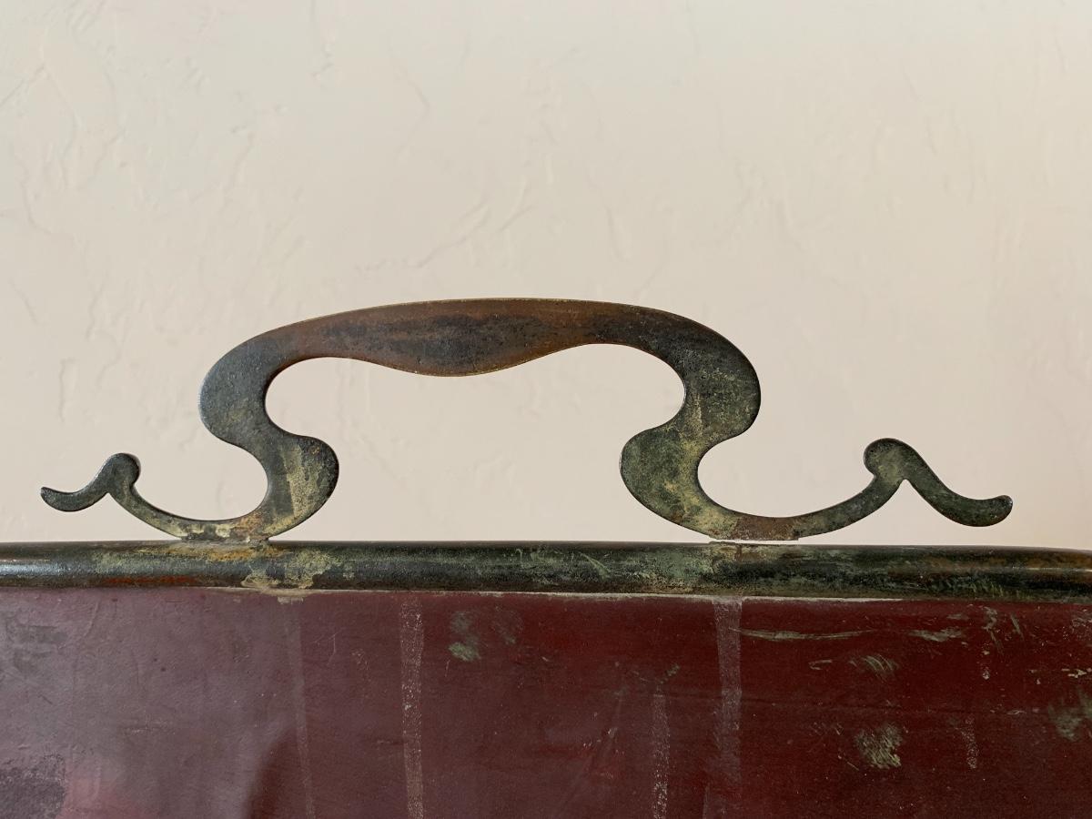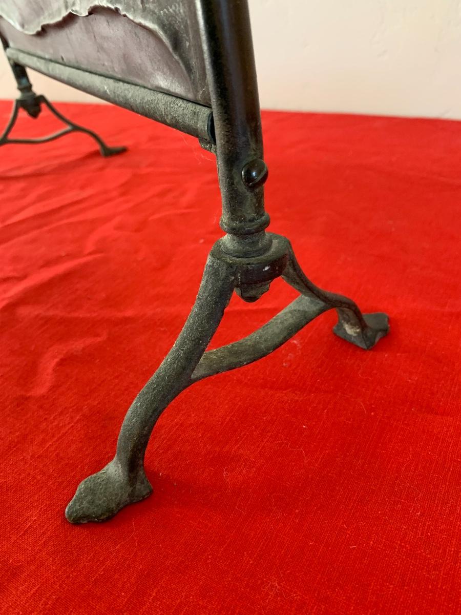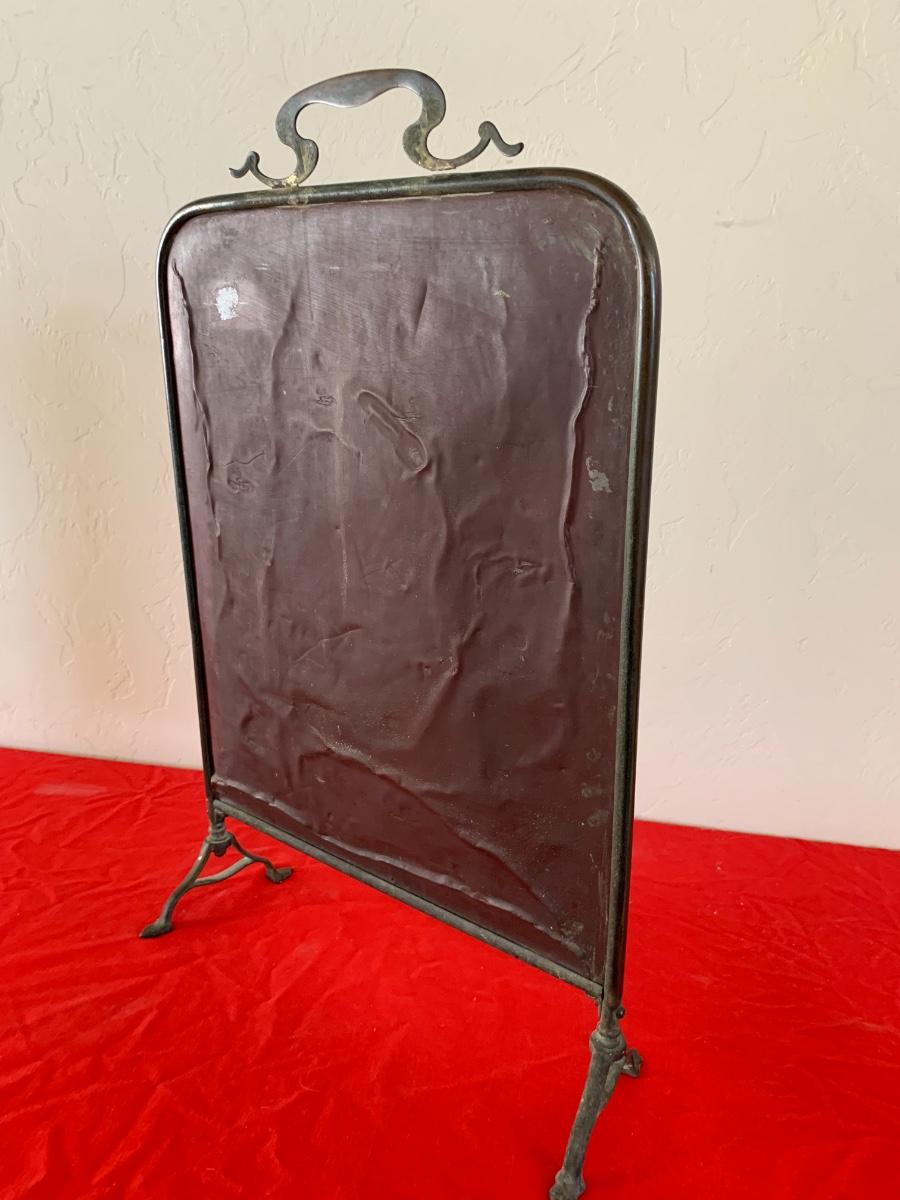One antique mirrored iron fireplace screen with hand painted roses in good condition with one of the wells on the handle has separated and one of the screws on the base needs to be tightened. A gorgeous ornate piece! (17 1/2 inches X 28 inches)