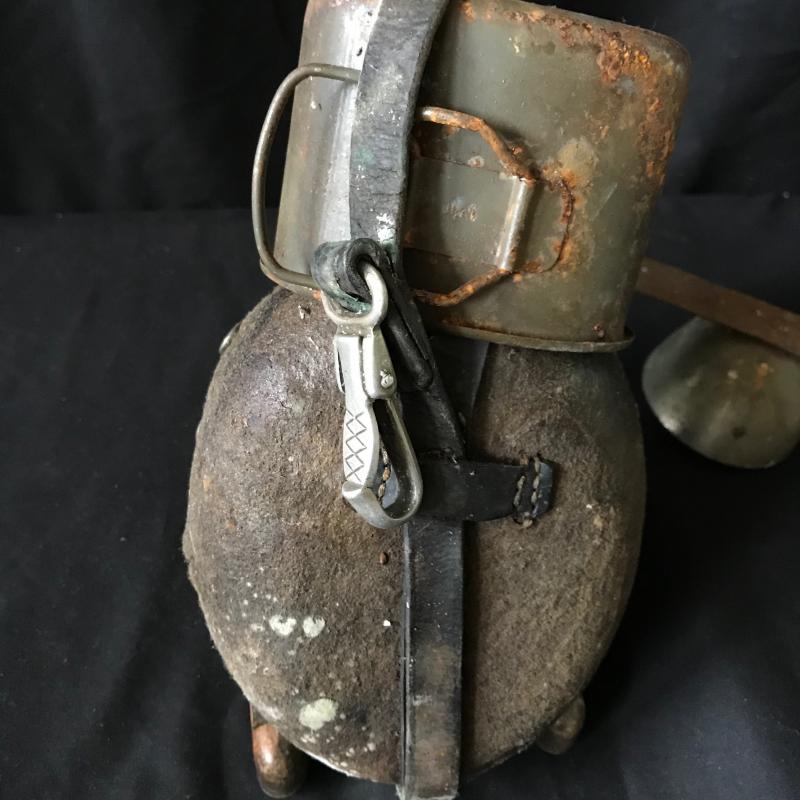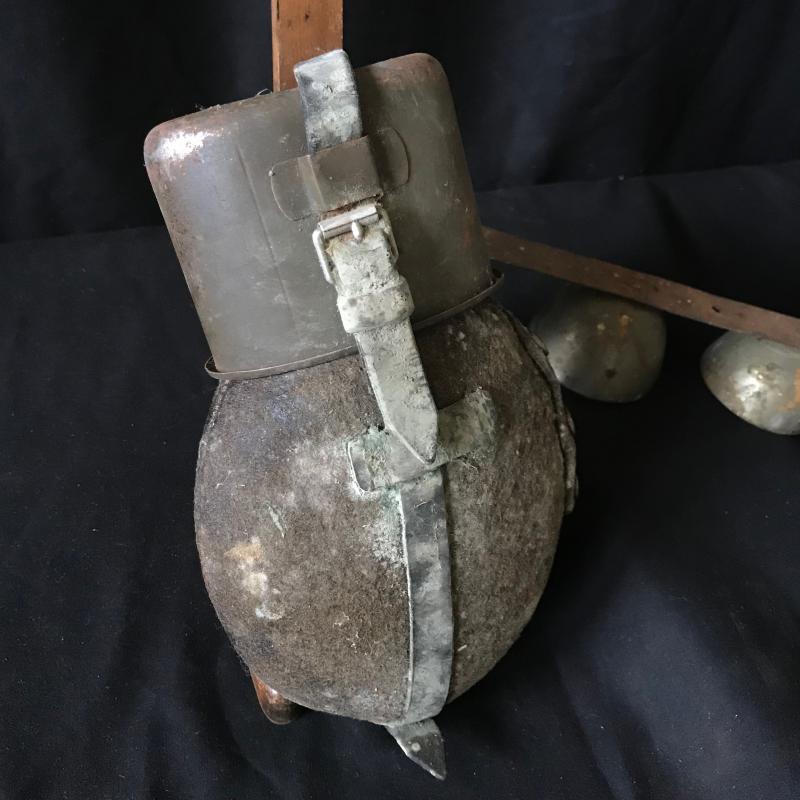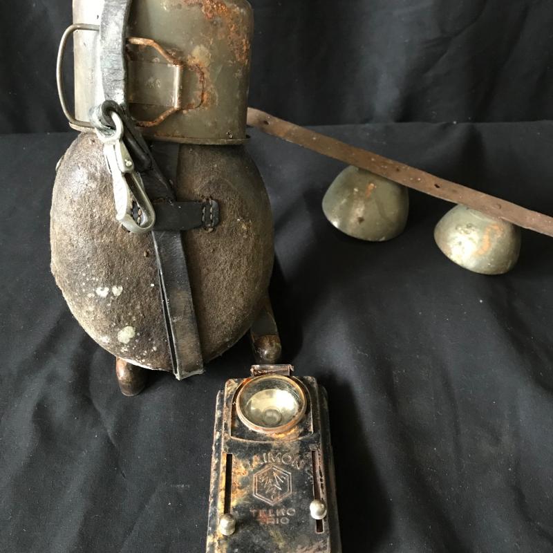 Lot includes antique metal flashlight, doorbell, and canteen. Canteen is approx. 9.5” long and has some surface mildew. No shipping available. Local pickup only in Hendersonville, NC.