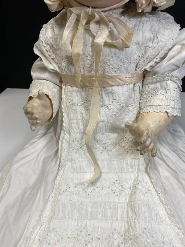 Antique 19" flirty eye Simon Halbig 126 doll. Bisque head with composition body. Squeaker (Mama) doll that cries when laid down, still makes noise but sounds old, worn. Blue glass eyes move side to side. Hair has been glued down. Mouth is open, has teeth and tongue trembles slightly. Body has been repainted possibly and the hands have faded oddly. Wearing an extra long christening gown. There is some spots and yellowing to the gown. The body looks like it was cut in half. Upon looking online I found another SH 126 doll that was the same. Believe it was done to make or fix these dolls that cry "mama", there is a mesh covered hole in the back. Face looks great. Doll has been on display and is a little dusty, smudgy.