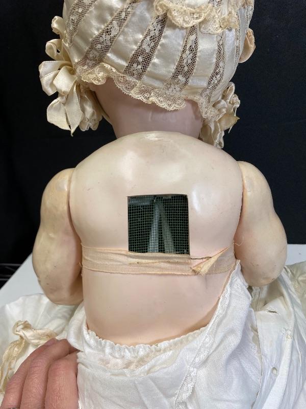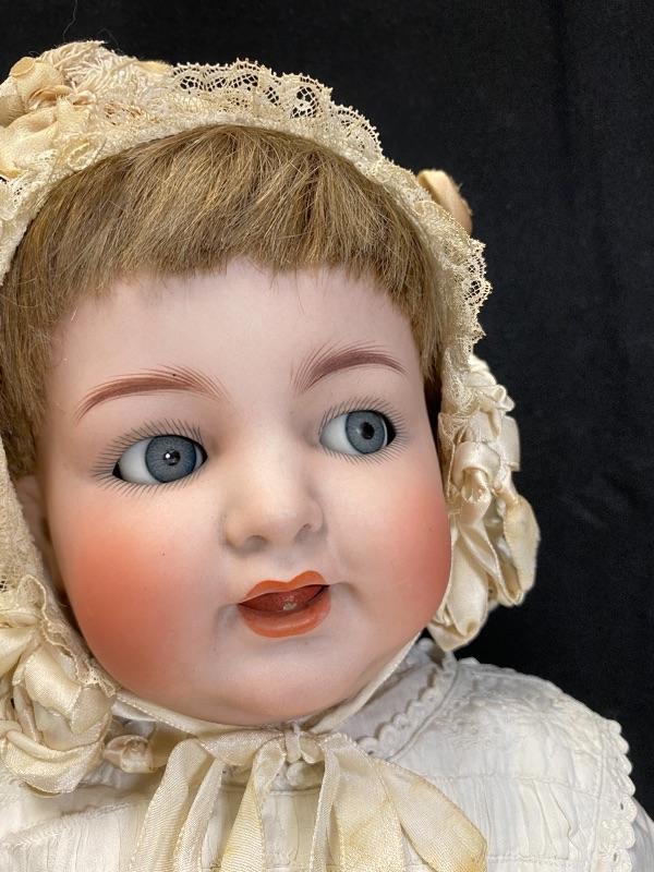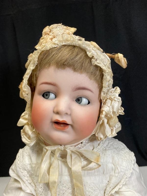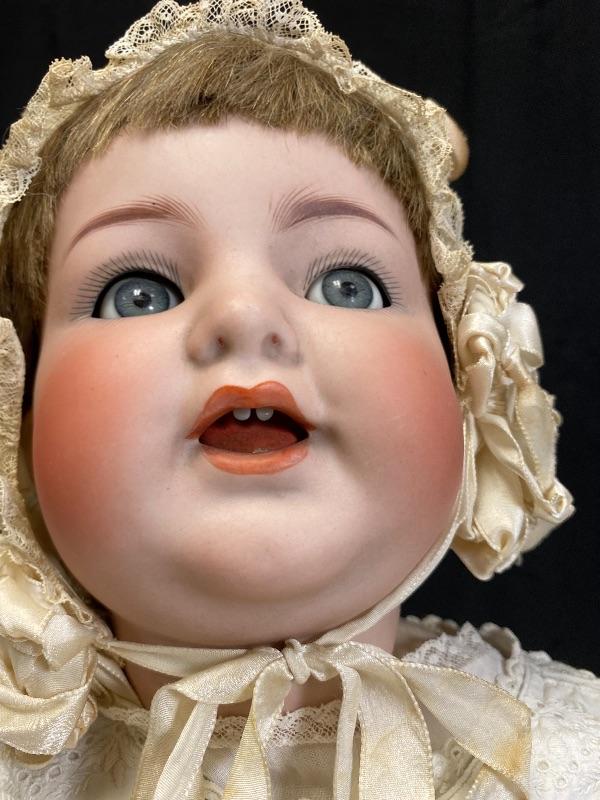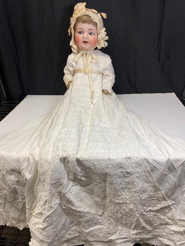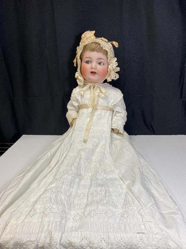 Antique 19" flirty eye Simon Halbig 126 doll. Bisque head with composition body. Squeaker (Mama) doll that cries when laid down, still makes noise but sounds old, worn. Blue glass eyes move side to side. Hair has been glued down. Mouth is open, has teeth and tongue trembles slightly. Body has been repainted possibly and the hands have faded oddly. Wearing an extra long christening gown. There is some spots and yellowing to the gown. The body looks like it was cut in half. Upon looking online I found another SH 126 doll that was the same. Believe it was done to make or fix these dolls that cry "mama", there is a mesh covered hole in the back. Face looks great. Doll has been on display and is a little dusty, smudgy.