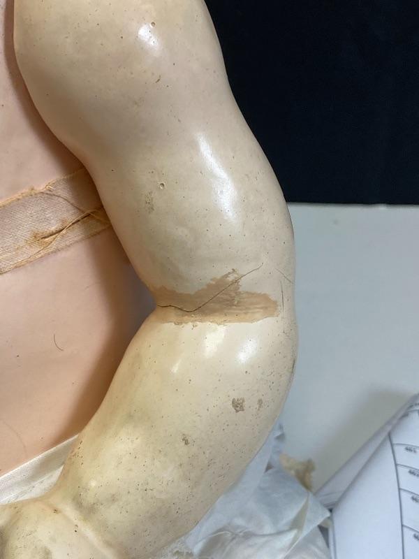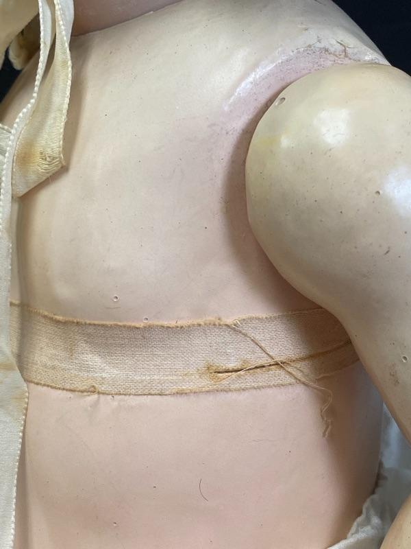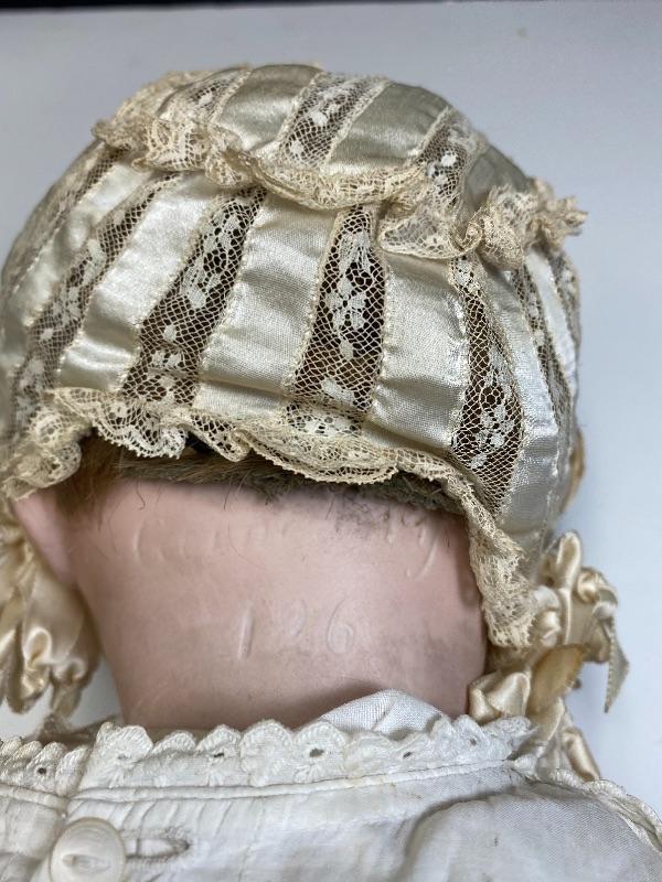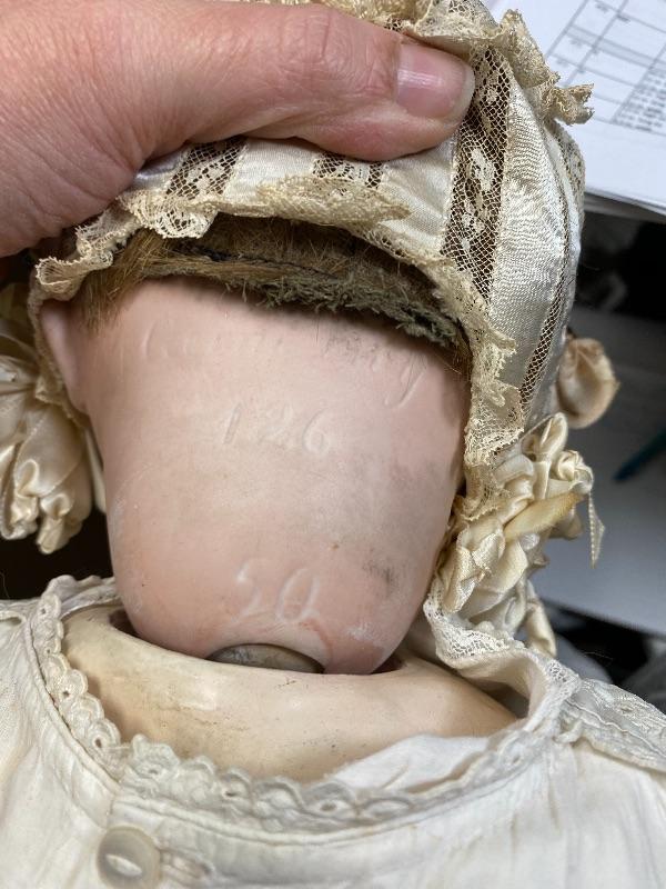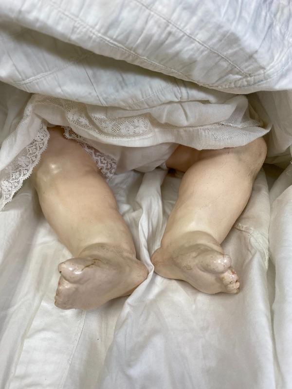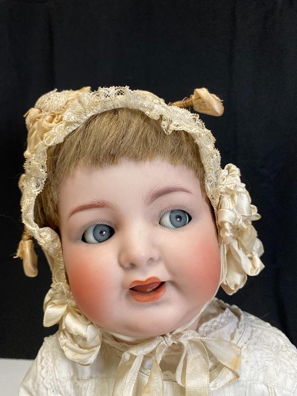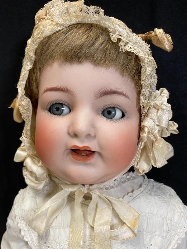 Antique 19" flirty eye Simon Halbig 126 doll. Bisque head with composition body. Squeaker (Mama) doll that cries when laid down, still makes noise but sounds old, worn. Blue glass eyes move side to side. Hair has been glued down. Mouth is open, has teeth and tongue trembles slightly. Body has been repainted possibly and the hands have faded oddly. Wearing an extra long christening gown. There is some spots and yellowing to the gown. The body looks like it was cut in half. Upon looking online I found another SH 126 doll that was the same. Believe it was done to make or fix these dolls that cry "mama", there is a mesh covered hole in the back. Face looks great. Doll has been on display and is a little dusty, smudgy.