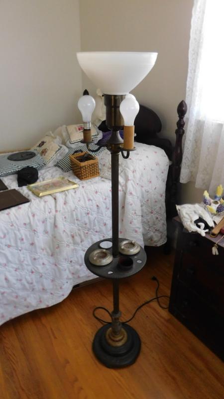 Antique Floor Lamp with Tobacco Tray. Metal post with glass globe at top. Side globes missing.