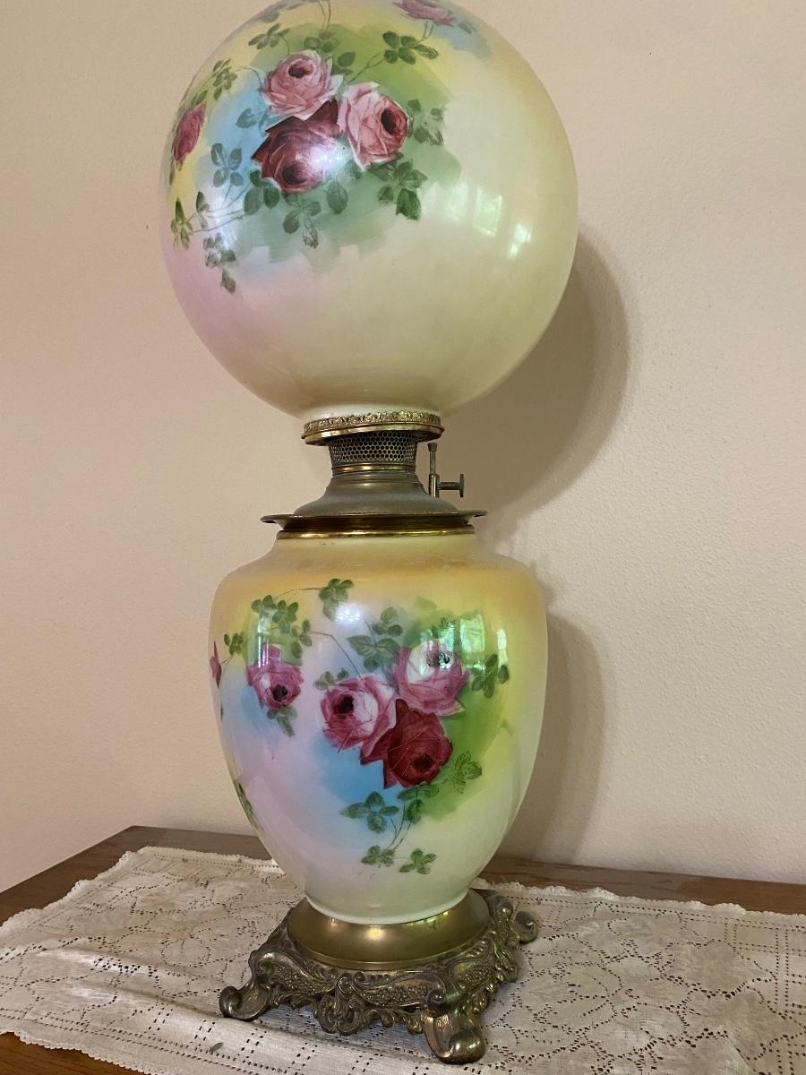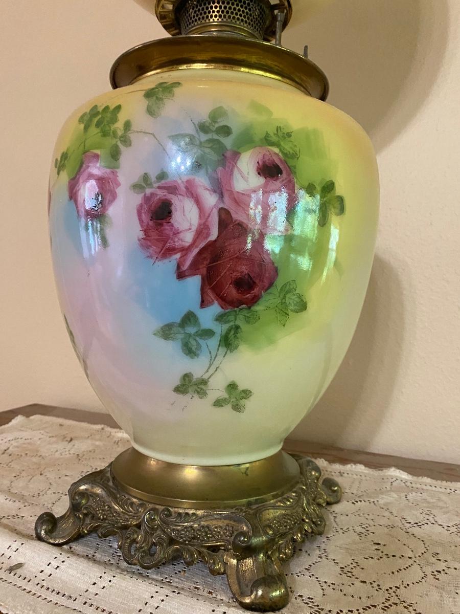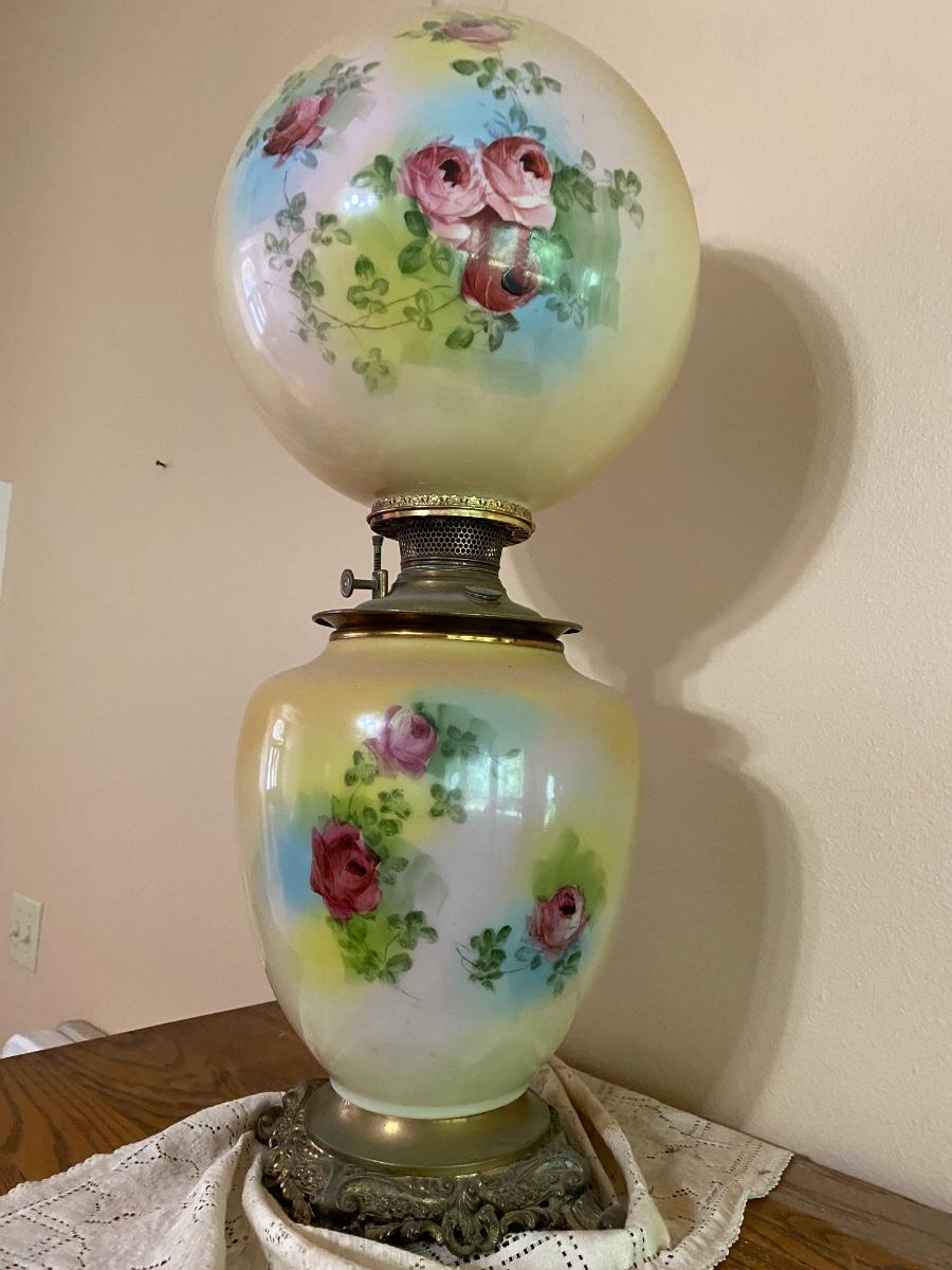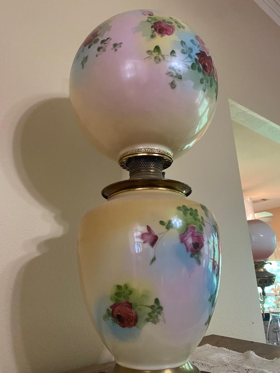 Antique floral oil lamp. 30”h x 10”dia. Excellent condition