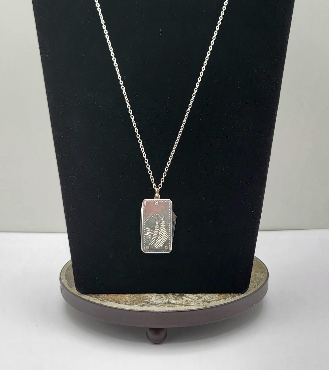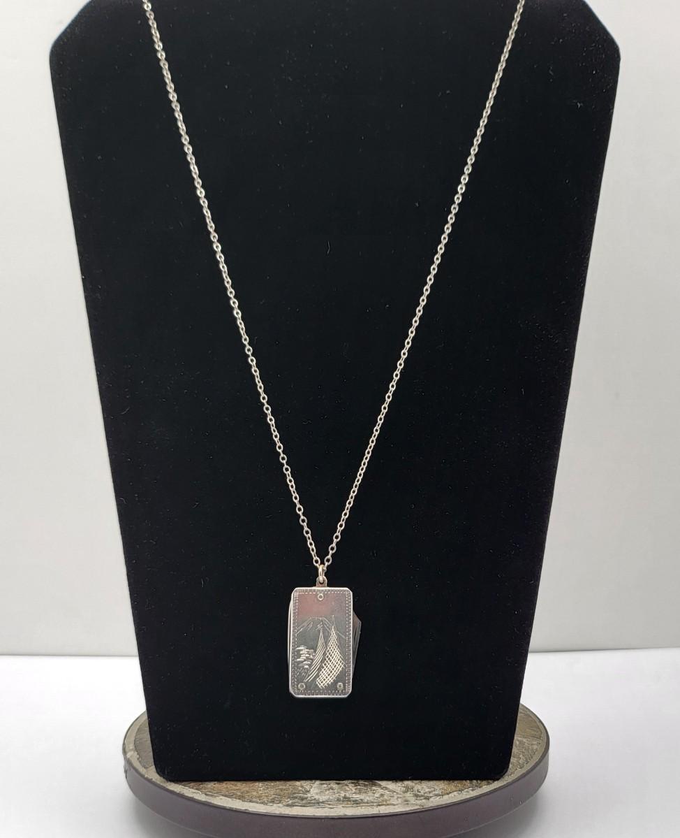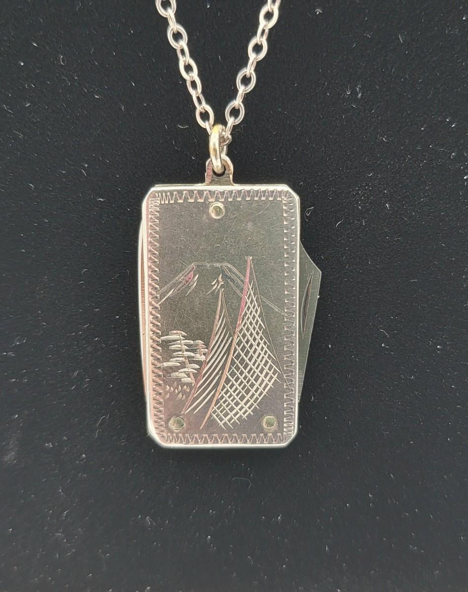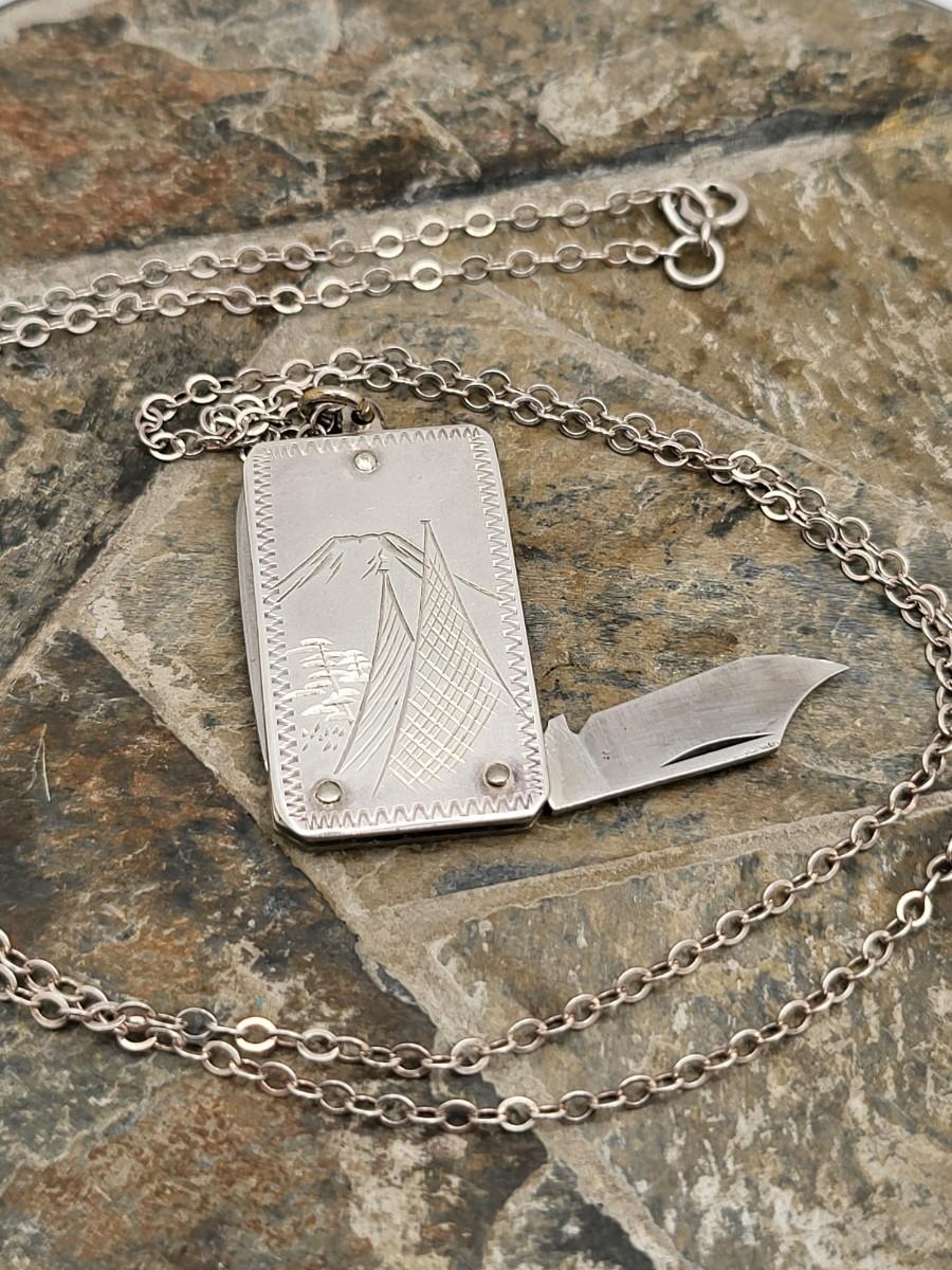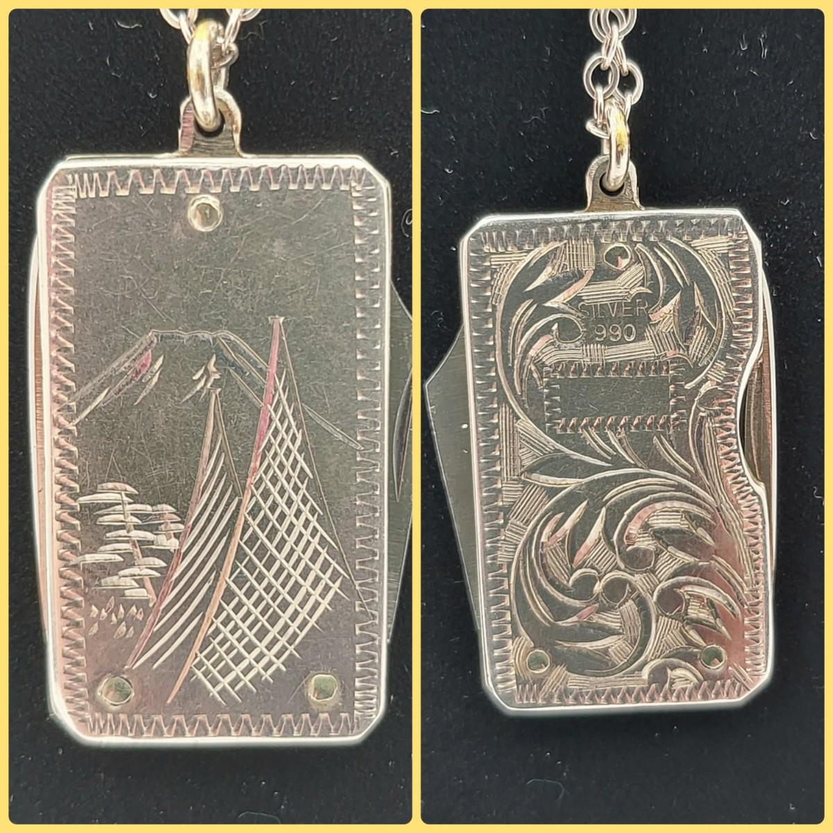 Mt. Fuji etched antique pocket knife pendant necklace. Pendant is stamped Silver 990. Chain is 24" and is 925 sterling silver. Weighs 13.2 grams.
