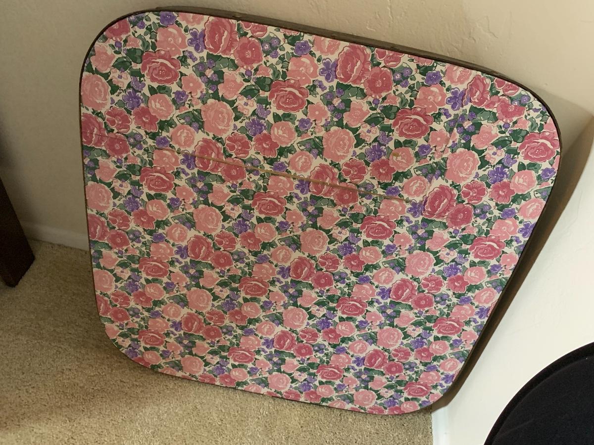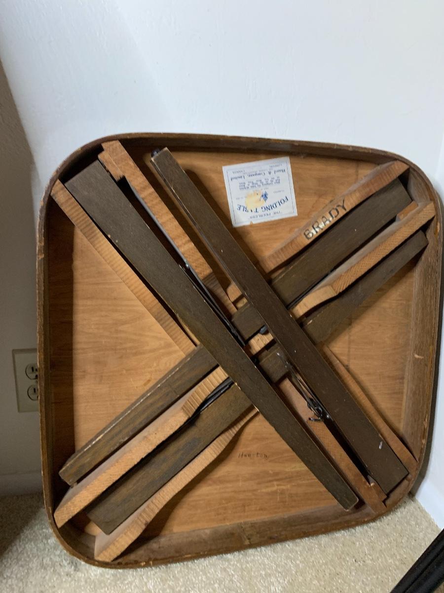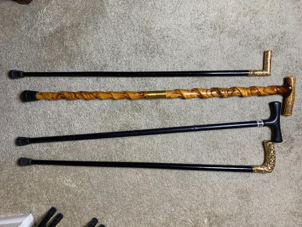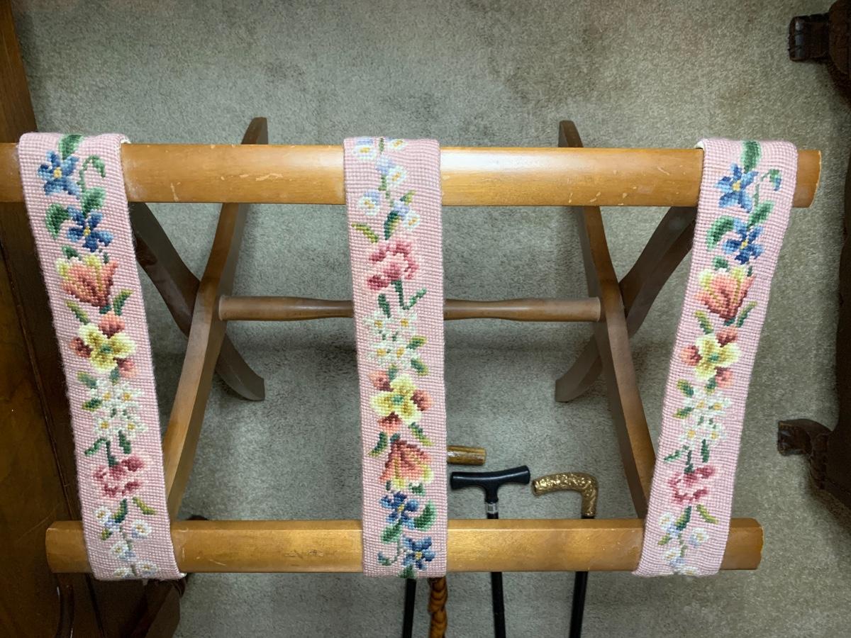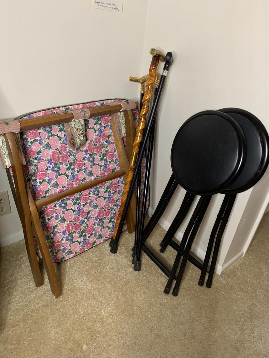 This lot includes 4 walking canes, a luggage stand, small vintage folding table with floral top (Hourd and Co Ltd- London/Canada) and 2 modern folding stools.