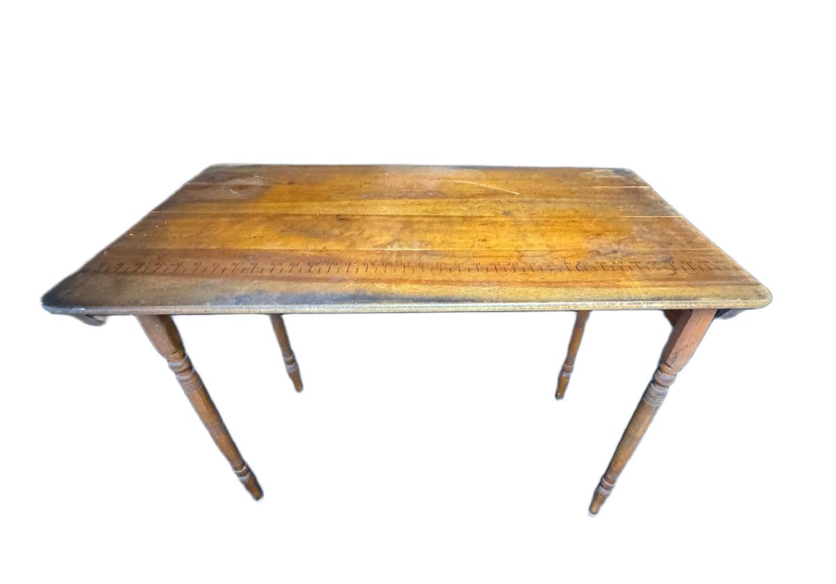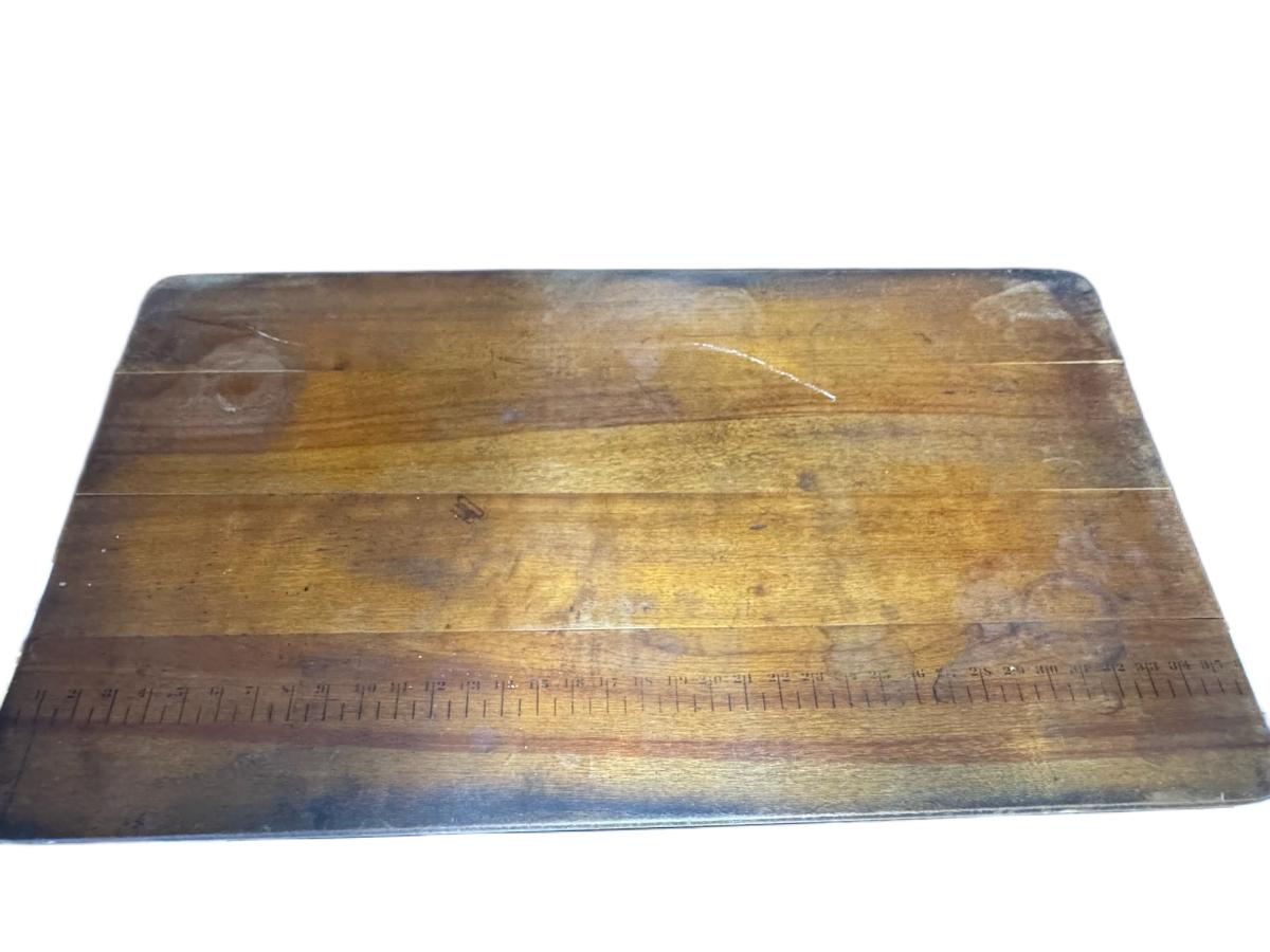 This antique sewing table has a yardstick stamped into the wood. The table may need some minor repair. It opens and closes as expected. Measurement: 36”W. [CS]
