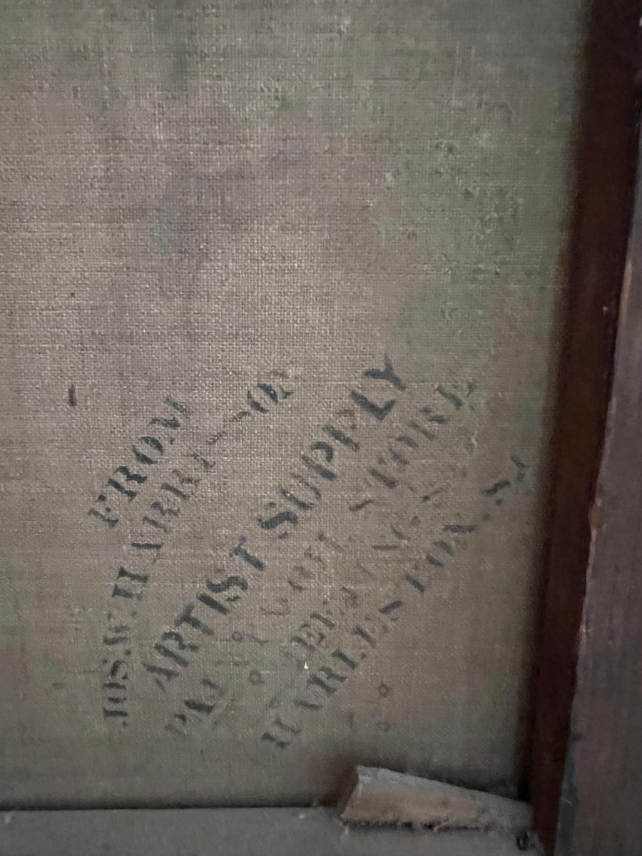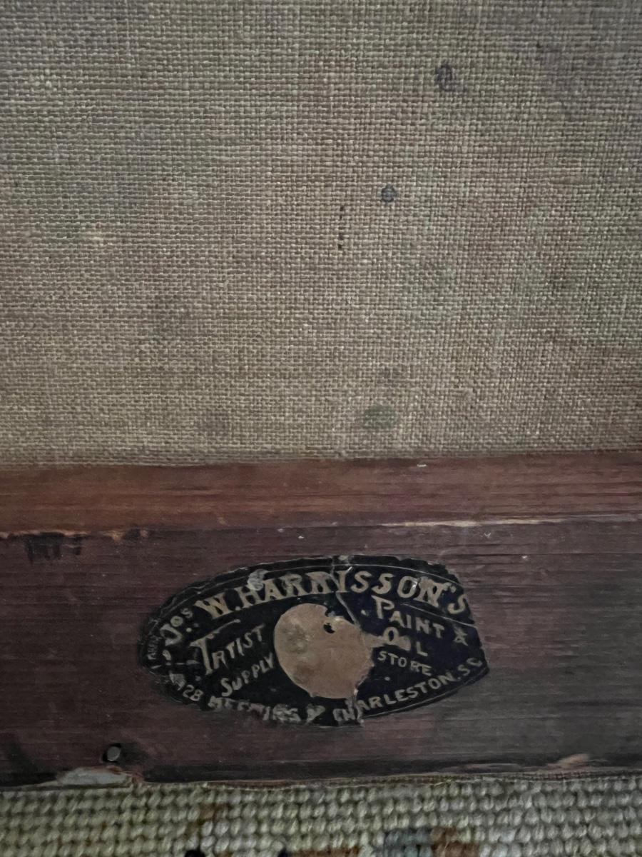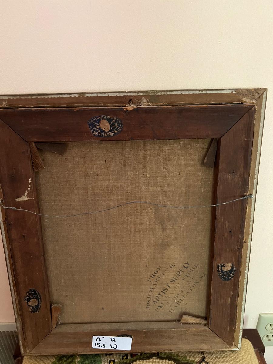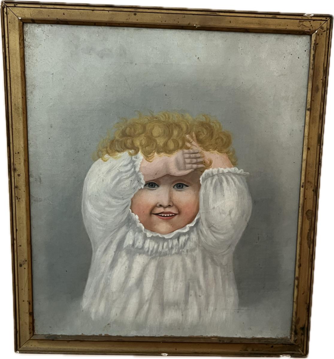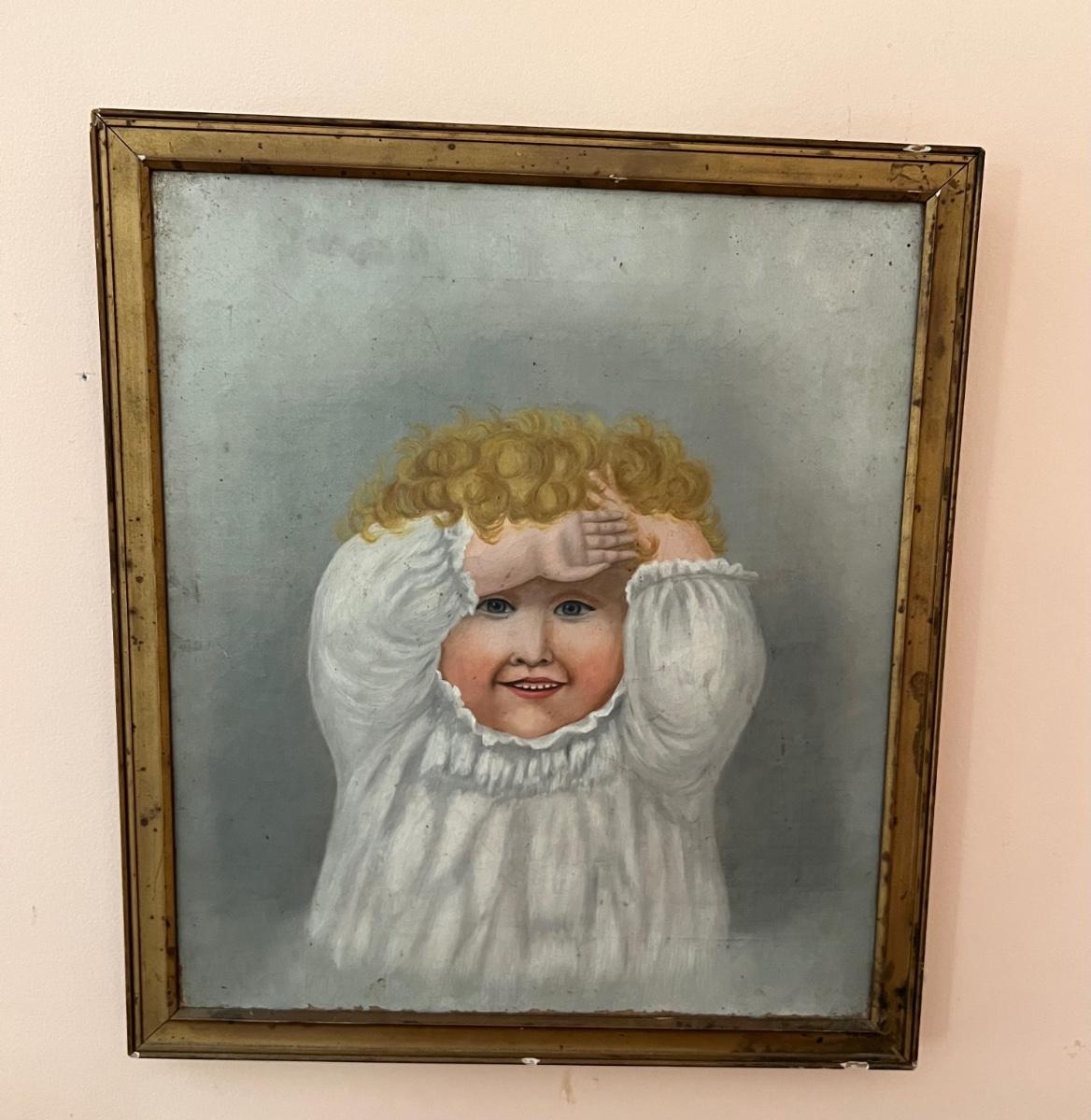 antique folk art female child painting, 18 x 15.5, charleston sc stamp on back
