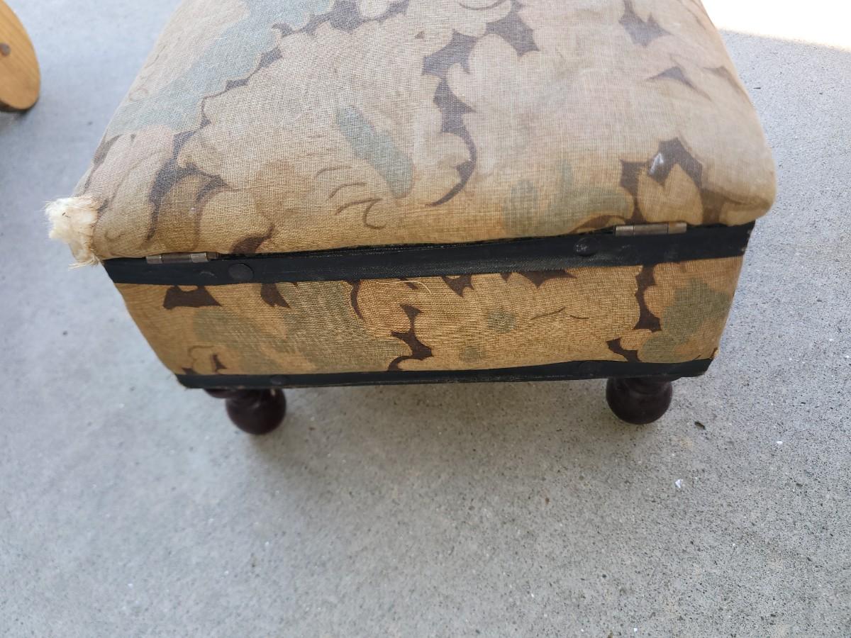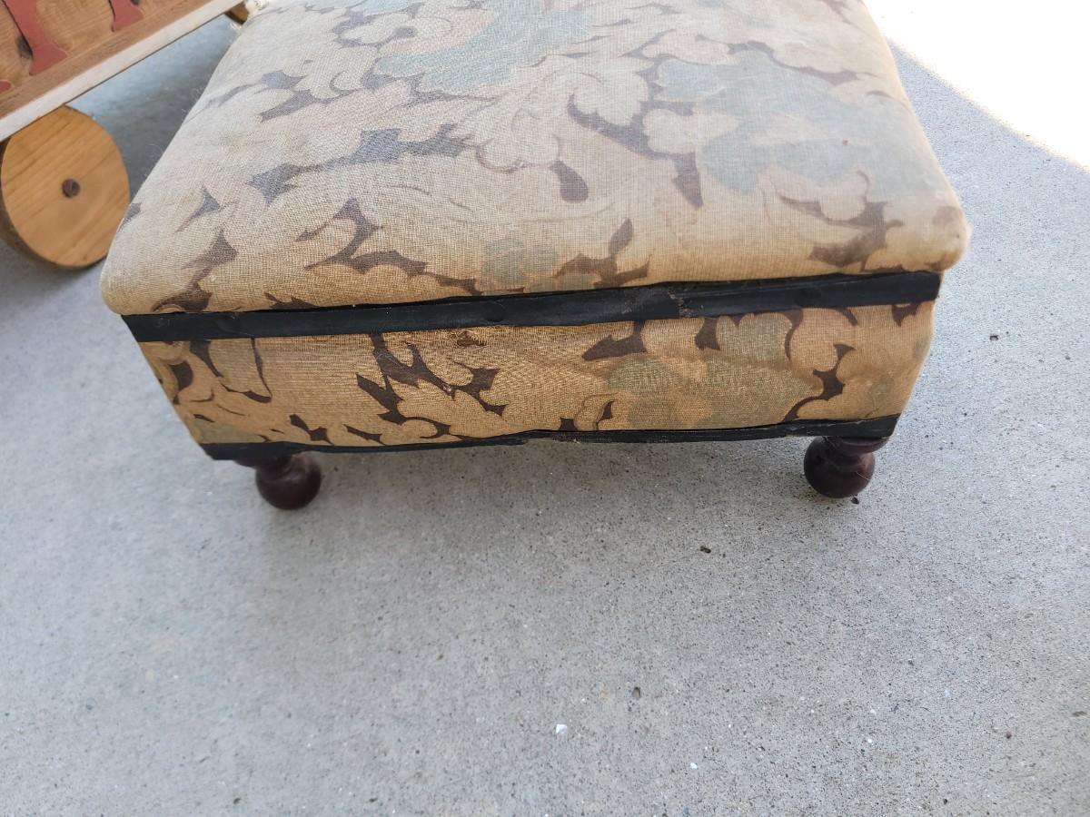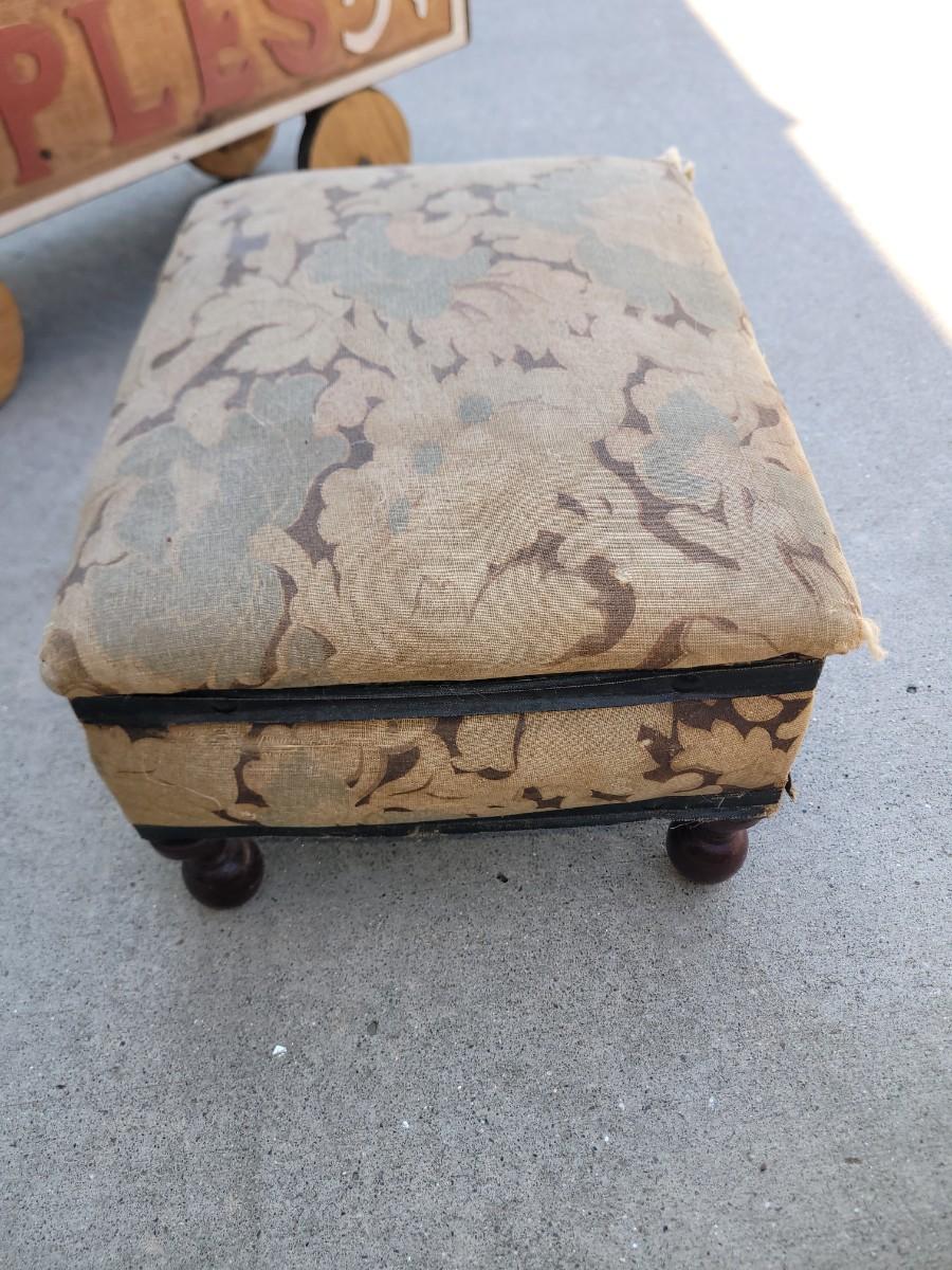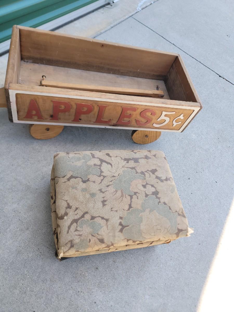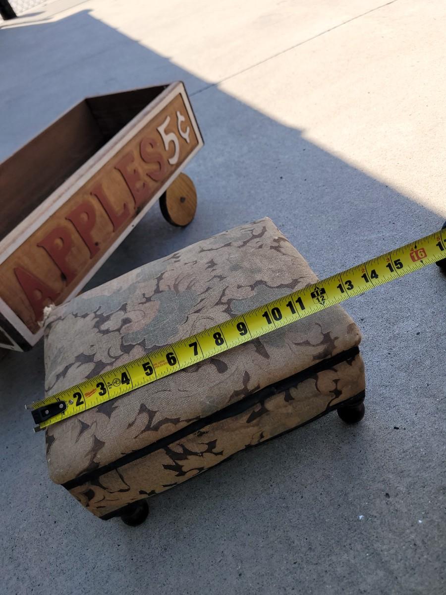 Cart has handle but it is not attached, see pics of stool for condition, it's 13" w x 11" deep and about 7" tall, awfully old no manufacturer found