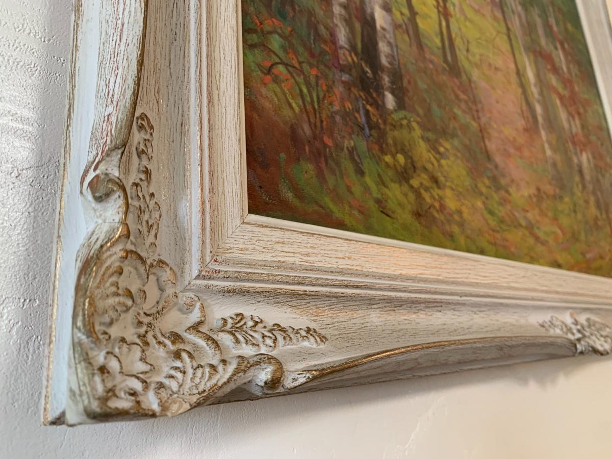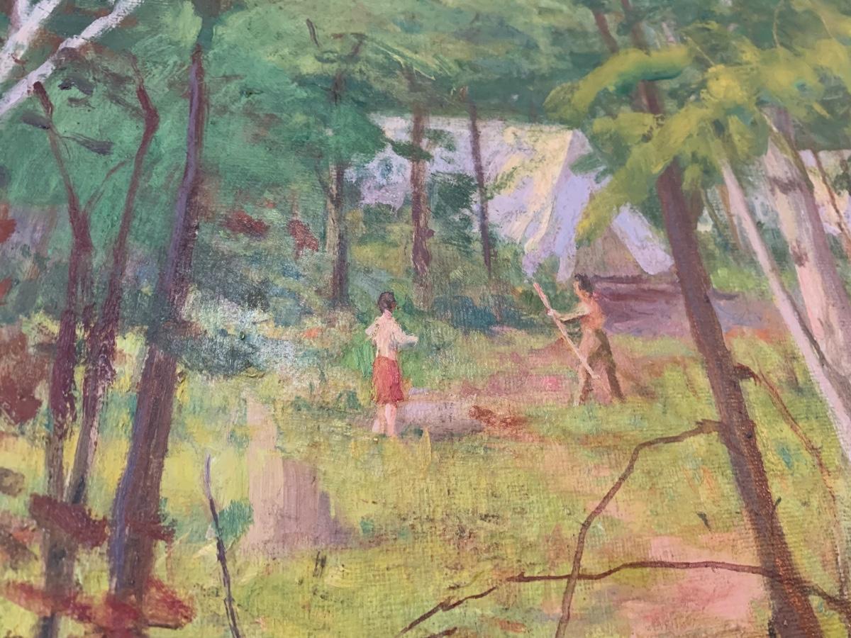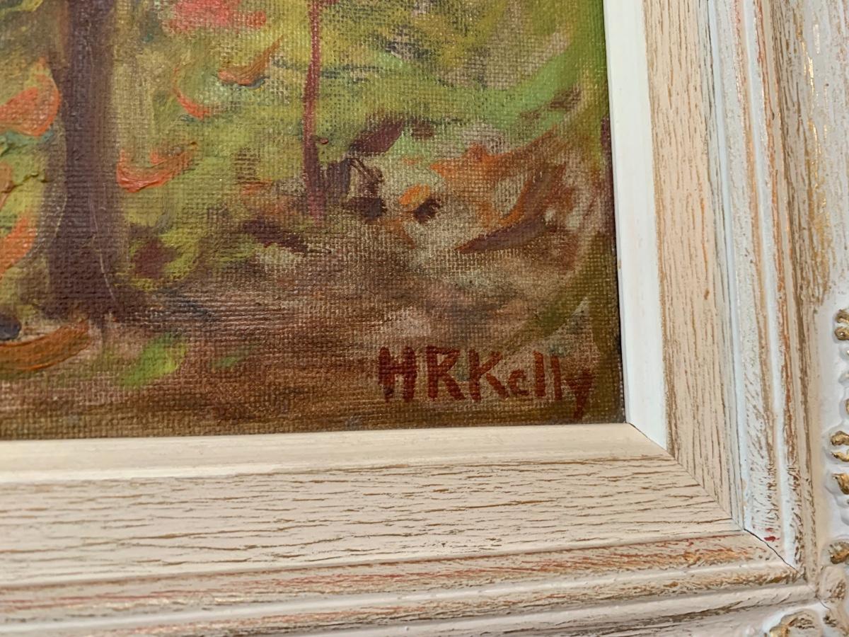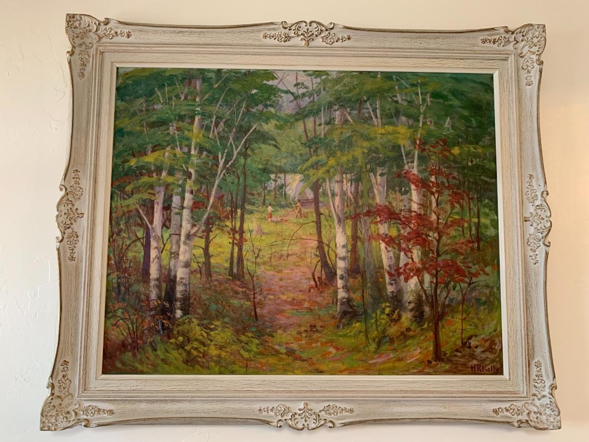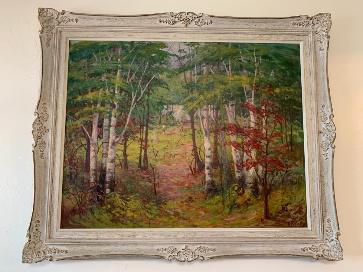 Antique original oil painting of forest scene by Hannah Rusk Kelly (1859-1935). Approx 36” x 30”
