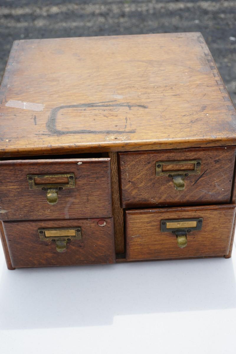 ANTIQUE FOUR DRAWER MACY OAK TABLE TOP CARD FILE