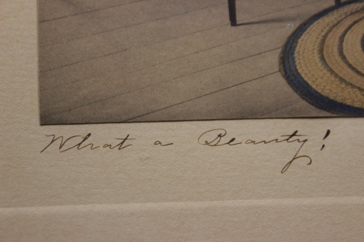Antique Framed and Signed Platinotype Print Hand Colored by Wallace Nutting, there is no damage to the frame or protective glass and is in good condition for its age. The print is entitled "What a Beauty" with the artist signature on the opposite side, check pictures for more details and for sizing.