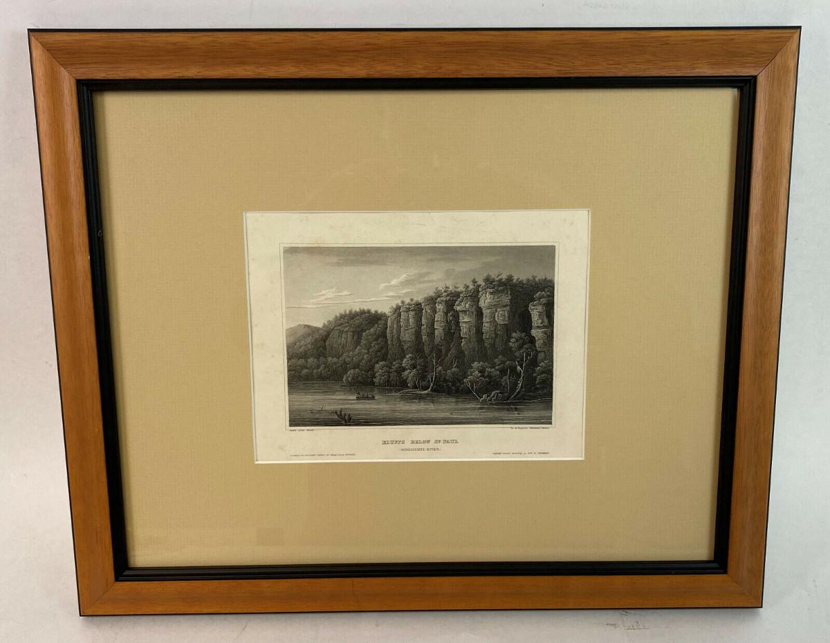 Here is a nicely framed Steel plate engraving...BLUFFS BELOW ST PAUL 'Mississippi River' from a German book titled "Meyer's Universum" published by Herrmann J. Meyer of New York circa 1850...'Drawn After Nature'...Good condition with a minor spot in margin...Framed and matted...16.25" x 13.25"...Image measures 7.5" x 5.5"...This estate find is offered with no reserve...