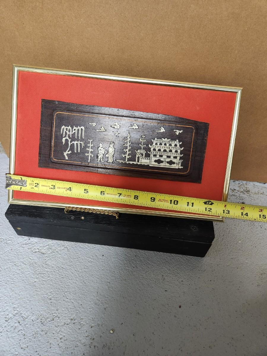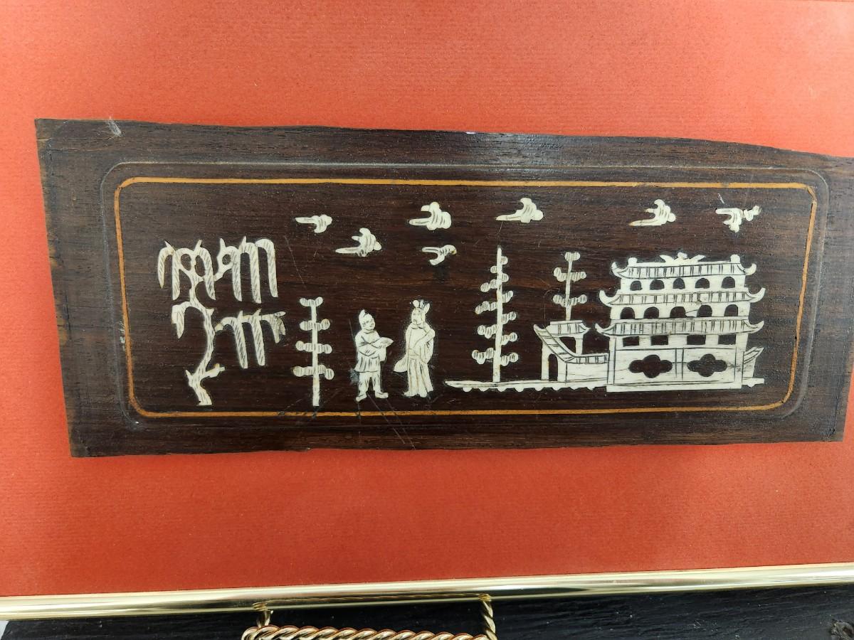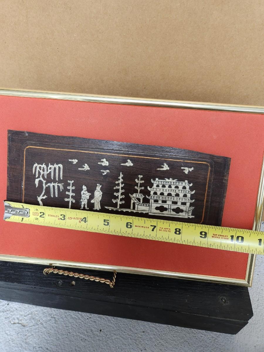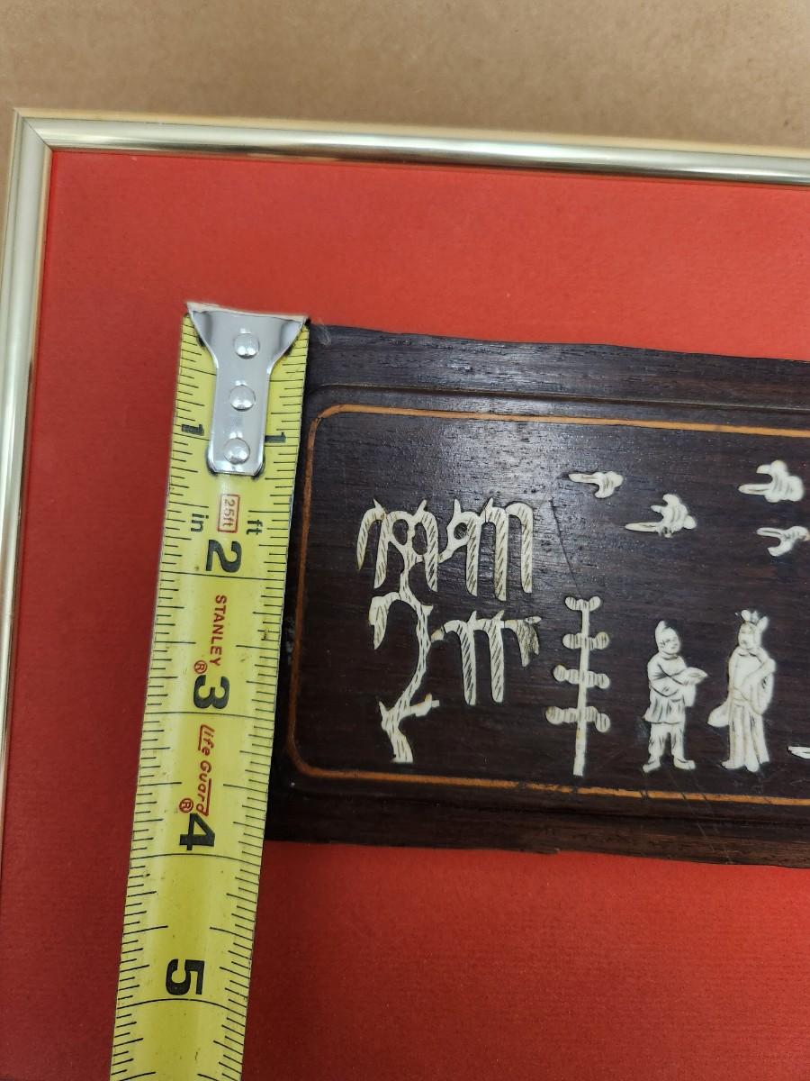 Believed to bean antique mahjong set lid, this beautiful framed piece of wood boasts spectacular inlay. Notice how some of it floresces under Black light?