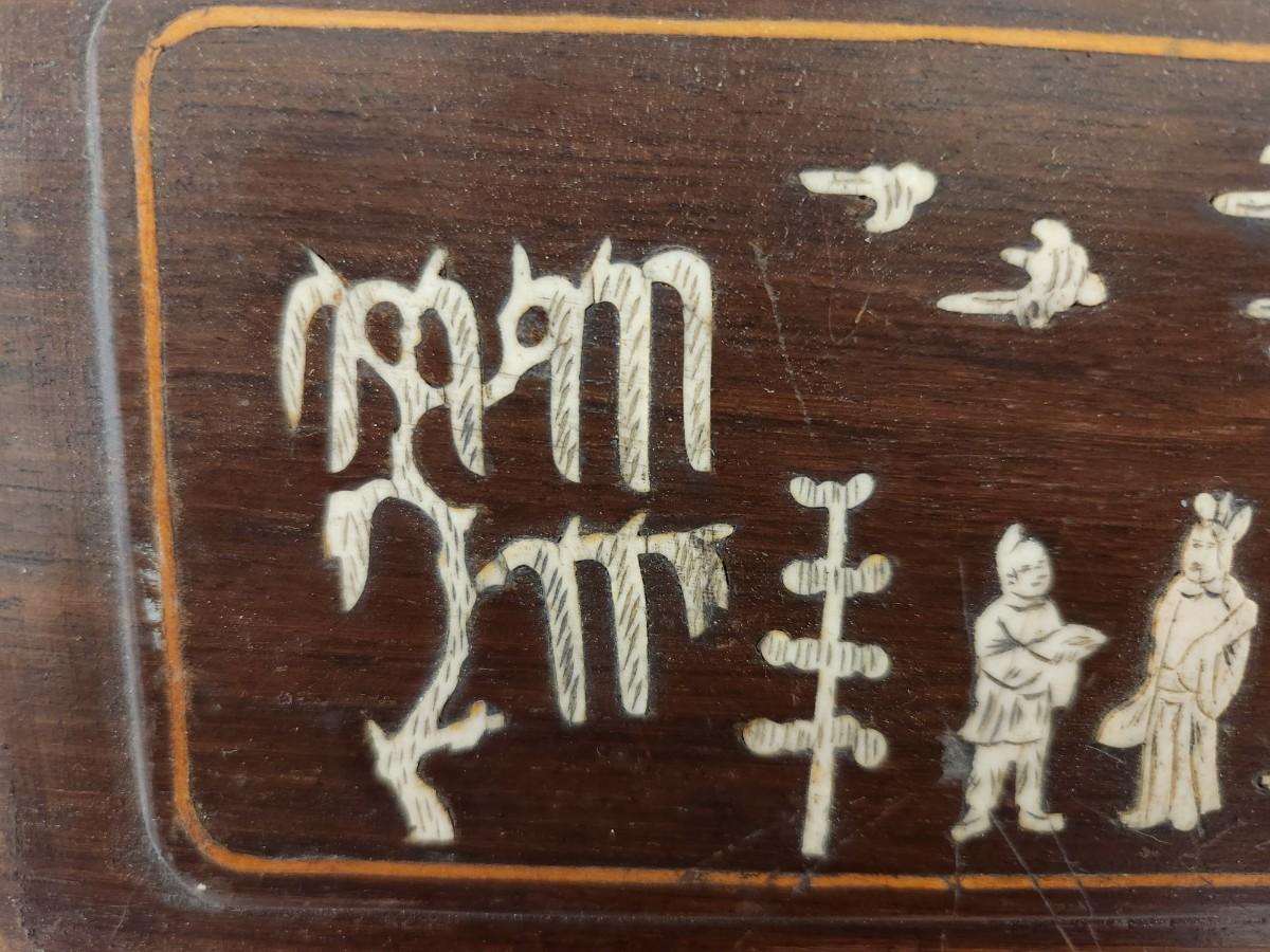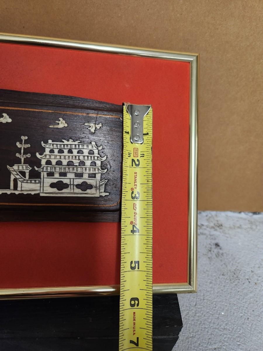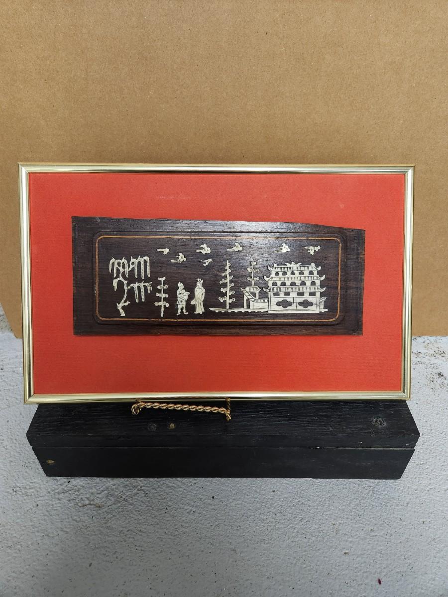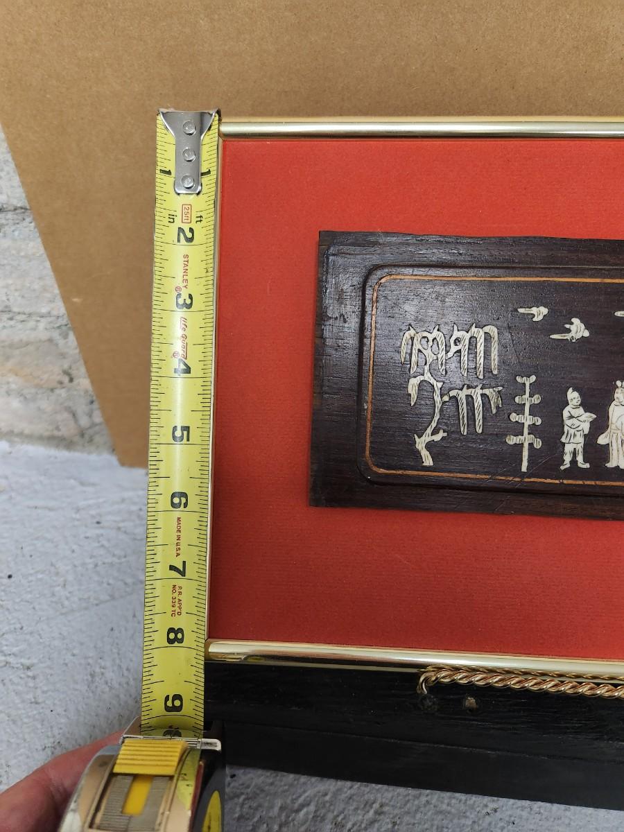 Believed to bean antique mahjong set lid, this beautiful framed piece of wood boasts spectacular inlay. Notice how some of it floresces under Black light?