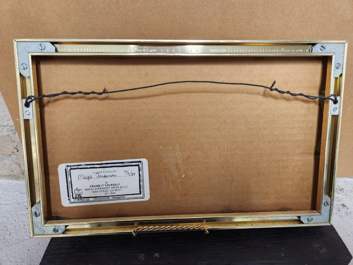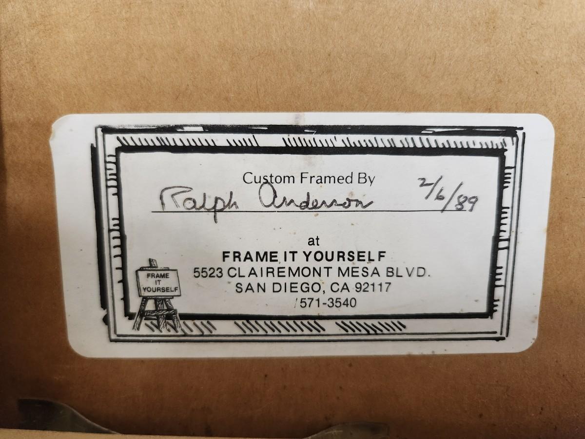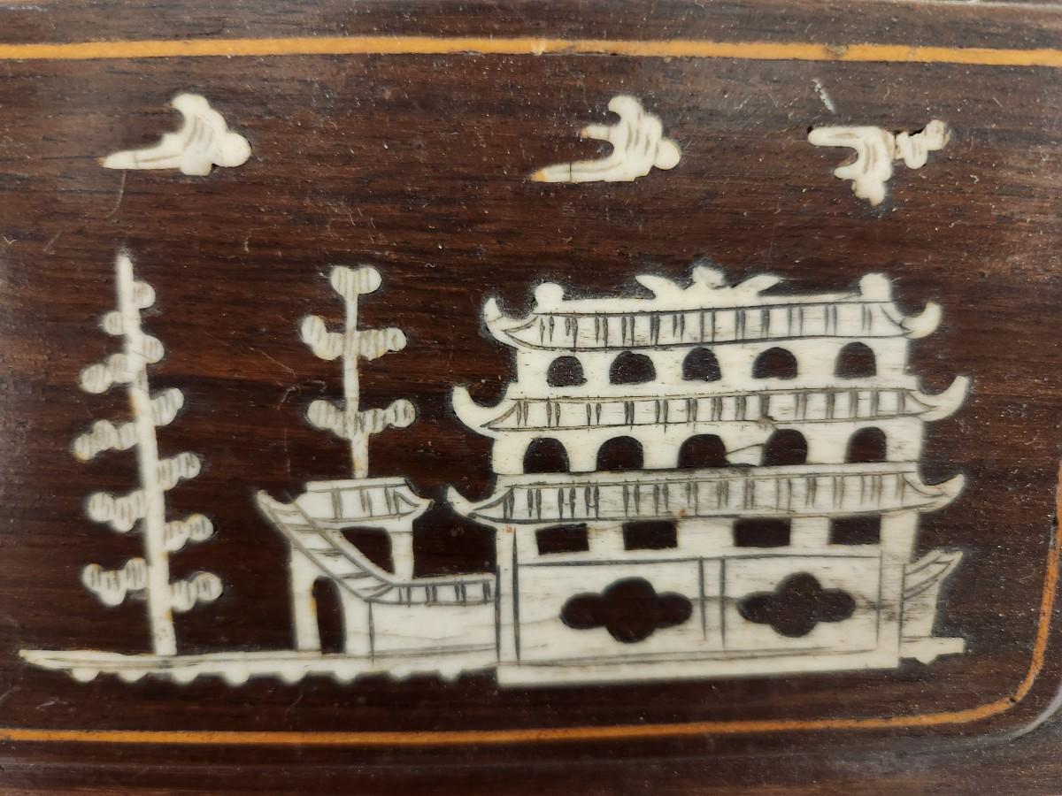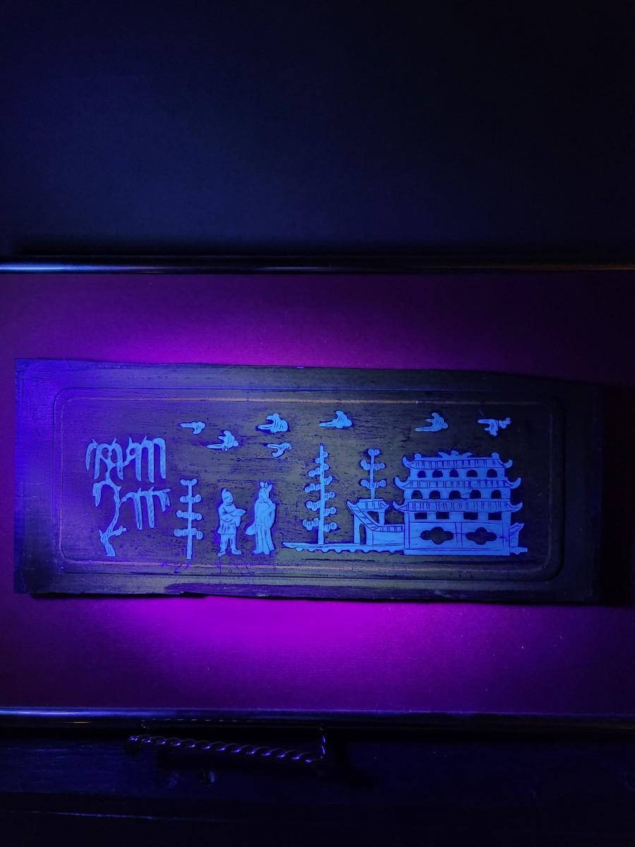 Believed to bean antique mahjong set lid, this beautiful framed piece of wood boasts spectacular inlay. Notice how some of it floresces under Black light?
