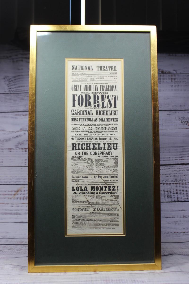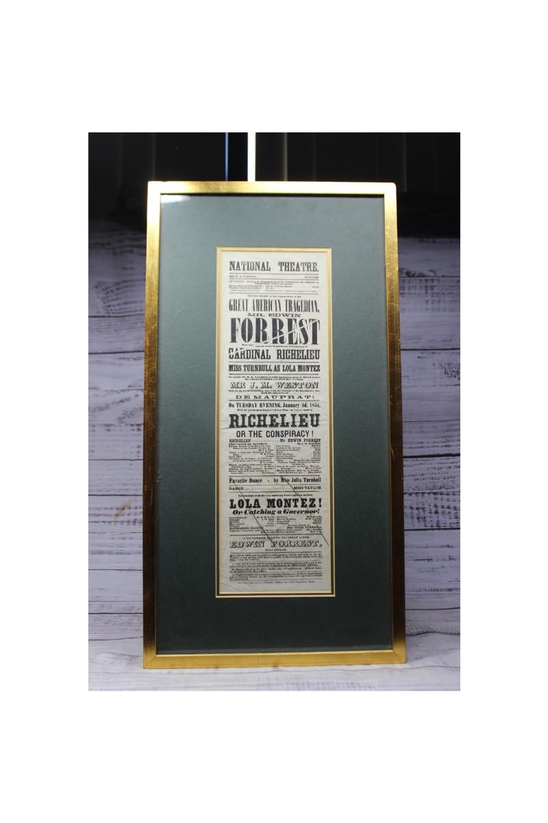 Antique Framed National Theatre Advertisement of the Times, there is no significant damage to the frame or protective glass and is in good displayable condition. There is a dent on the advertisement, but there is no other noticeable marks and is in good condition. Check pictures for more details and for sizing.