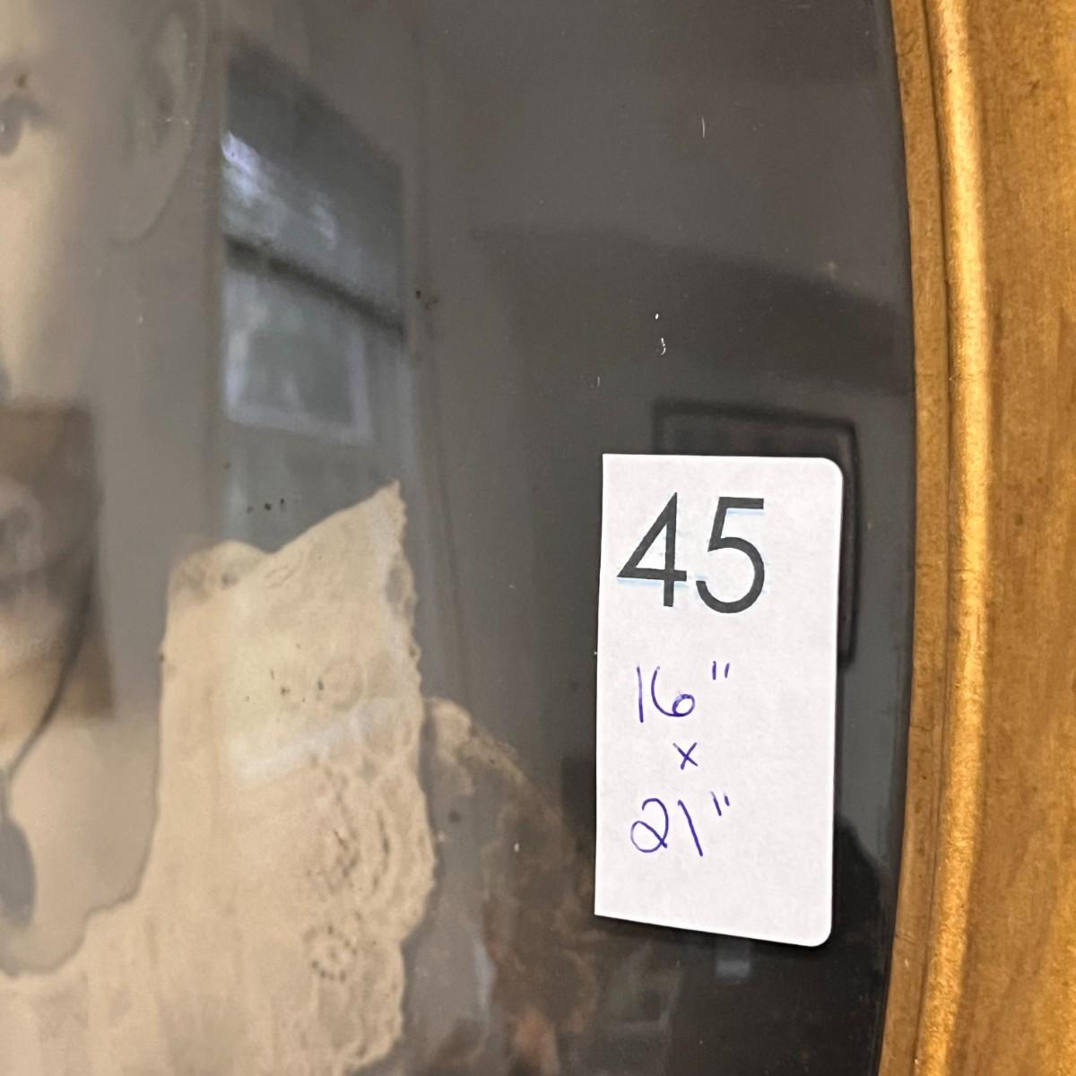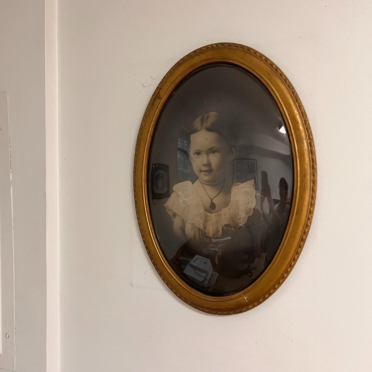Antique photograph of a child in domed glass frame. Small chip/crack in frame as shown in pics. 16" x21"