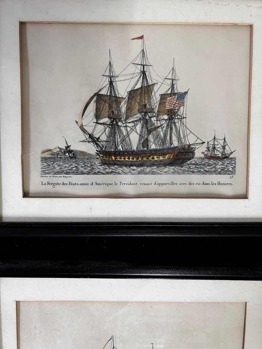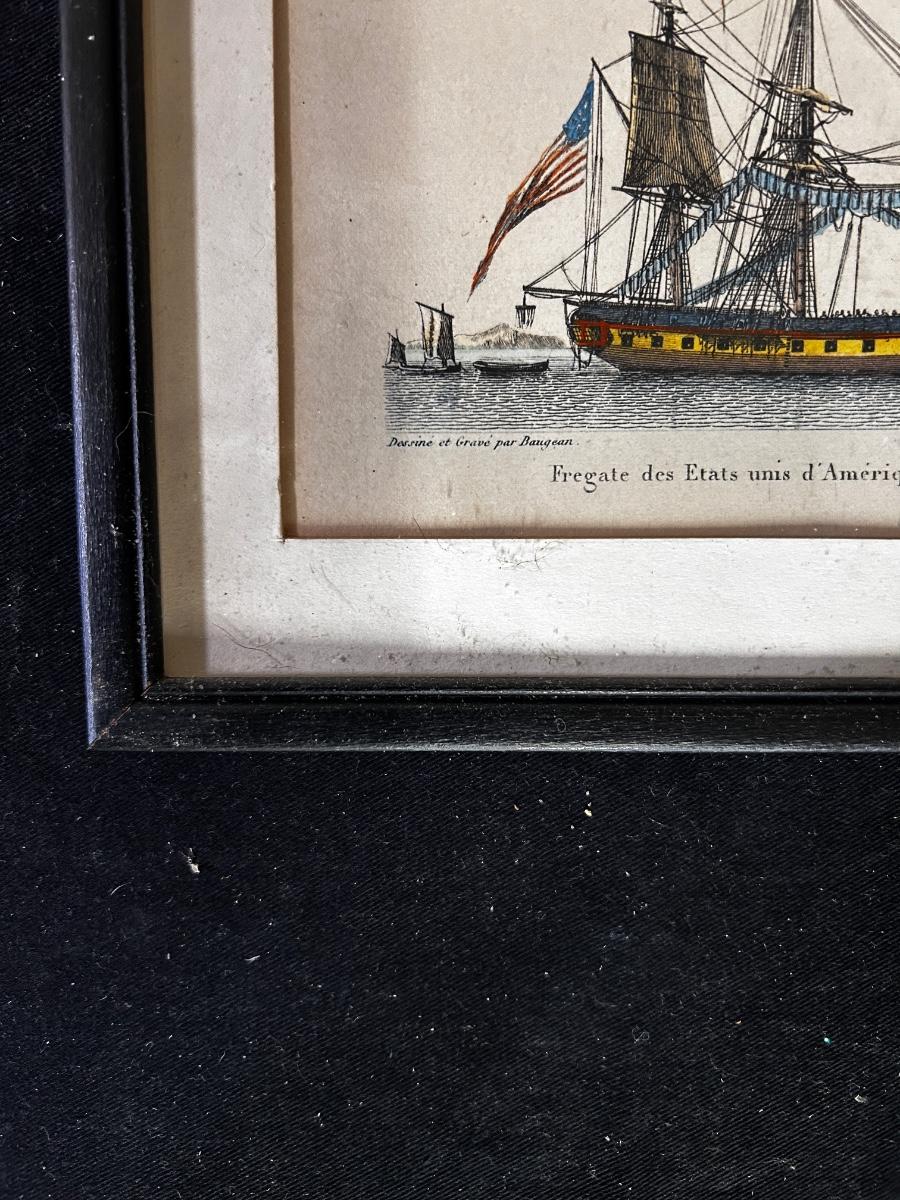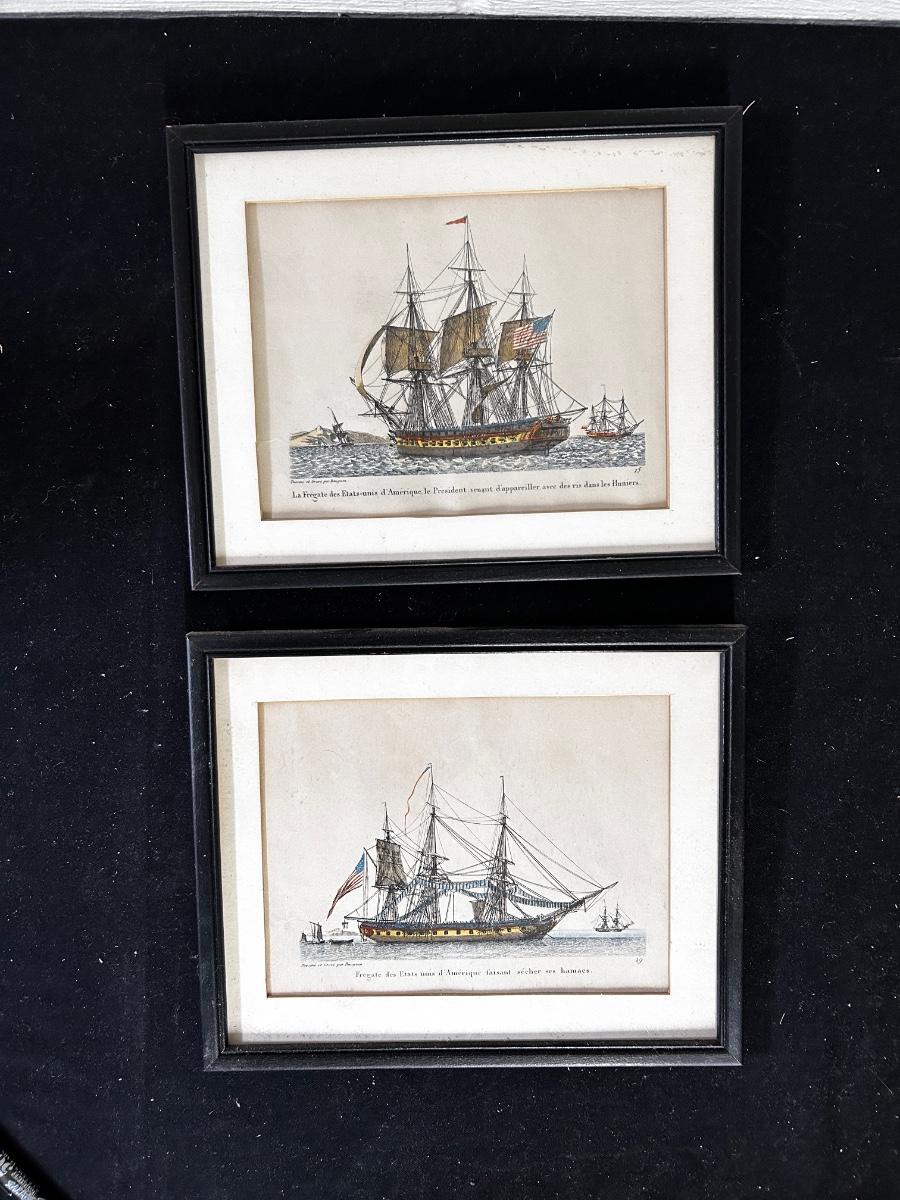 Antique framed prints of early 19th century American sailing frigates (2)
