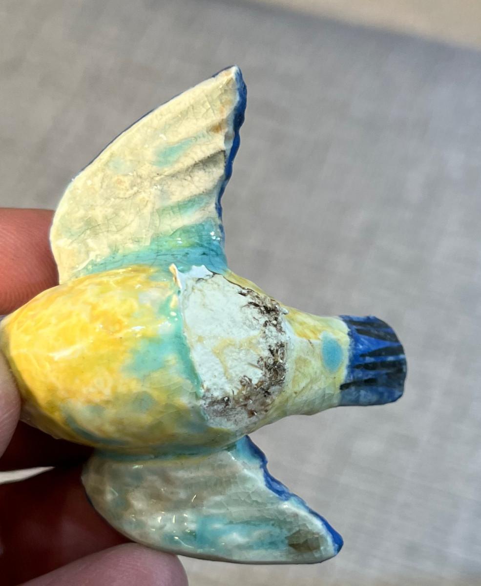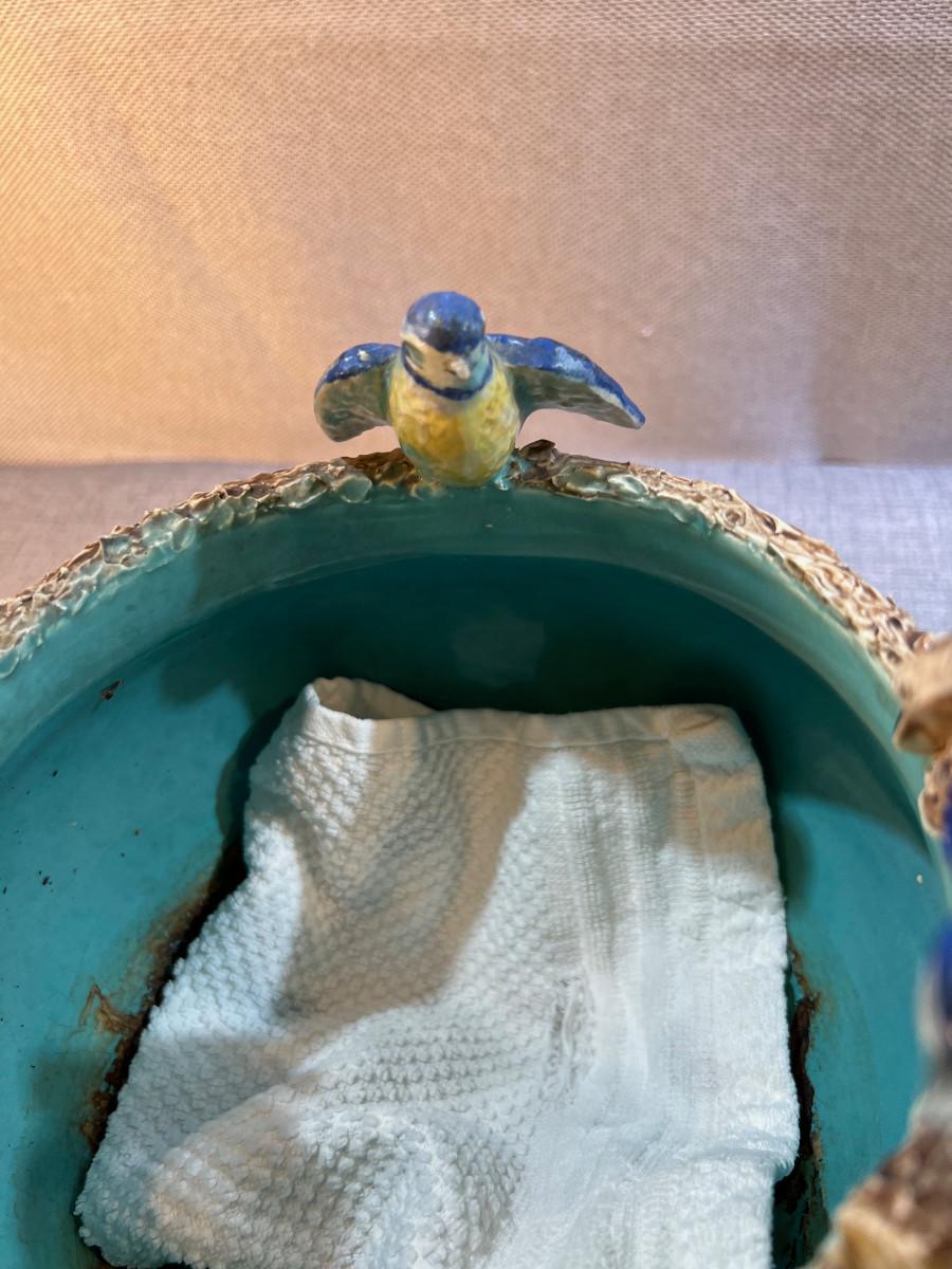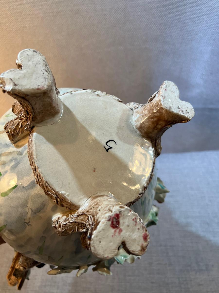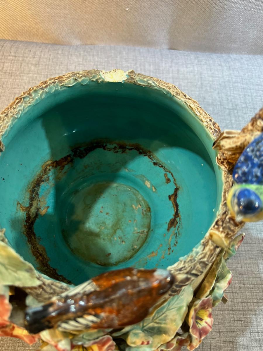 Antique French Barbotine Majolica Vase Planter. Sold as shown, one of the birds has come off the edge, a fairly easy repair. 10" tall 11 1/2" wide. @0th century majolica, early 1900's. In mint condition worth over $650