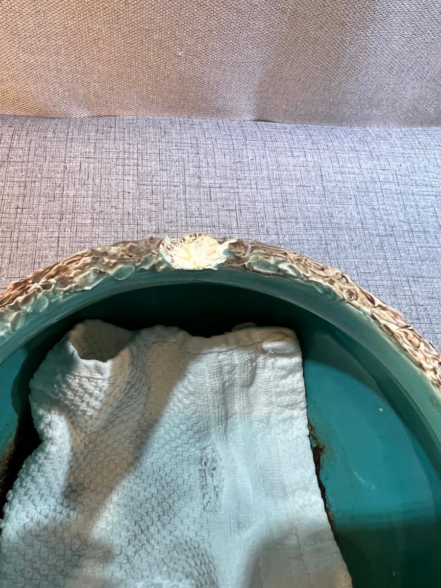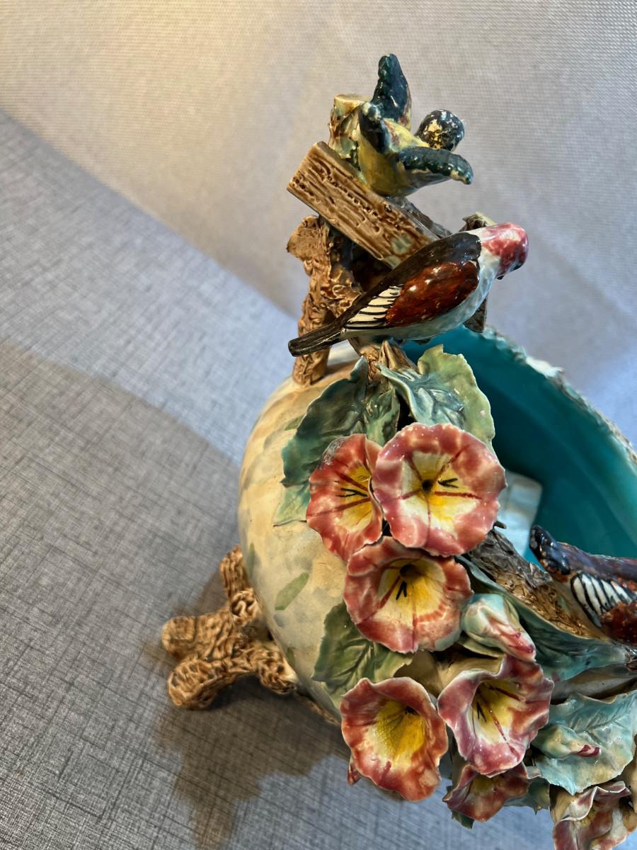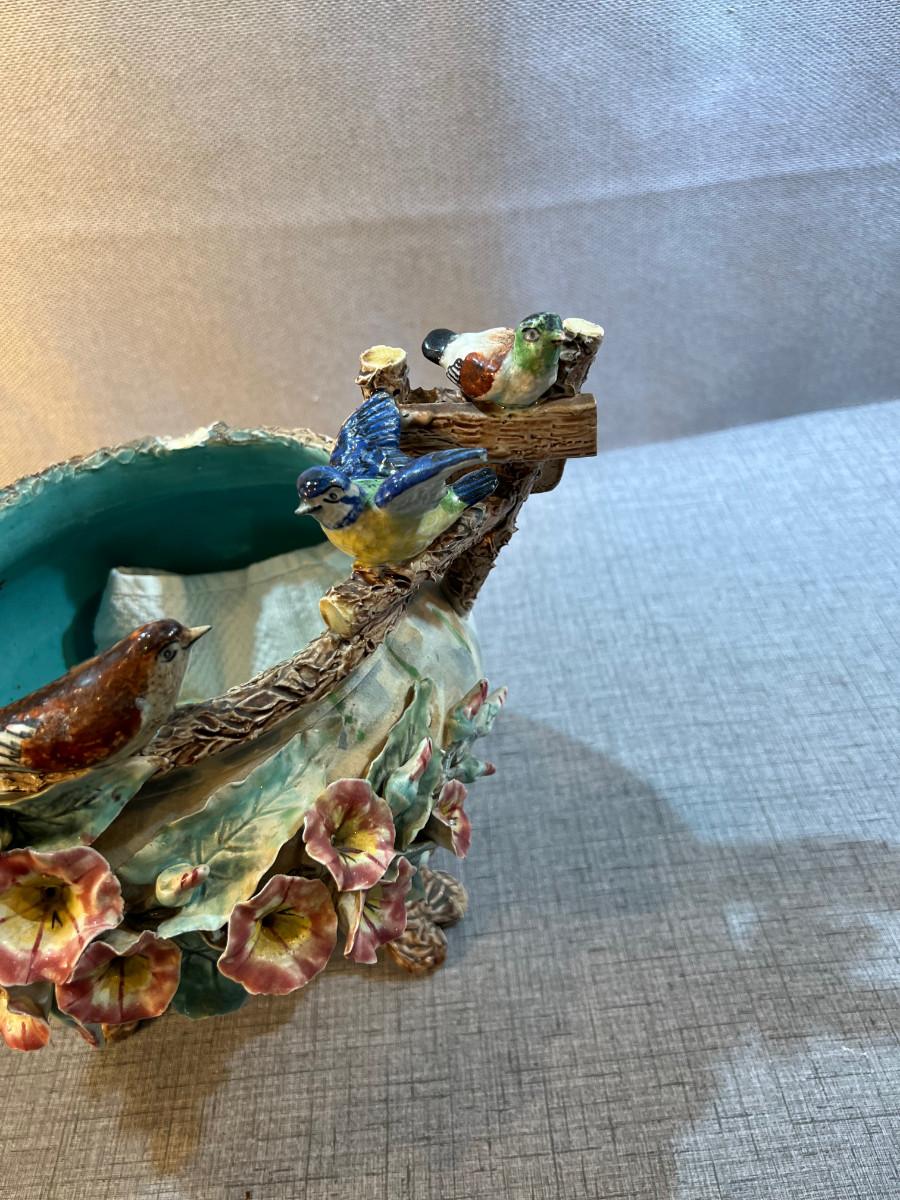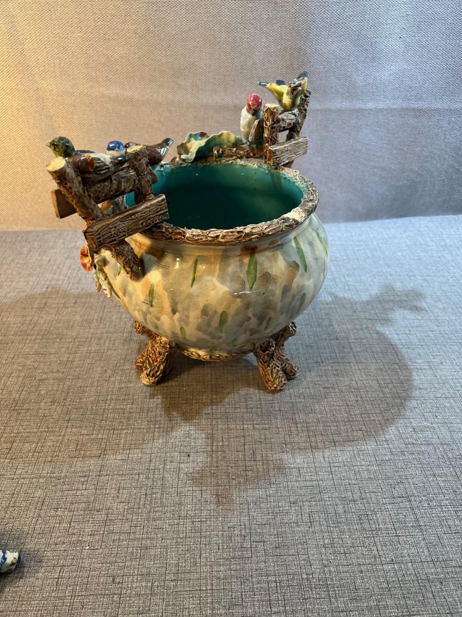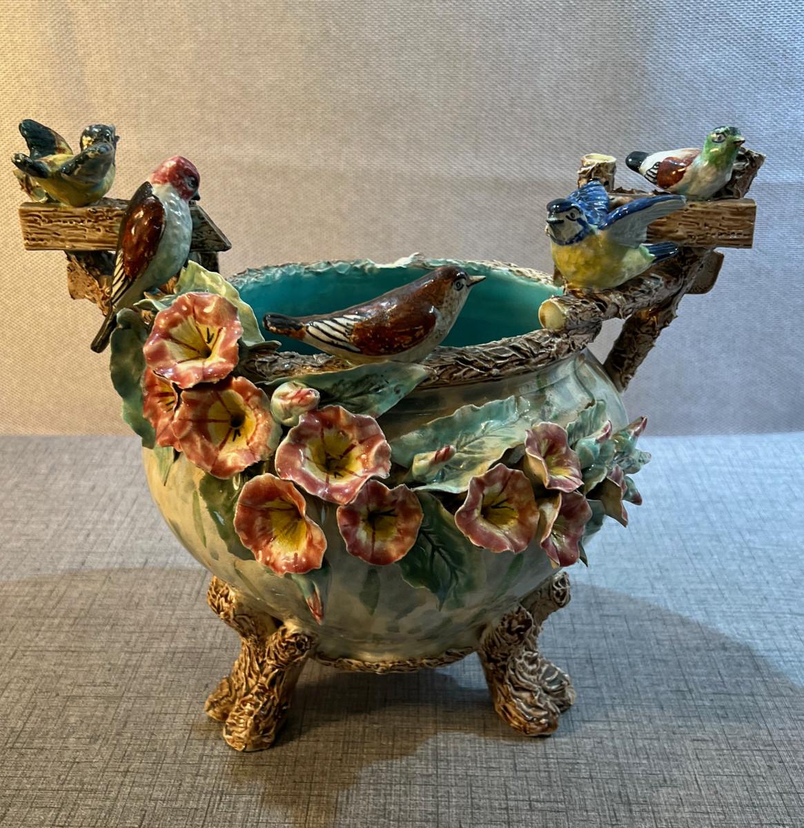 Antique French Barbotine Majolica Vase Planter. Sold as shown, one of the birds has come off the edge, a fairly easy repair. 10" tall 11 1/2" wide. @0th century majolica, early 1900's. In mint condition worth over $650