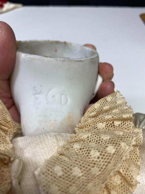 Antique Etienne Denamur French clown doll. Bisque head is marked E6D Depose France. Traditional understated clown make up as known by the French, in good condition, very little wear. Composite, jointed body, hands show some damage. Hat likes to fall off, needs a little glue. Discolor from age to the clothing but in fair condition otherwise. About 16" without hat.