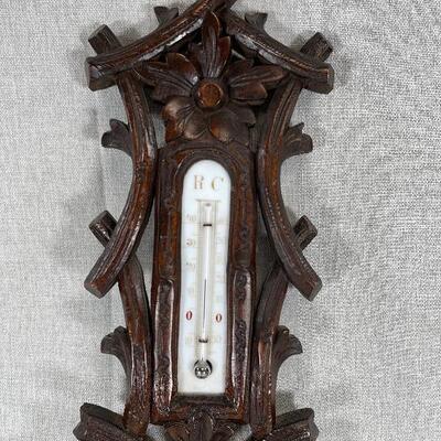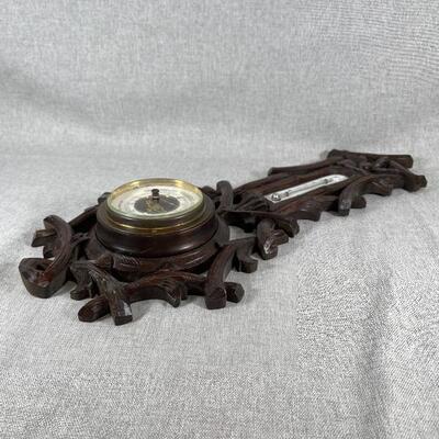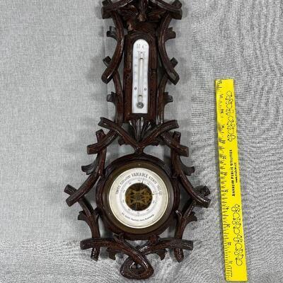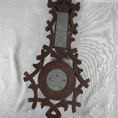 Beautiful antique black forest barometer. Made in Hamburg, Germany but words on face are in French. Has a simple branch and flower design. Open center face, hardware appears to be brass. In great condition. The #2337 is etched in the back. Over 15" size.