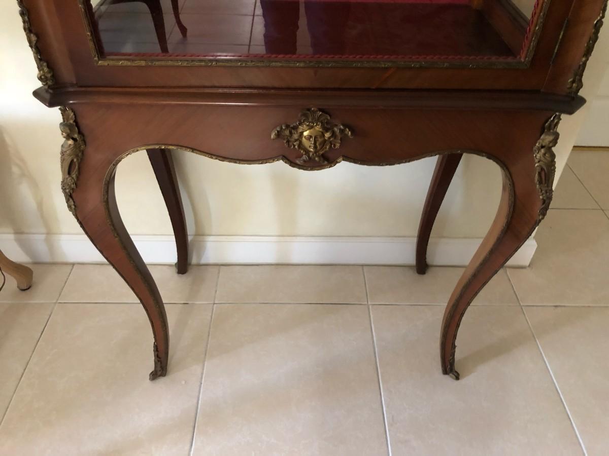 This gorgeous antique vitrine/curio has a rich burgundy silk damask backing which adds character and elegance. It has is ormolu trim on all corners and around the glass sides and door. There is a lock and key included. The interior has two glass shelves and the sides of the piece are glass, fully displaying all your collectibles. It is in very good condition though there may be imperfections expected of pieces of this age.