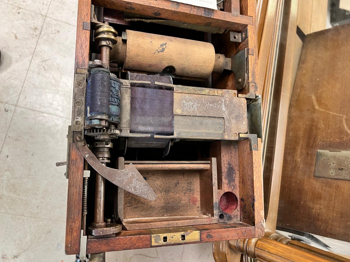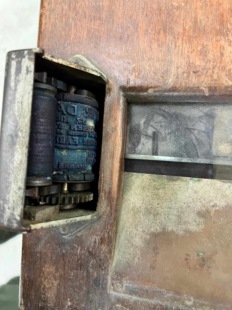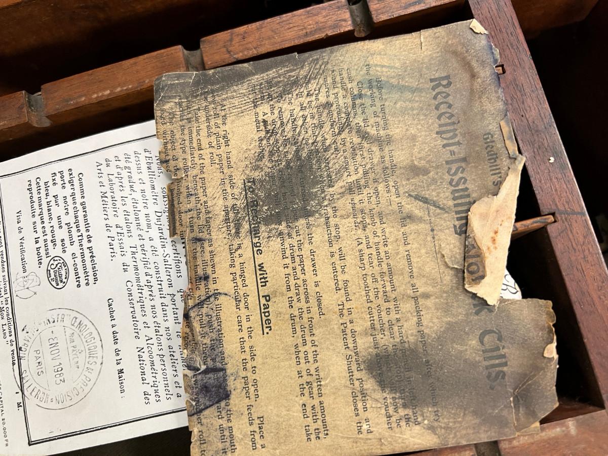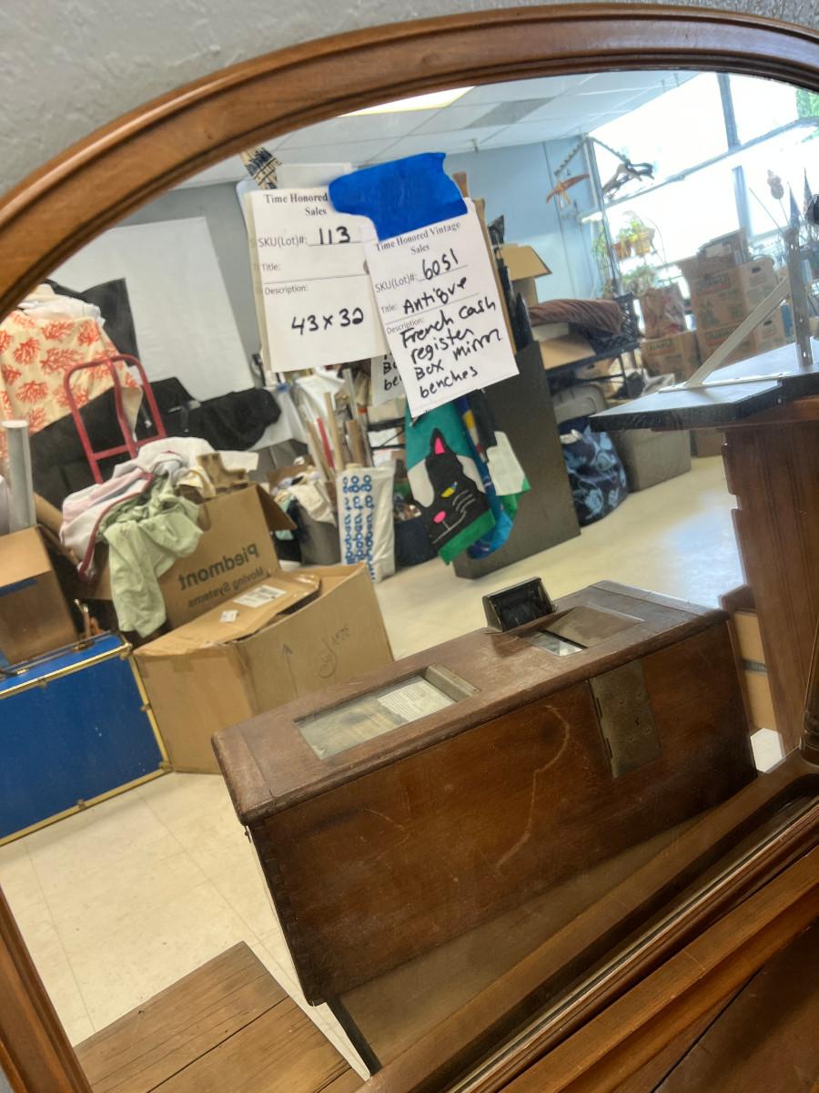 Antique French Cash register, Dresser mirror, wooden box