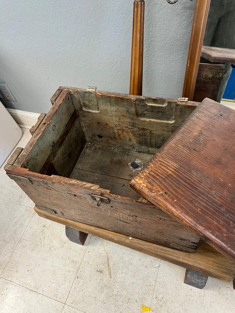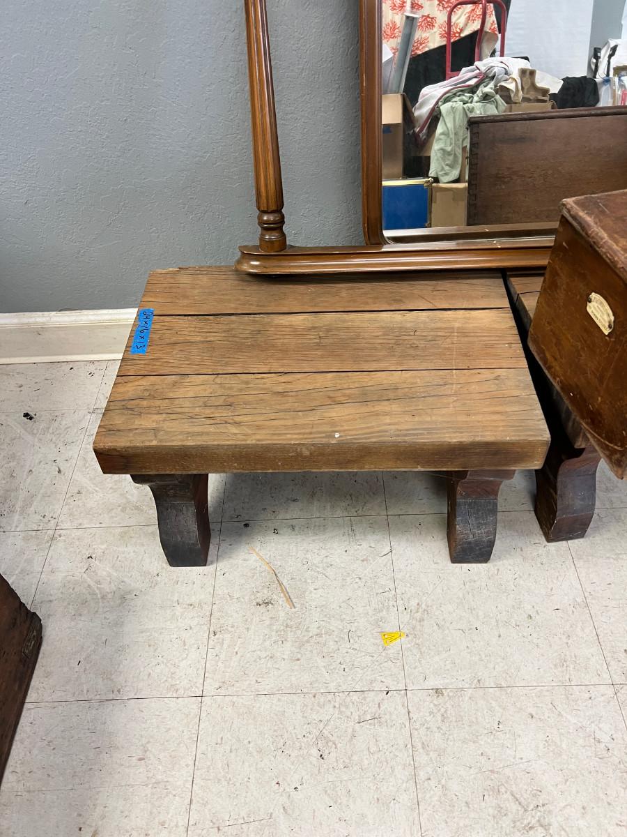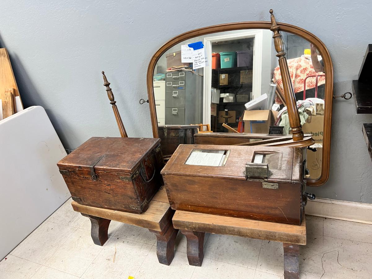 2 handmade benches (sturdy). Mirror is the kind that attaches to a dresser and there is a stand that it can rotate on. The wooden box is missing hinges, the cash registrar has its paper work and is a real curiosity. Everything in this lot is very heavy so I don't recommend shipping.
