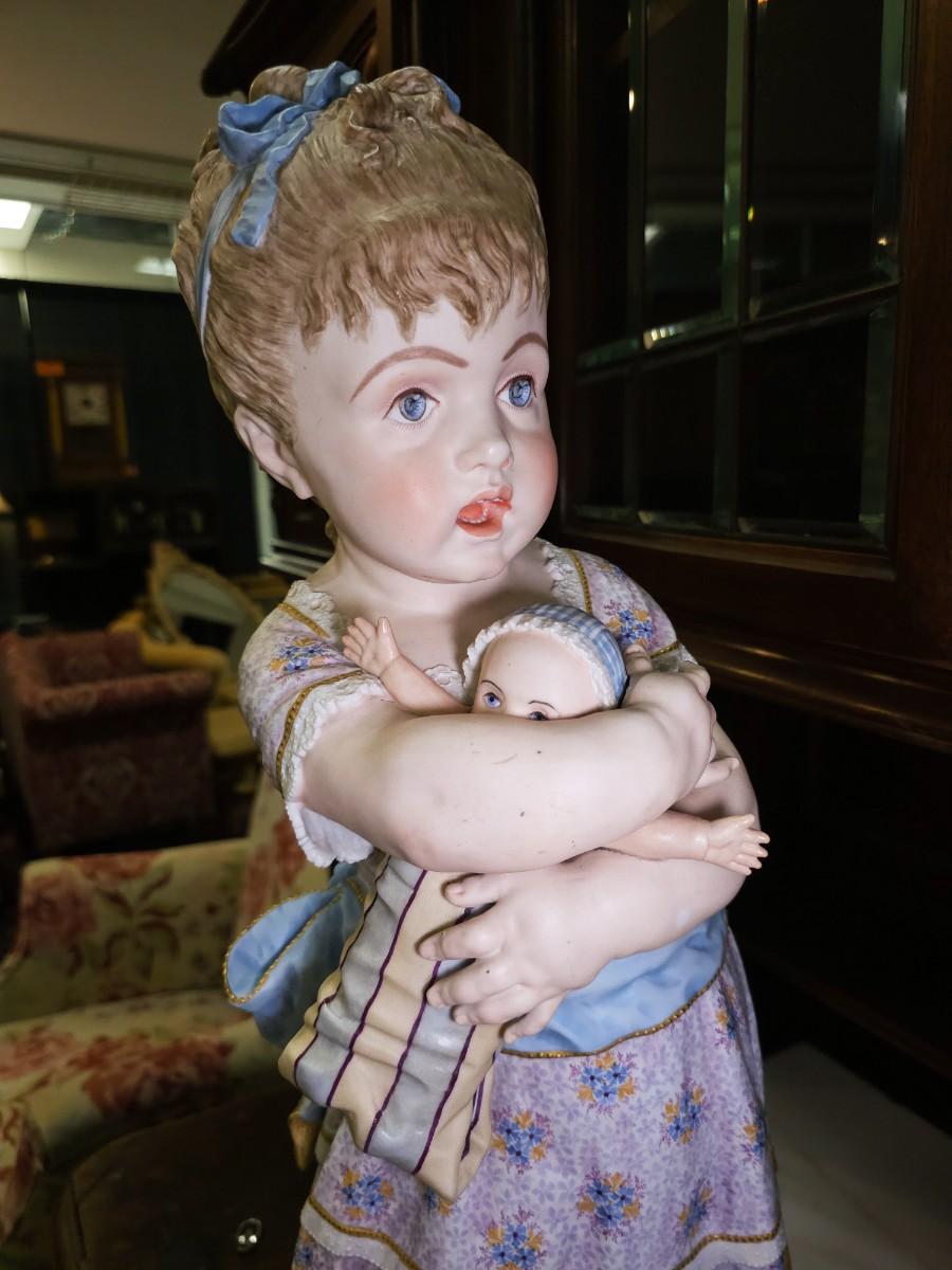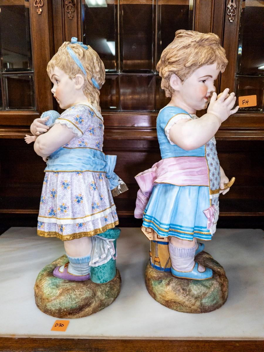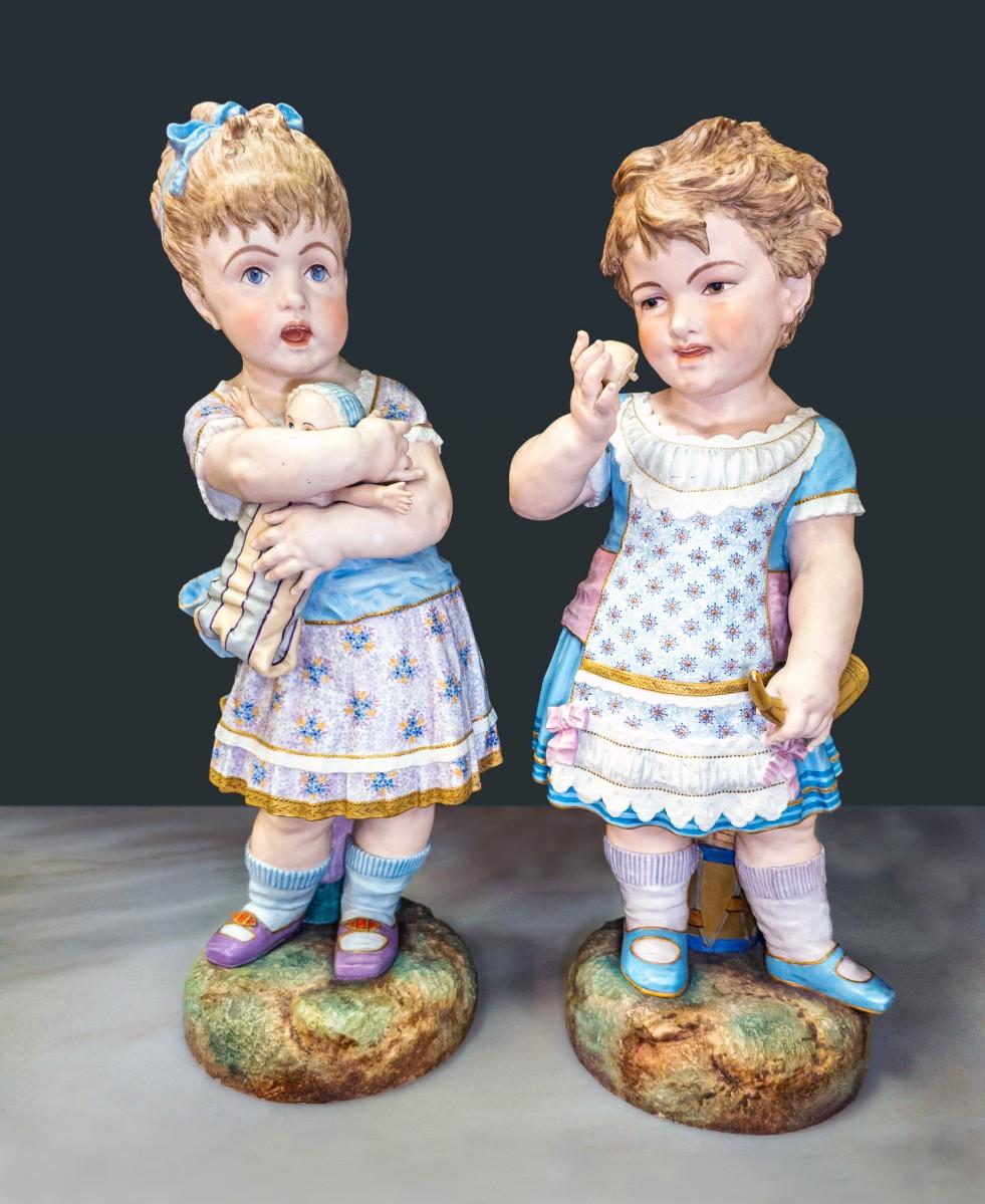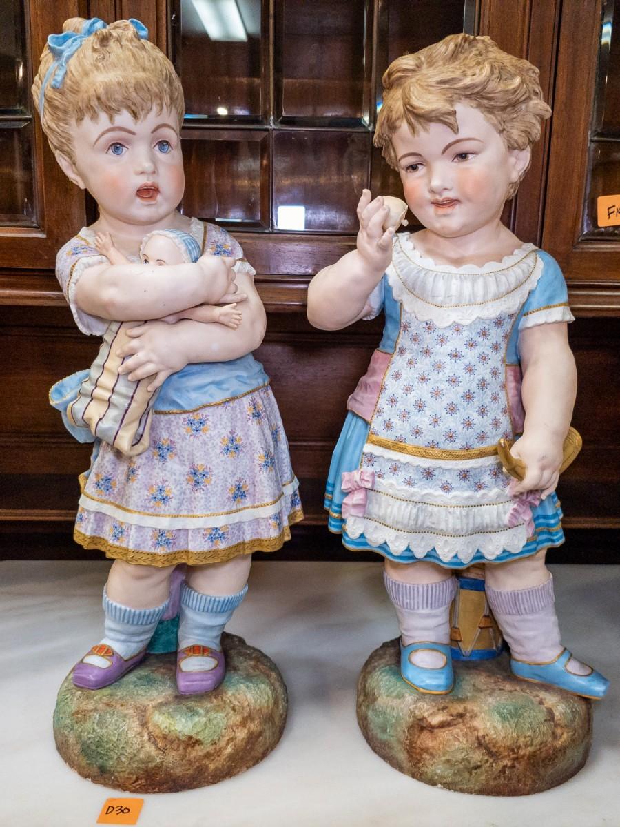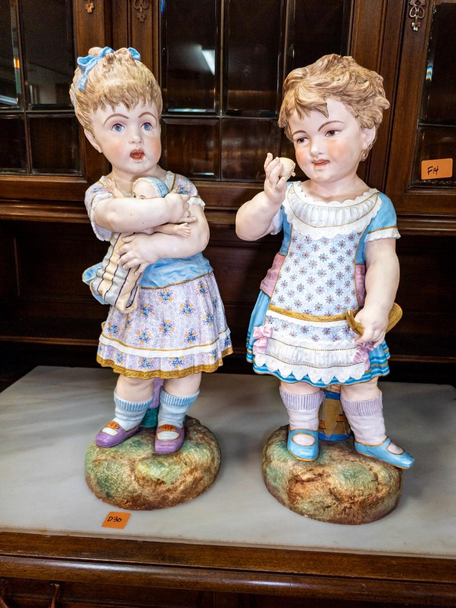 Life Size figures of two little girls, French Chantilly bisque, c. 1900, old repair visible, 10"W x 25"H