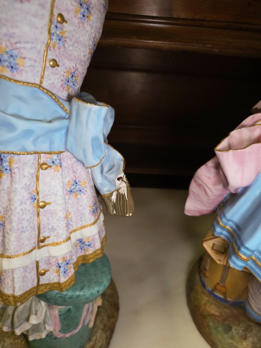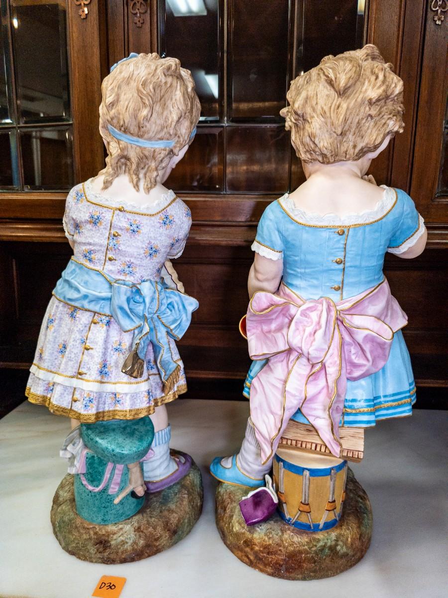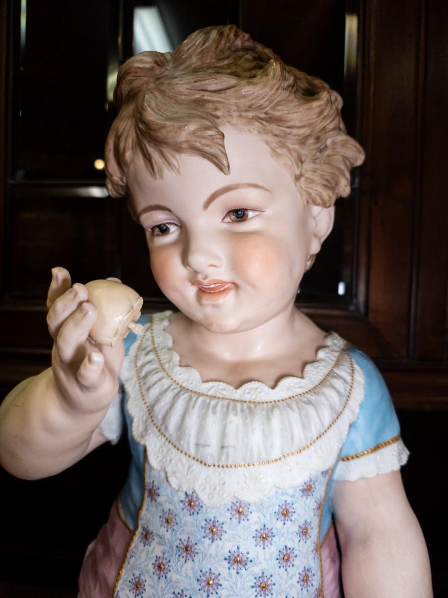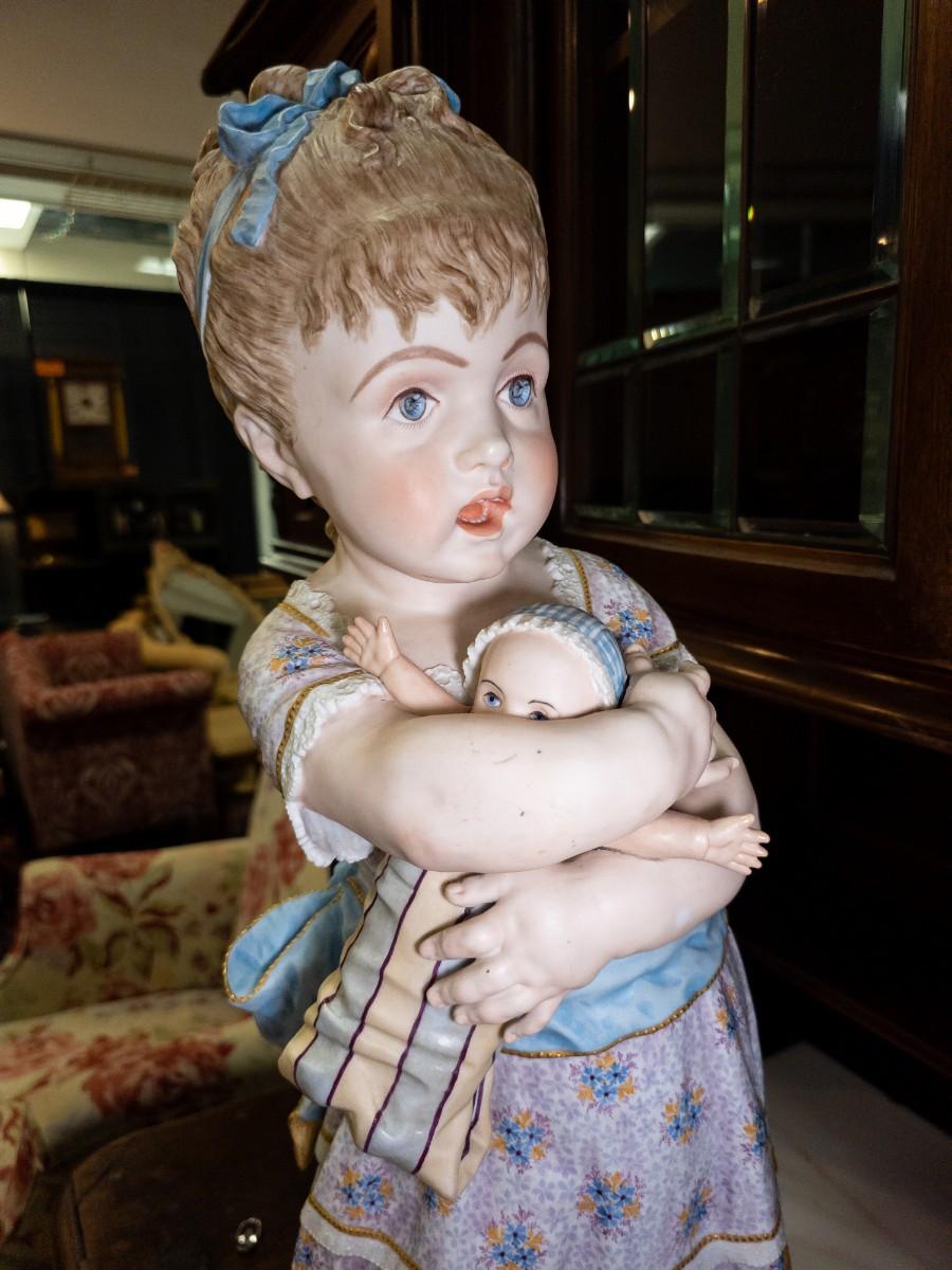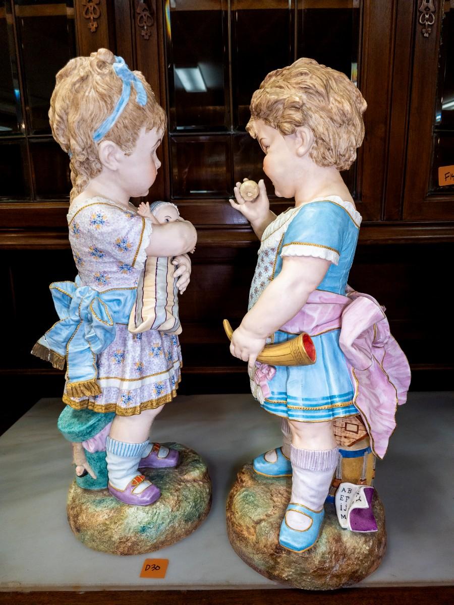 Life Size figures of two little girls, French Chantilly bisque, c. 1900, old repair visible, 10"W x 25"H