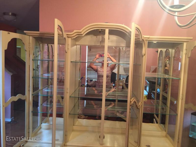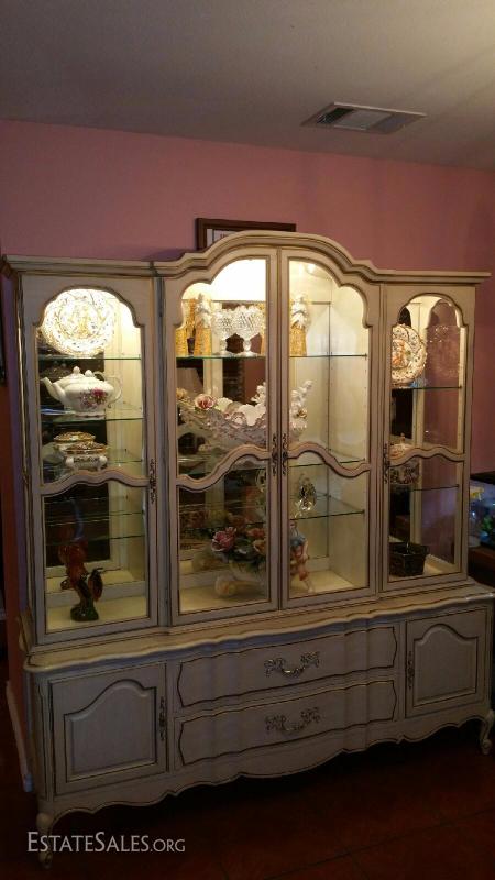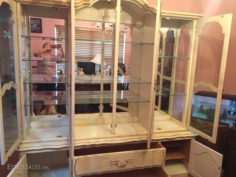 * Antique Versailles Traditional Dining China Cabinet : French Country Style. Of White Solid Pine Wood. Distressed painting. Lighted.