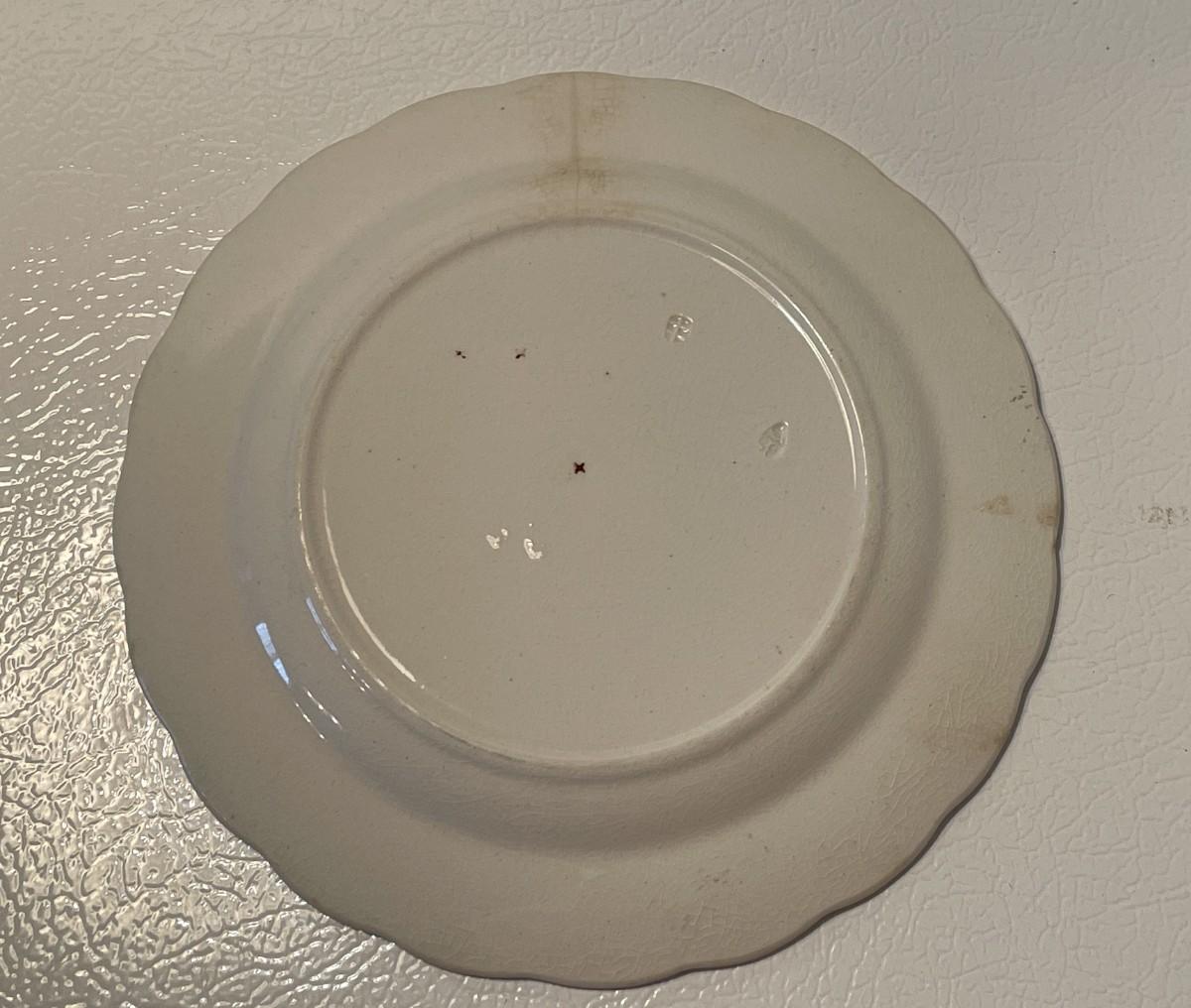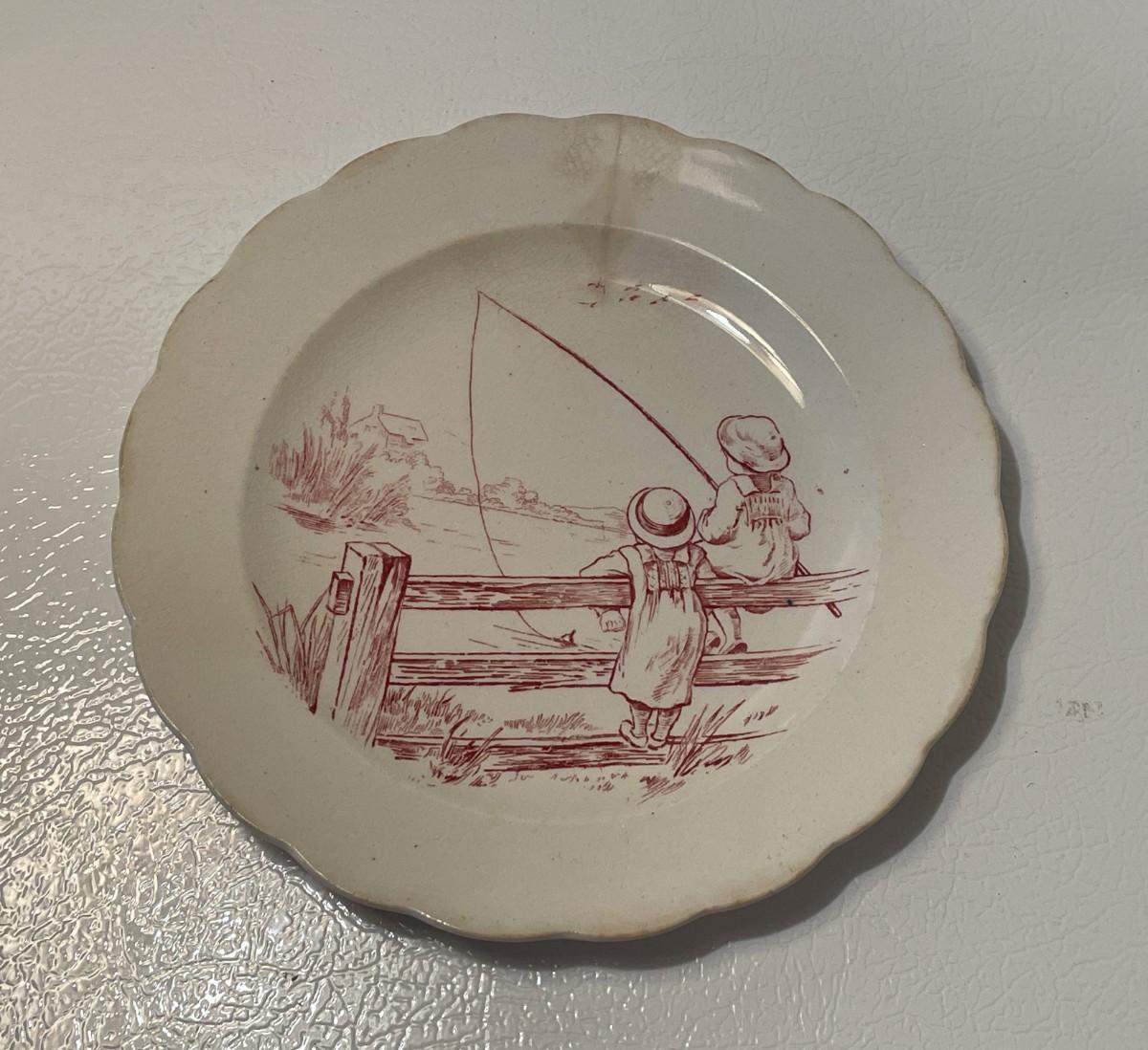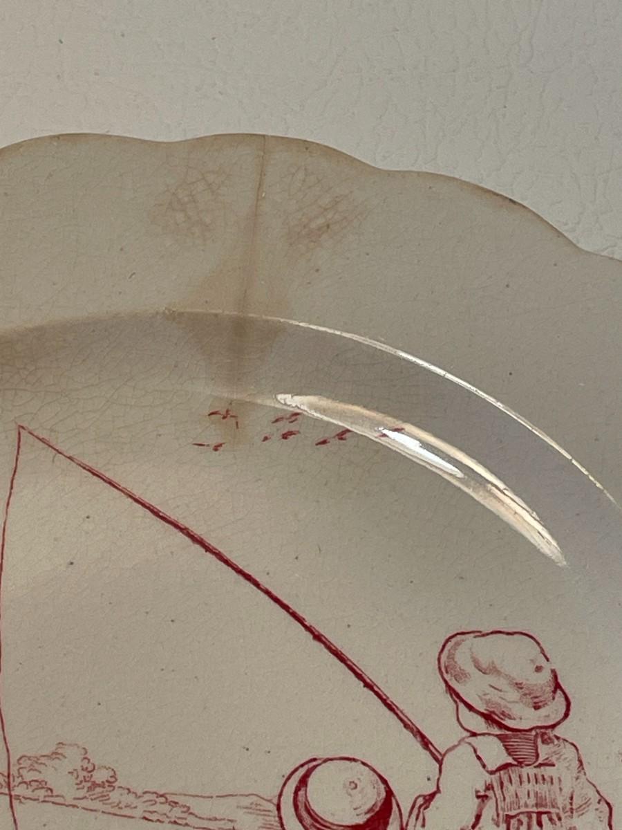 This plate is in very good condition excellent for the crack in the upper rim. It is about 6.75 inches in diameter and is red transfer onto the plate.