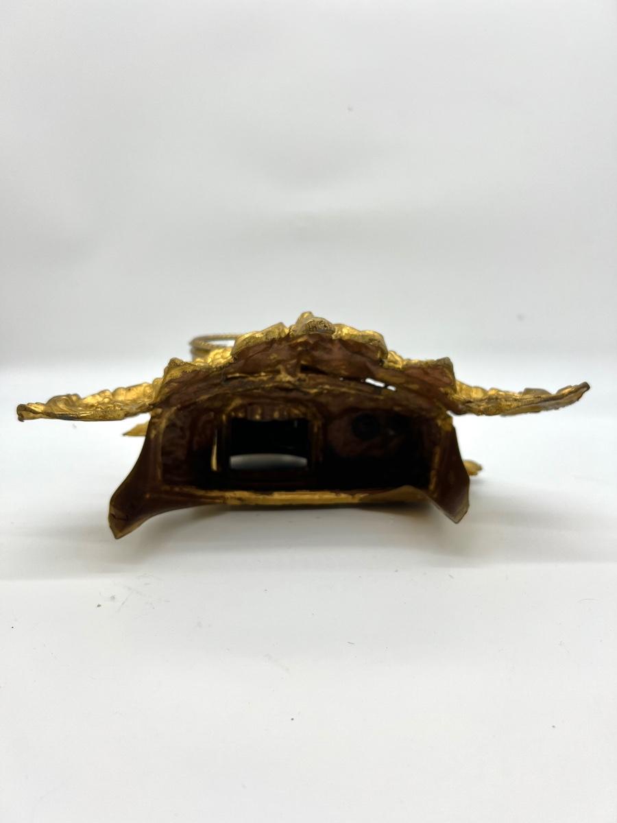Extraordinary Clock! Measures 10 1/2 inches tall, 10 1/2 inches wide and approximately 4 inches deep This clock is not in working condition and being sold as a decorative mantle clock with no key and the front glass is missing. The top has been repaired before, Please see the close up pictures.