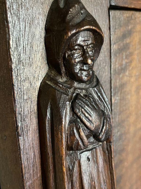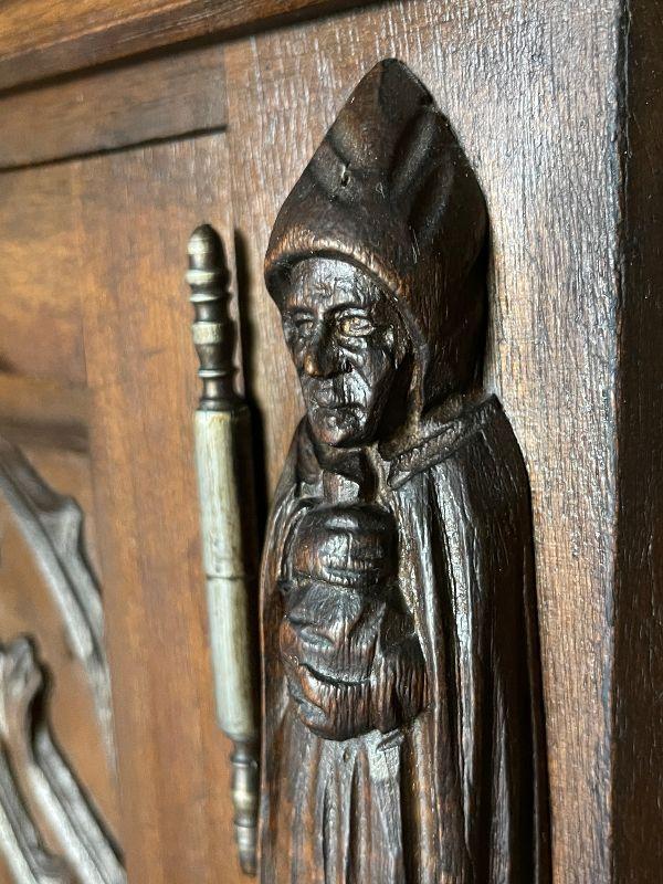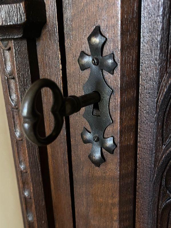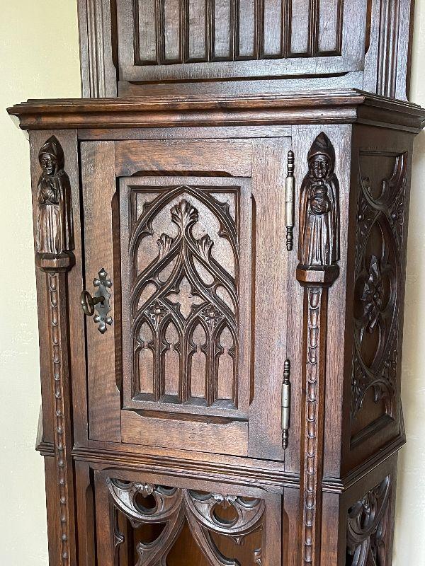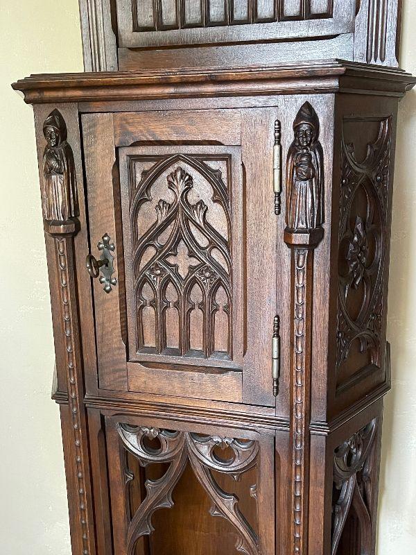 The subject item is a small, but outstanding antique French Gothic Revival Votive Cabinet of over-all carved oak with heavy applied figural moldings, gothic arch corner bracings, and panel carvings. The front of the cabinet is case is fronted with a small single door and retains the original iron escutcheon and key.