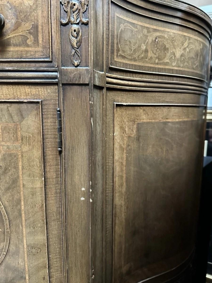 Condition Notes: In great antique condition with some scratch marks and one leg has a small crack on top and chip in wood. Slight crackling of the wood on the top of the cabinet where the "star" is. There is a slight musty odor when cabinet doors or drawers are open. Please see all photos.