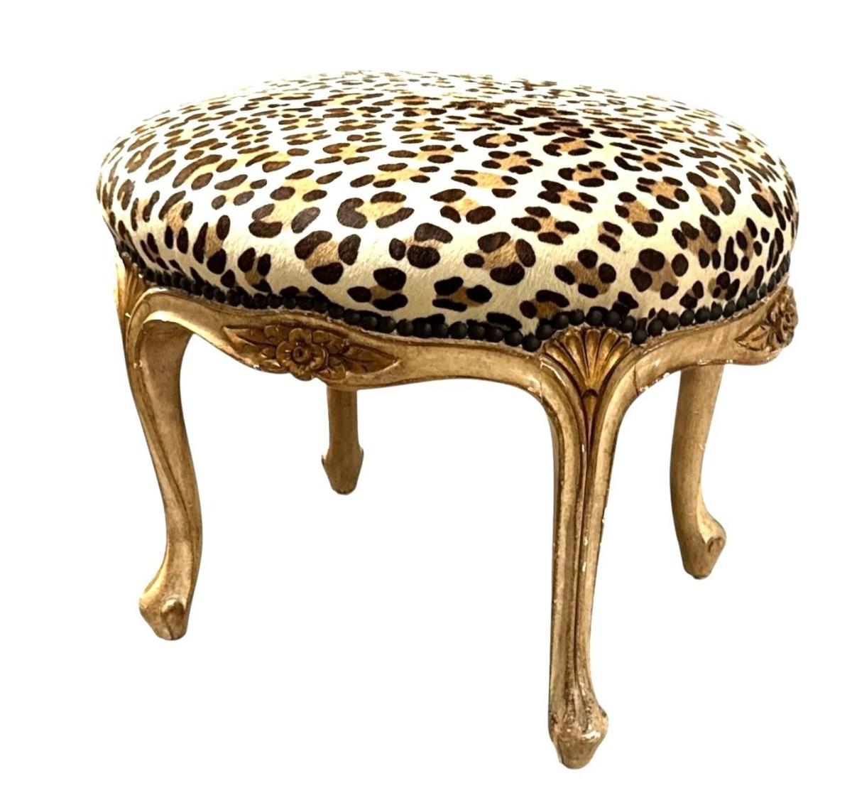 Antique French Louis XVI Leopard Print Animal Hide Seat with metal studs and carved flower Ottoman Foot Stool Seat