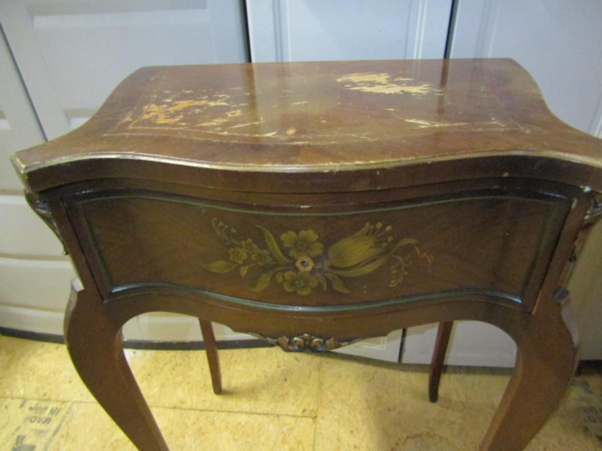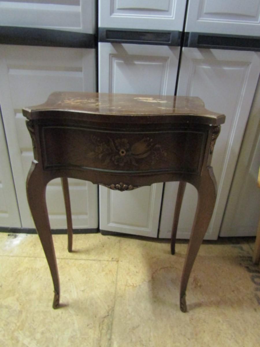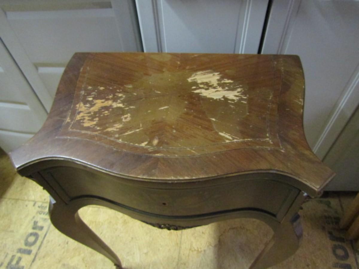 Antique French Louis XVI Inlay Single Drawer Table has some finish missing from surface as shown. Downstairs item