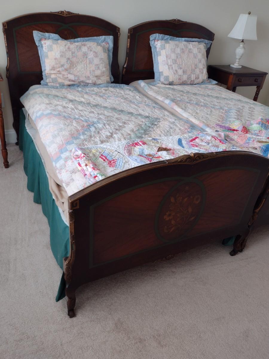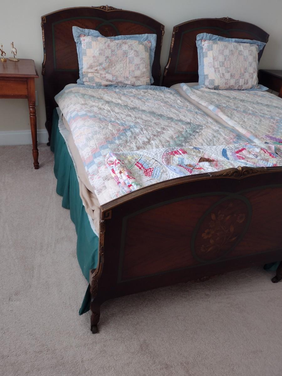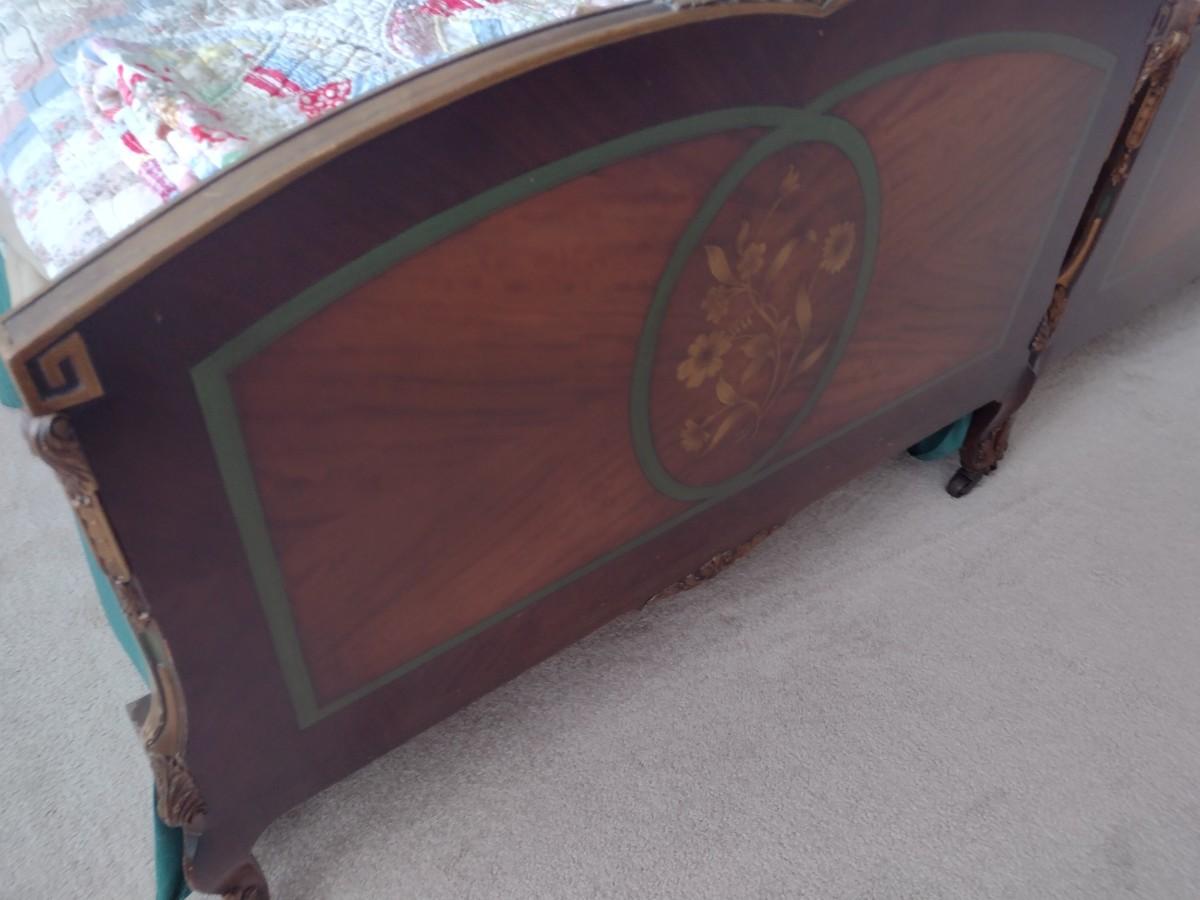 Antique French Napolean Inlay Mahogany Twin Bed with Mattress Set (Bedding Excluded) Choice B downstairs item. Bring tools to break down. Expect some scratches or wear