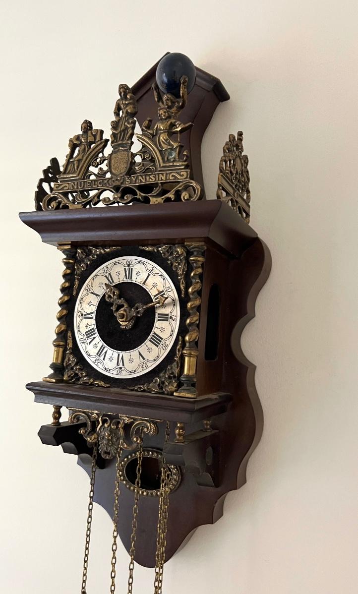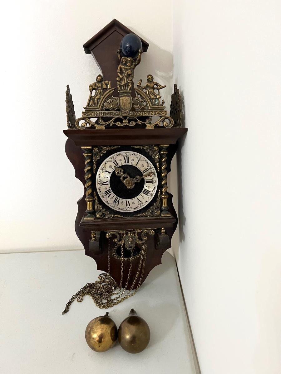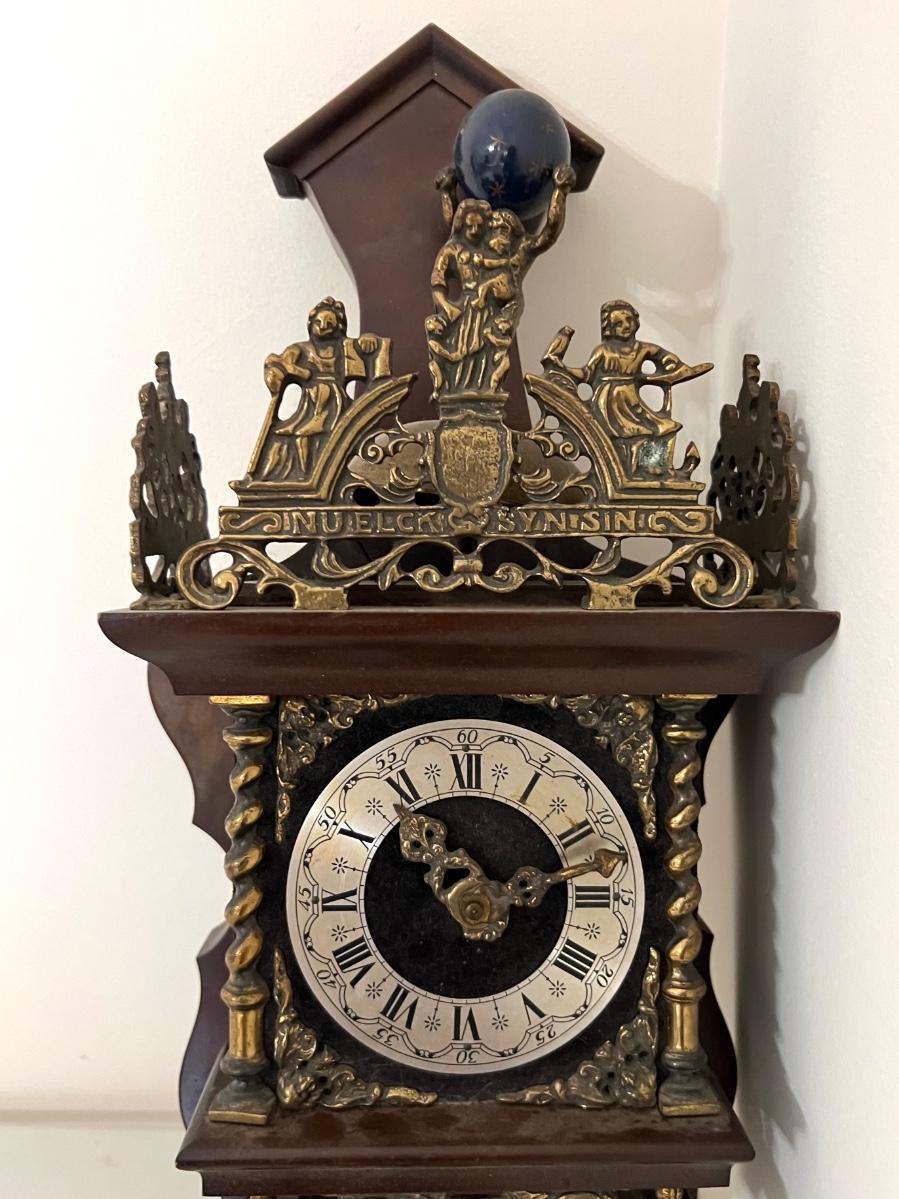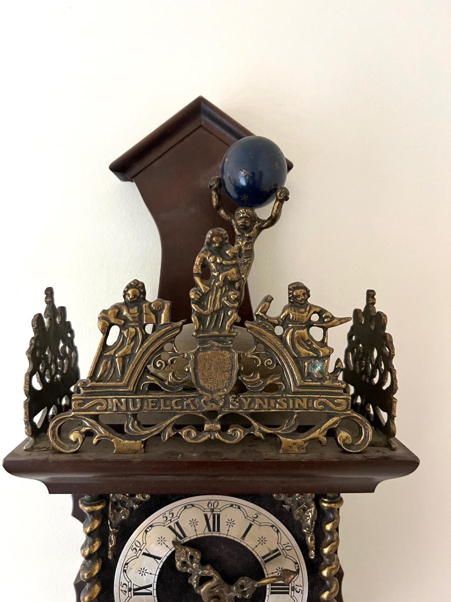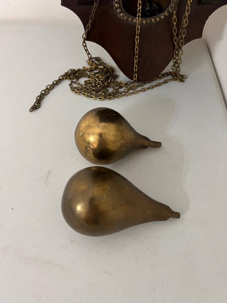Antique French Pediment Clock with Brass Hardware CLOCK 1960? HERMLE JUNGHANS ERA. Clock was not tested. Weights come with it but are not attached.