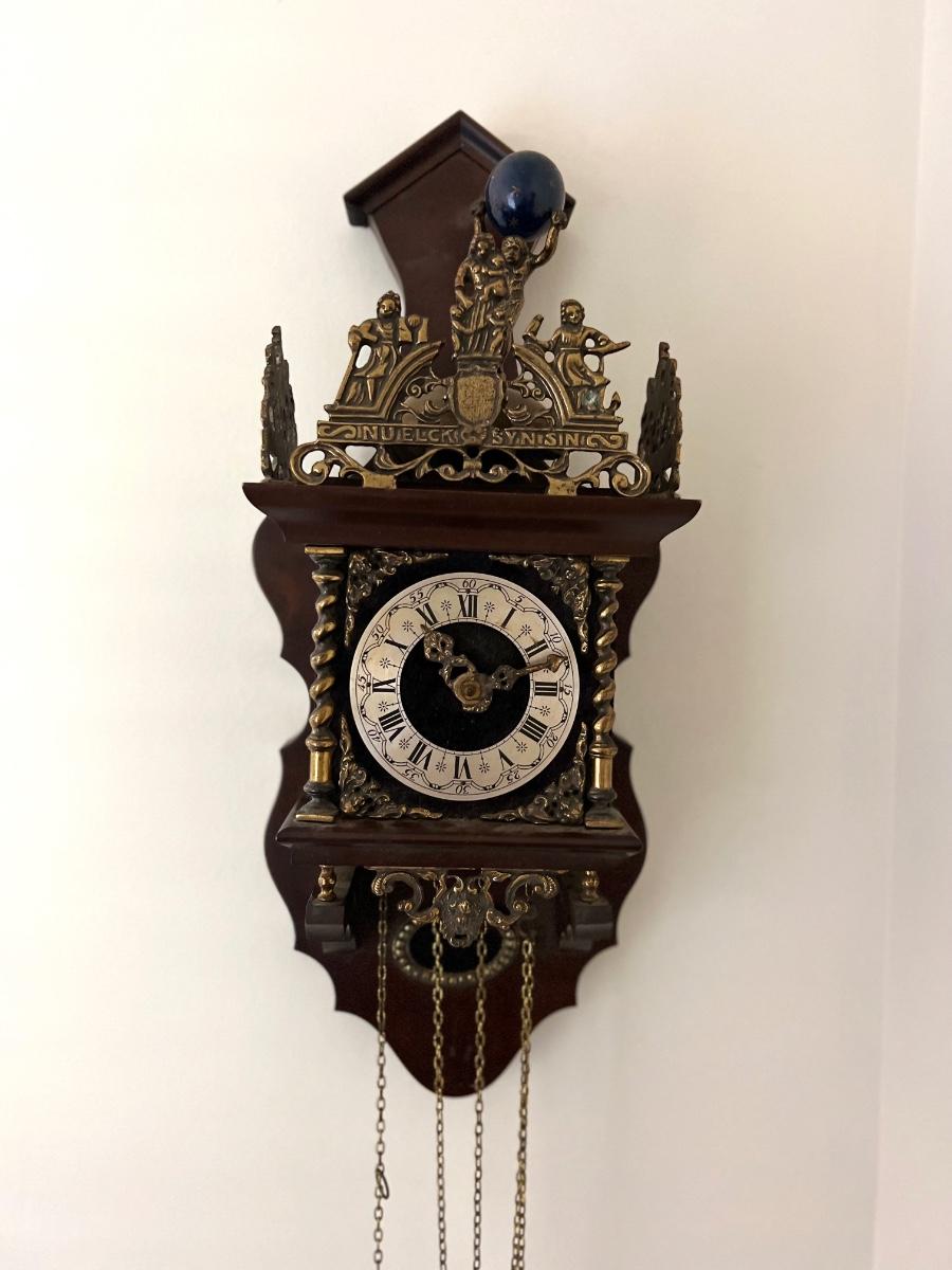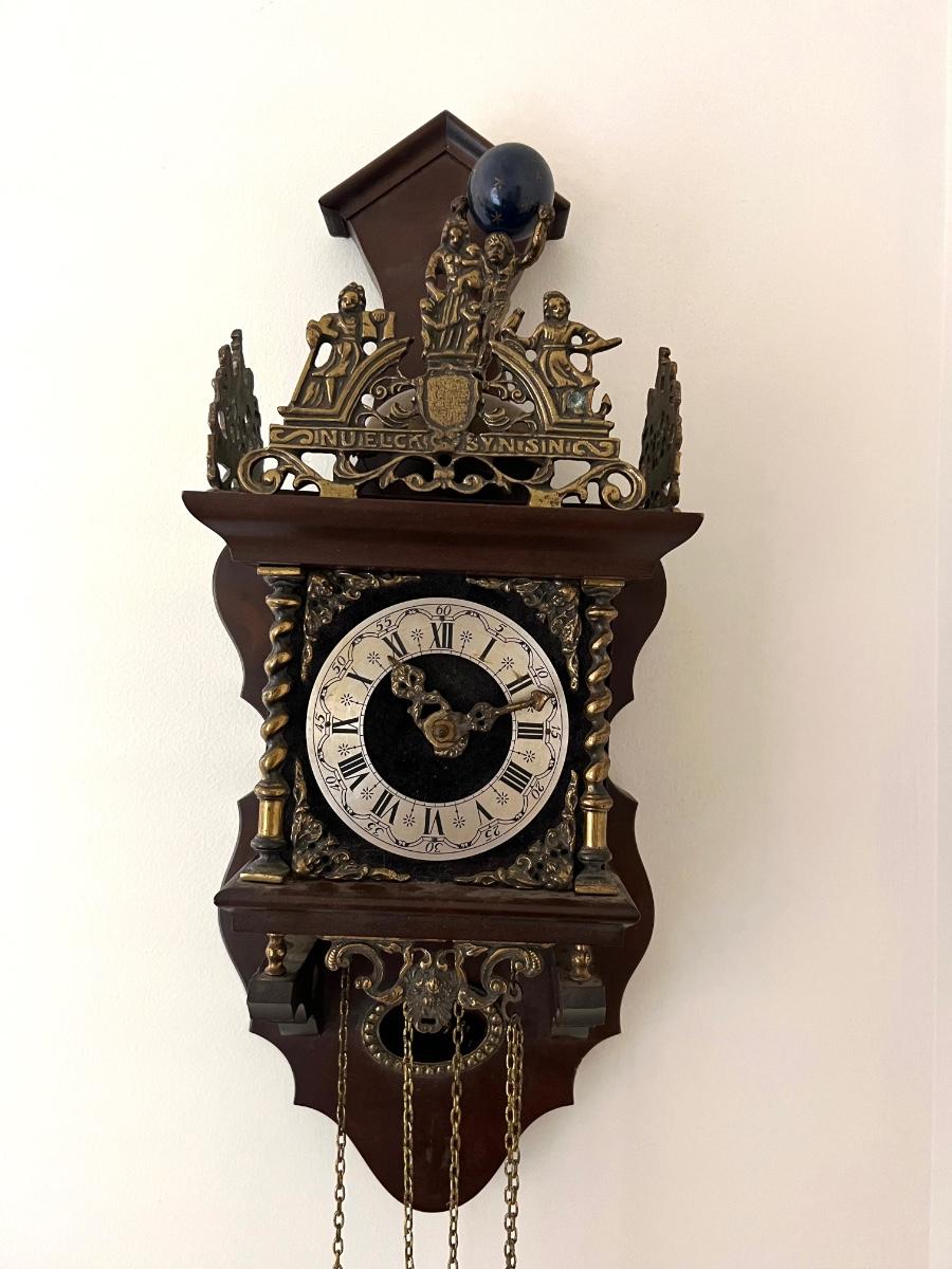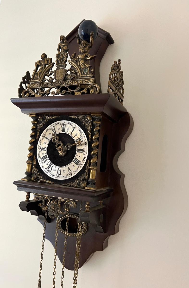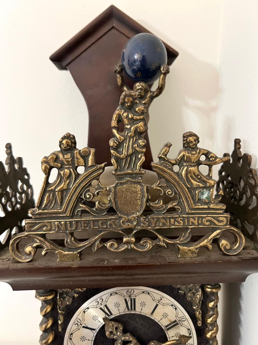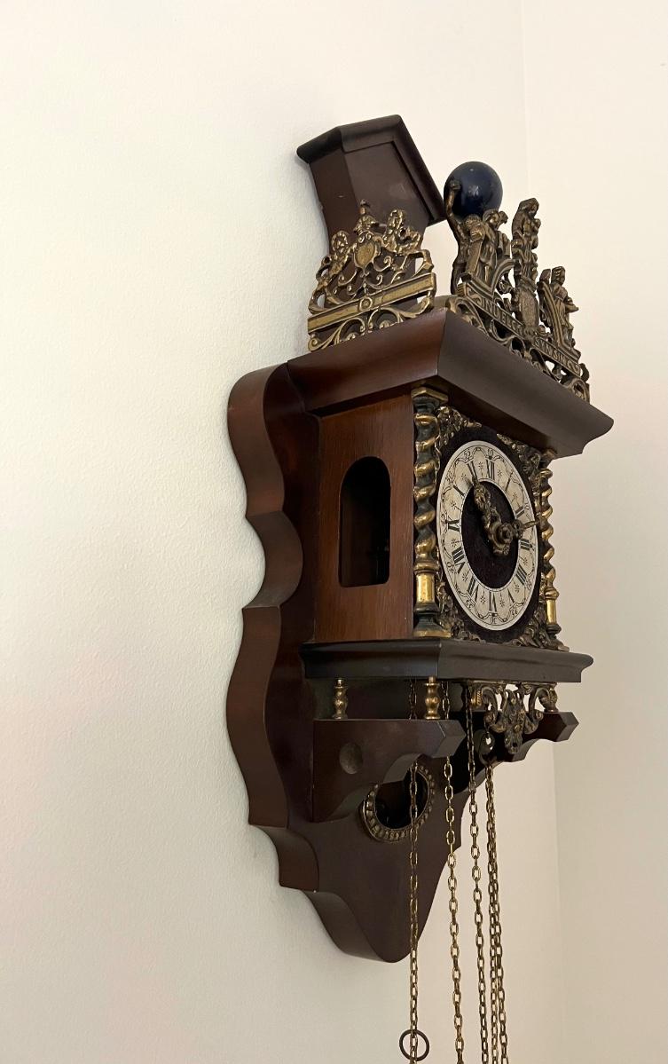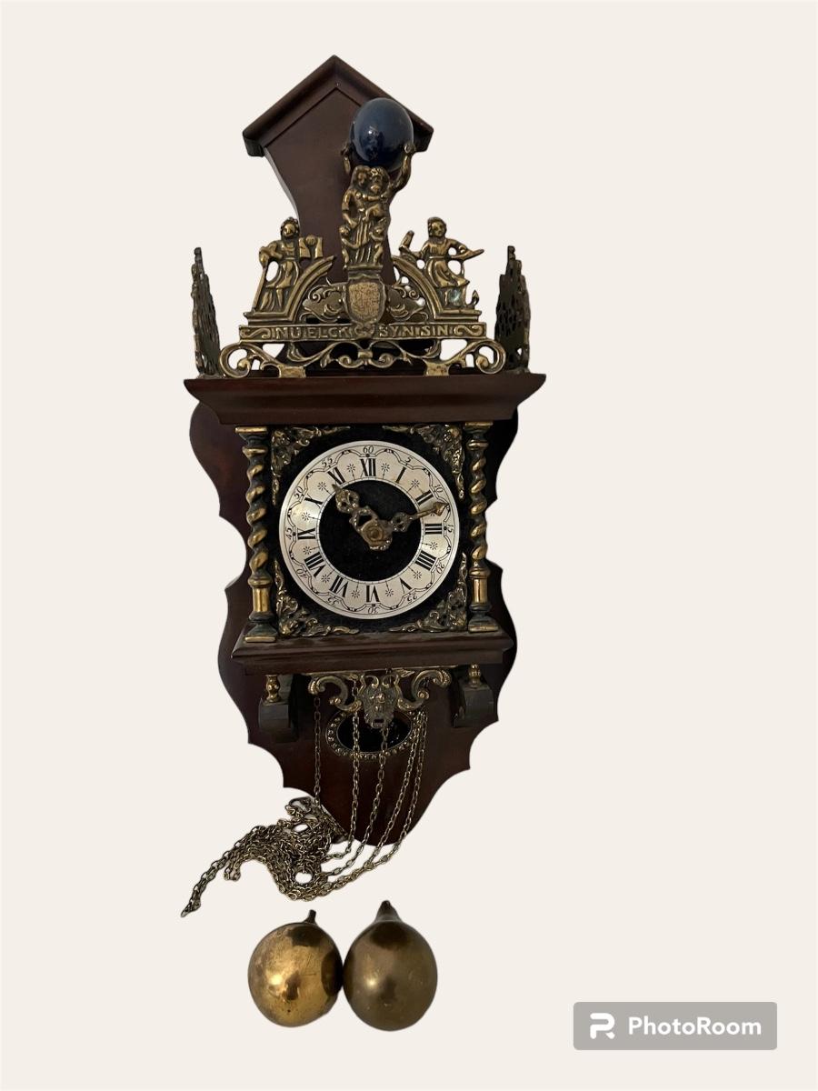 Antique French Pediment Clock with Brass Hardware CLOCK 1960? HERMLE JUNGHANS ERA. Clock was not tested. Weights come with it but are not attached.