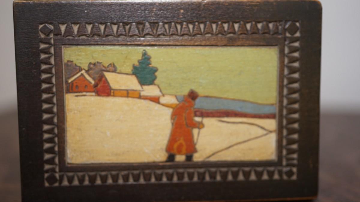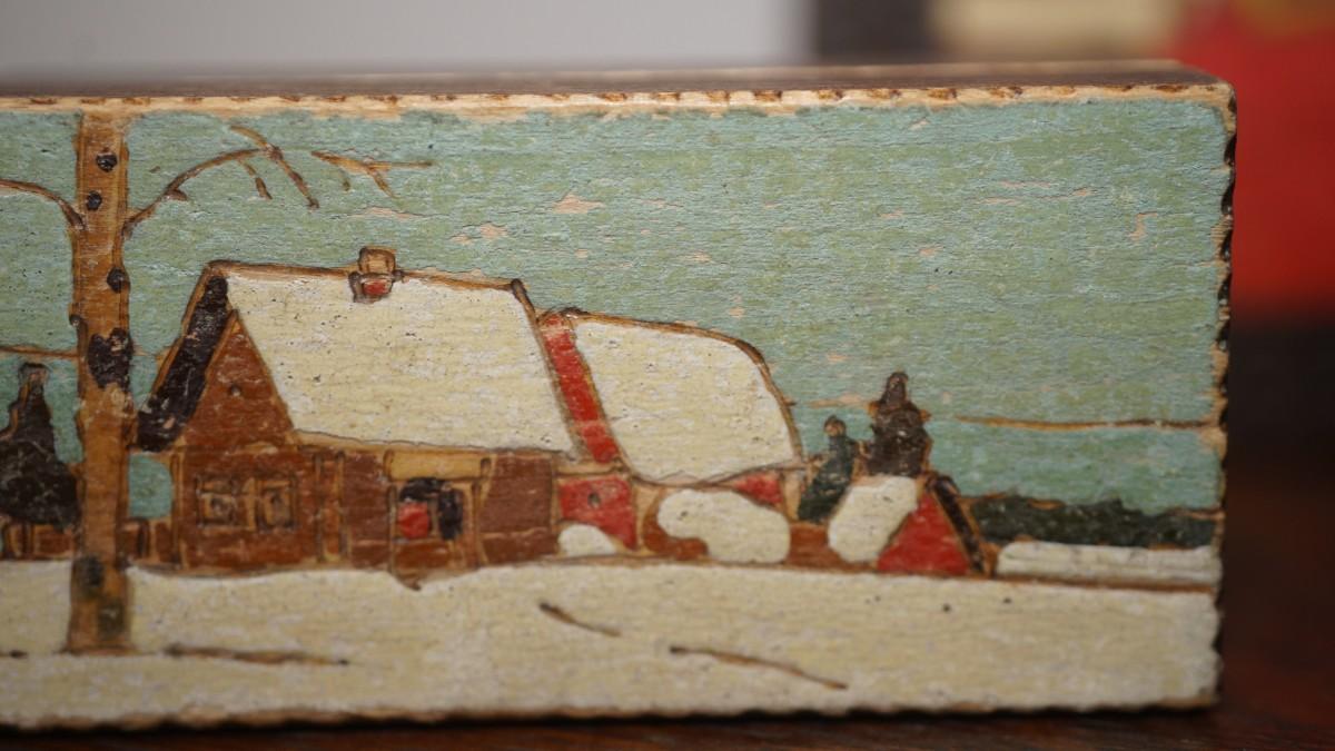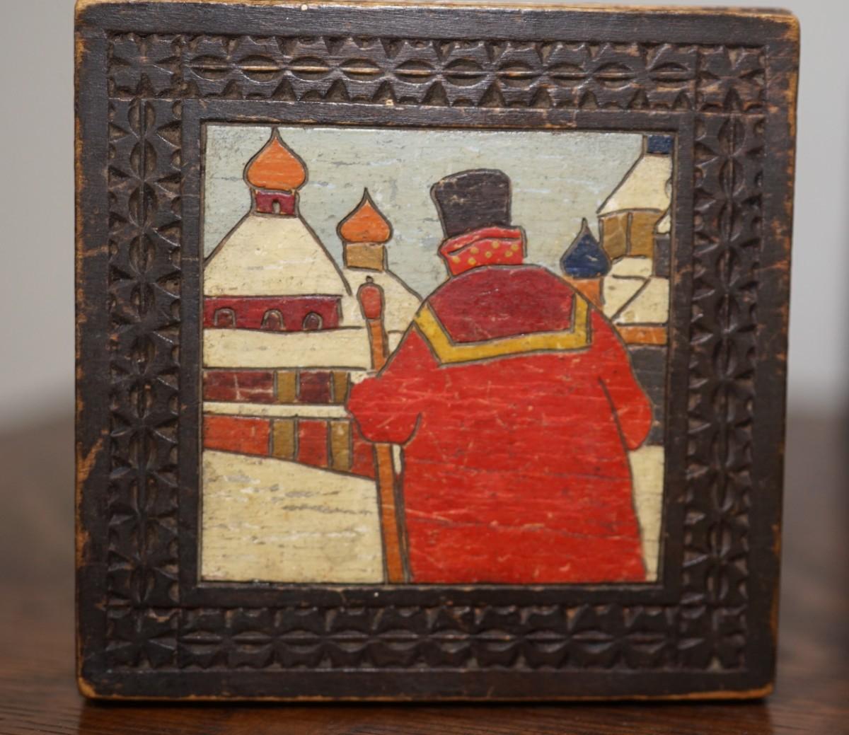 ANTIQUE FROM RUSSIA FOUR WOODEN FOLK ART BOXES OF CARVED BOXES W/ HAND PAINTED WINTER SCENES