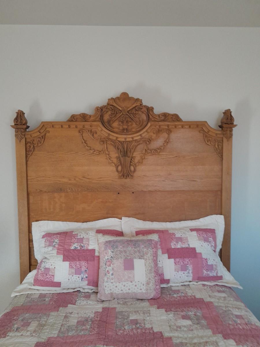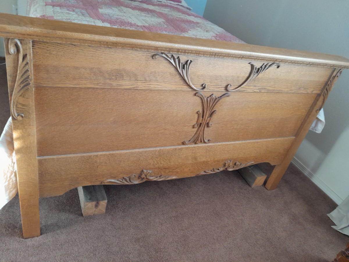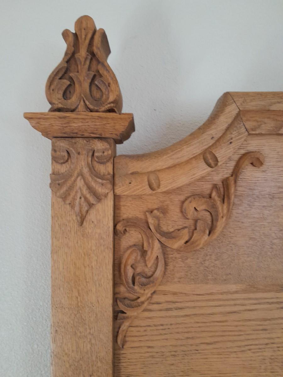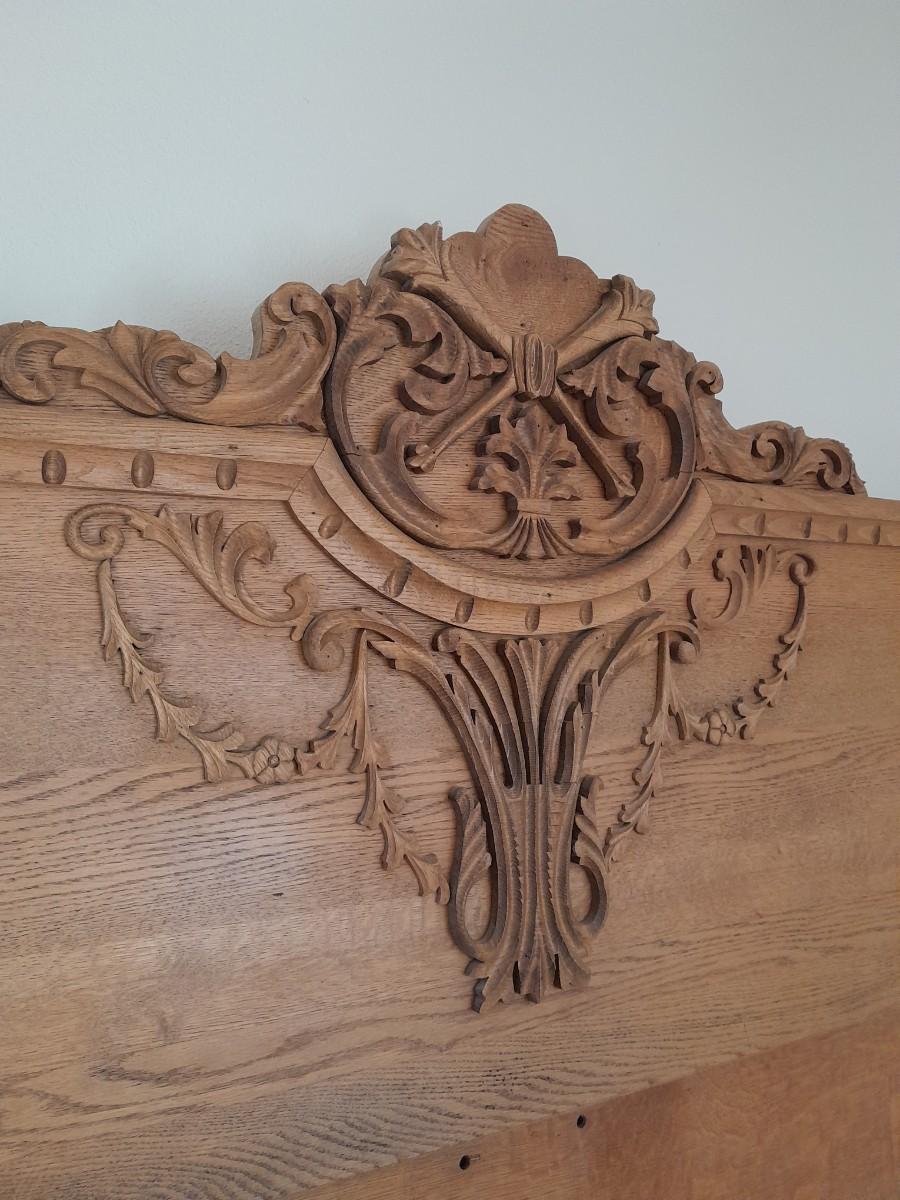 ORNATE WOOD CARVED HEADBOARD APPROXIMATELY 80" X 60" FOOTBOARD 34.5" X 60" THE HEADBOARD HAS 2 SMALL HOLES WHERE A BED LAMP USED TO BE MOUNTED.
