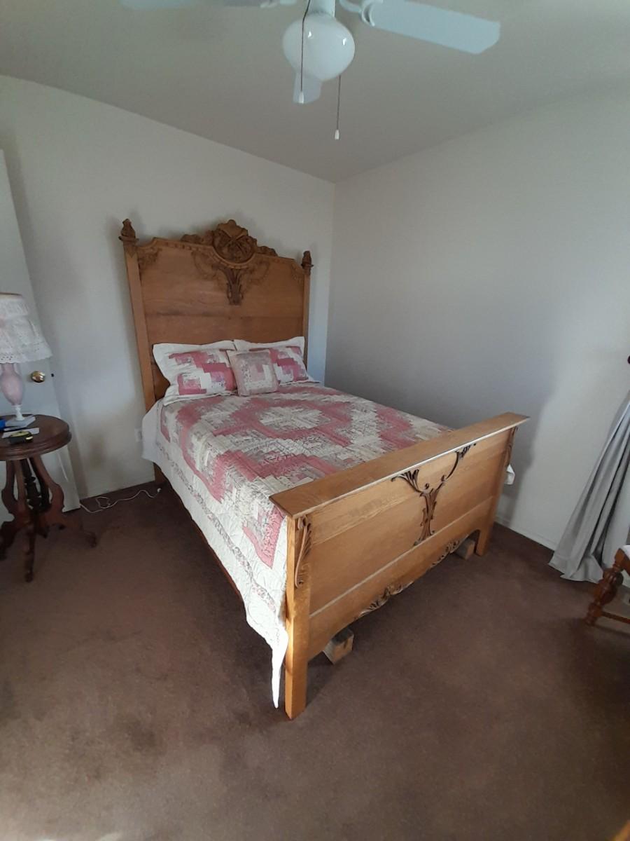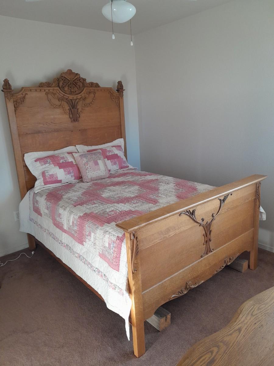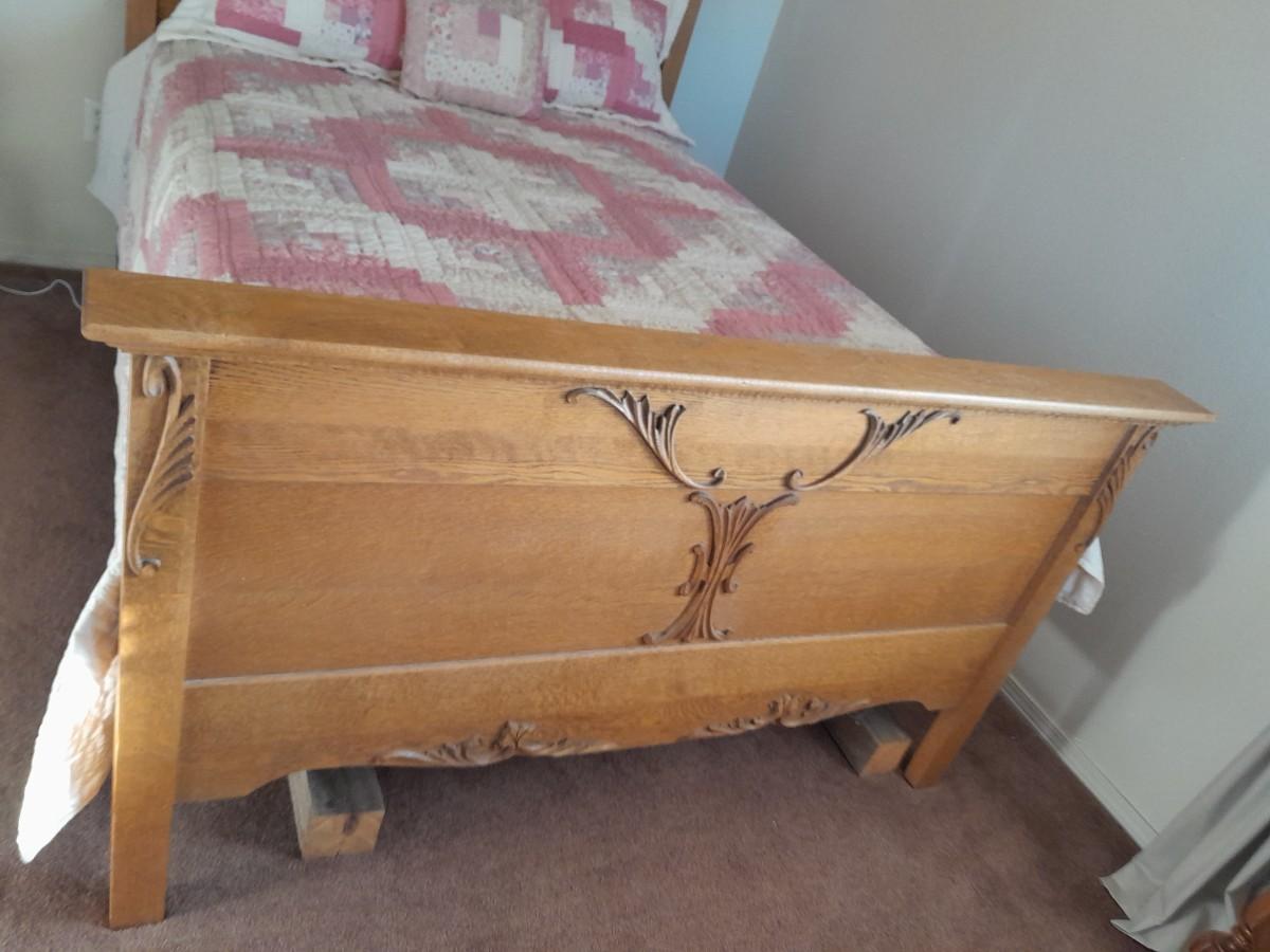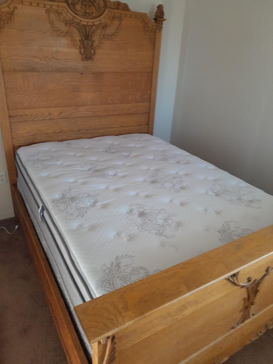 ORNATE WOOD CARVED HEADBOARD APPROXIMATELY 80" X 60" FOOTBOARD 34.5" X 60" THE HEADBOARD HAS 2 SMALL HOLES WHERE A BED LAMP USED TO BE MOUNTED.