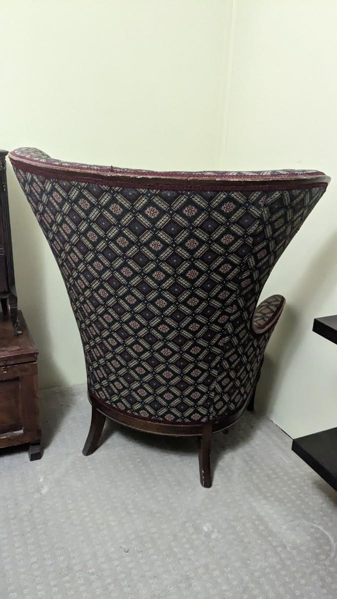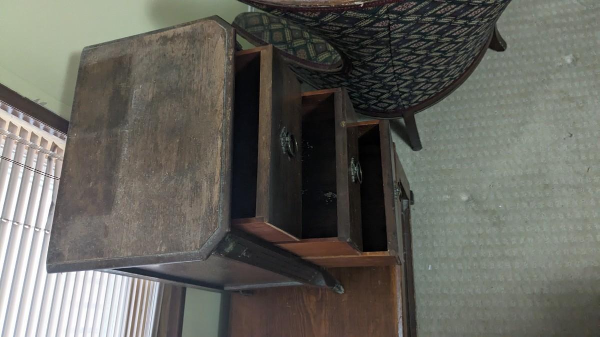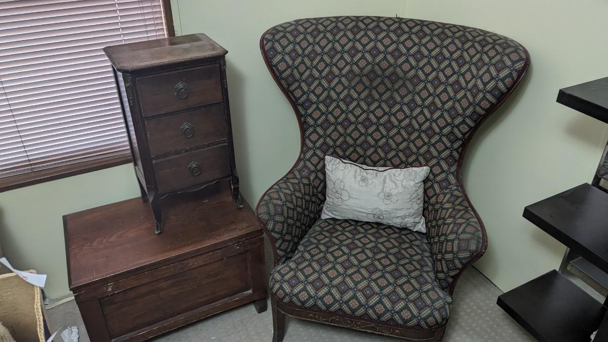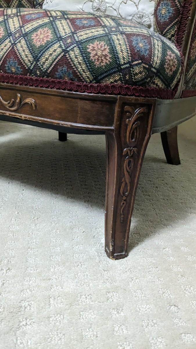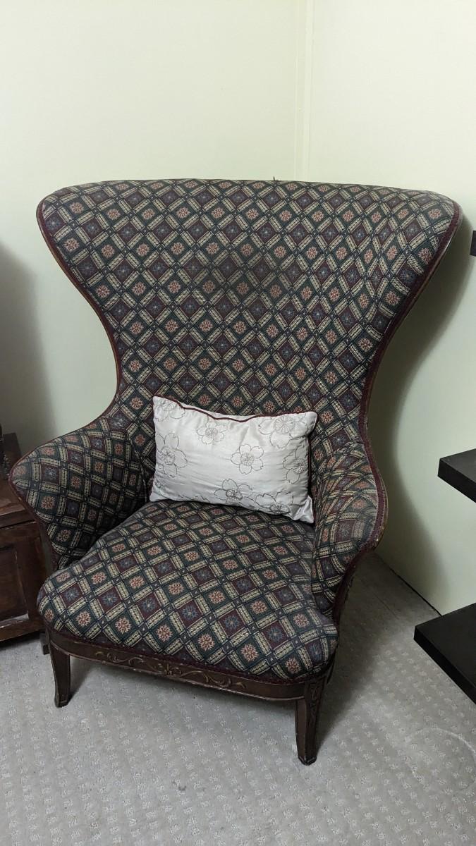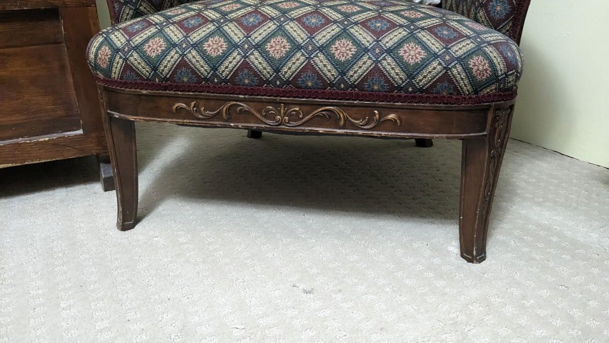 includes a stunning and ridiculously comfortable 37"x 21"x 42" wood frame wingback chair with hand carved embellishments where seat meets feet, seat sits14" from ground, with a lovely jewel tone upholstery job. Also includes a very nice mission style solid wood 26.75"x 17.25"x 17" storage chest, and a beautiful 10 5/8"x14.25"x 25" (3) drawer parlor table with stunning embellishments. Wear found to each piece, nothing that is structural-all cosmetic. No shipping. Winning bidder responsible for removal of all pieces. bdrm1